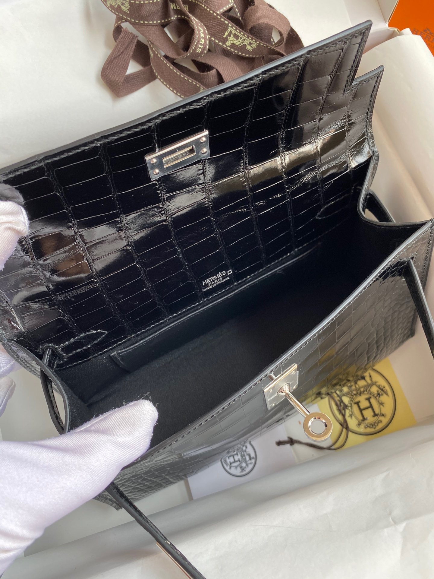 Hermes Kelly Pochette Handmade Bag In Black Shiny Alligator Leather