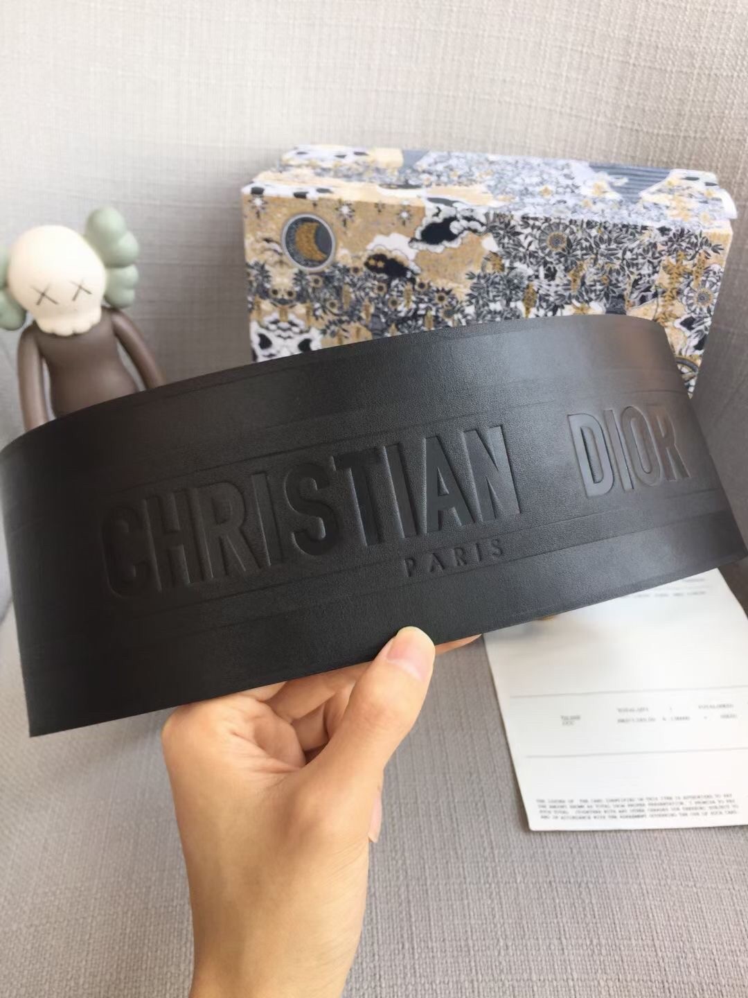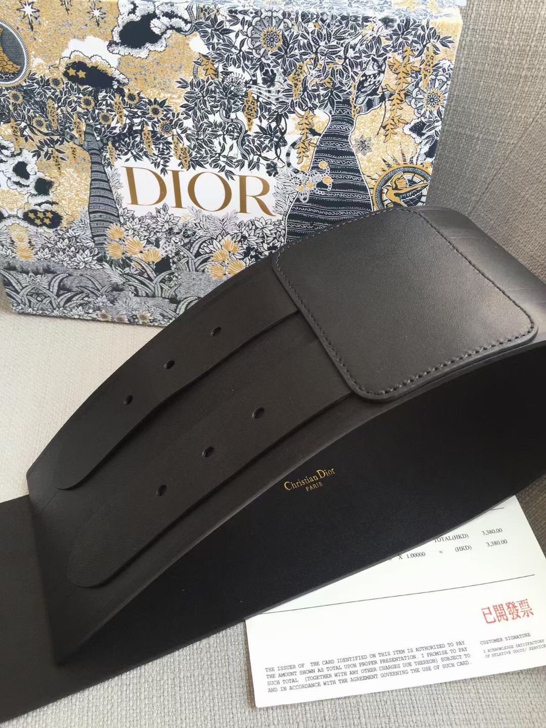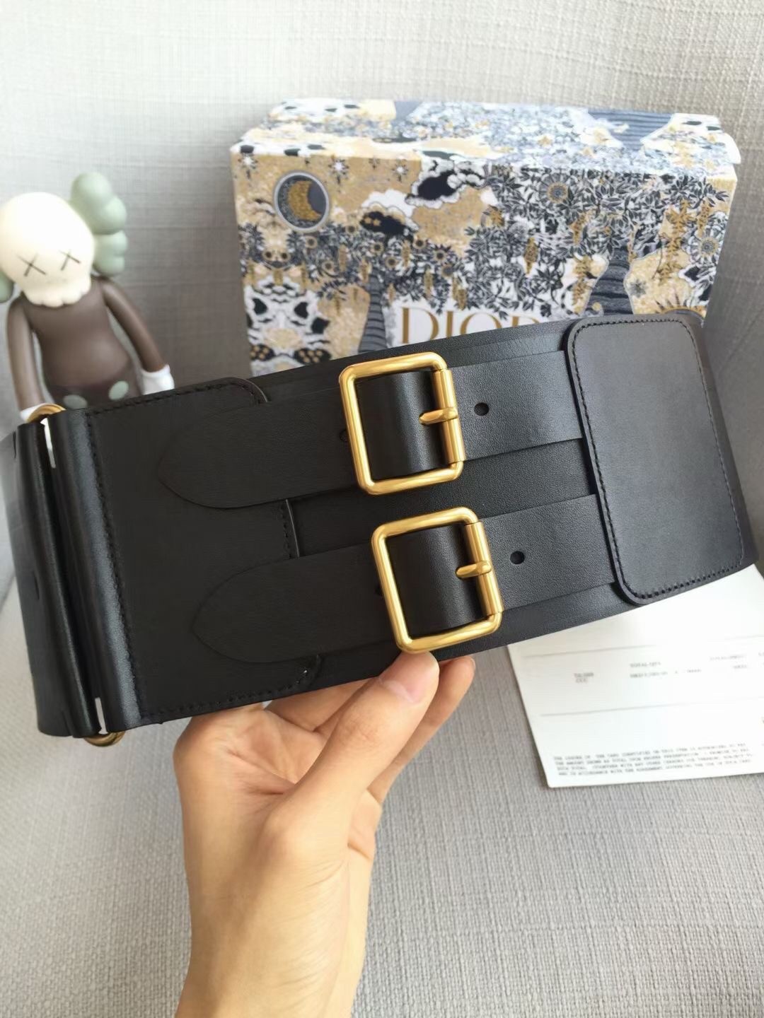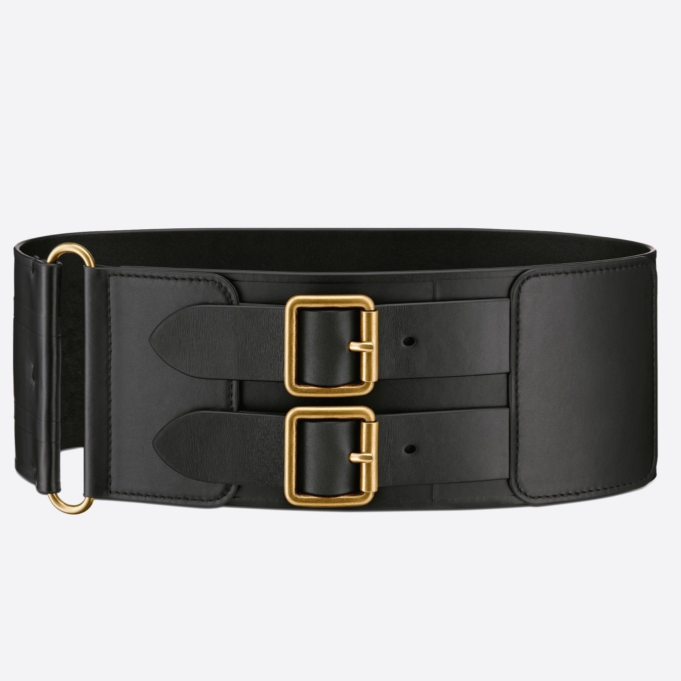 The D-Waist belt puts the spotlight on the 'Christian Dior' signature, with embossing on the back, using the same craftsmanship as with the iconic leather Dior Book Tote. Crafted in smooth black calfskin, it adjusts with two antique gold-finish metal rectangular buckles. The modern and elegant belt accentuates the waist and will elevate a skirt, dress or jacket look.