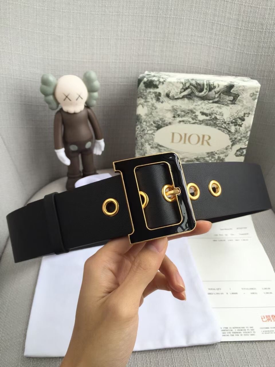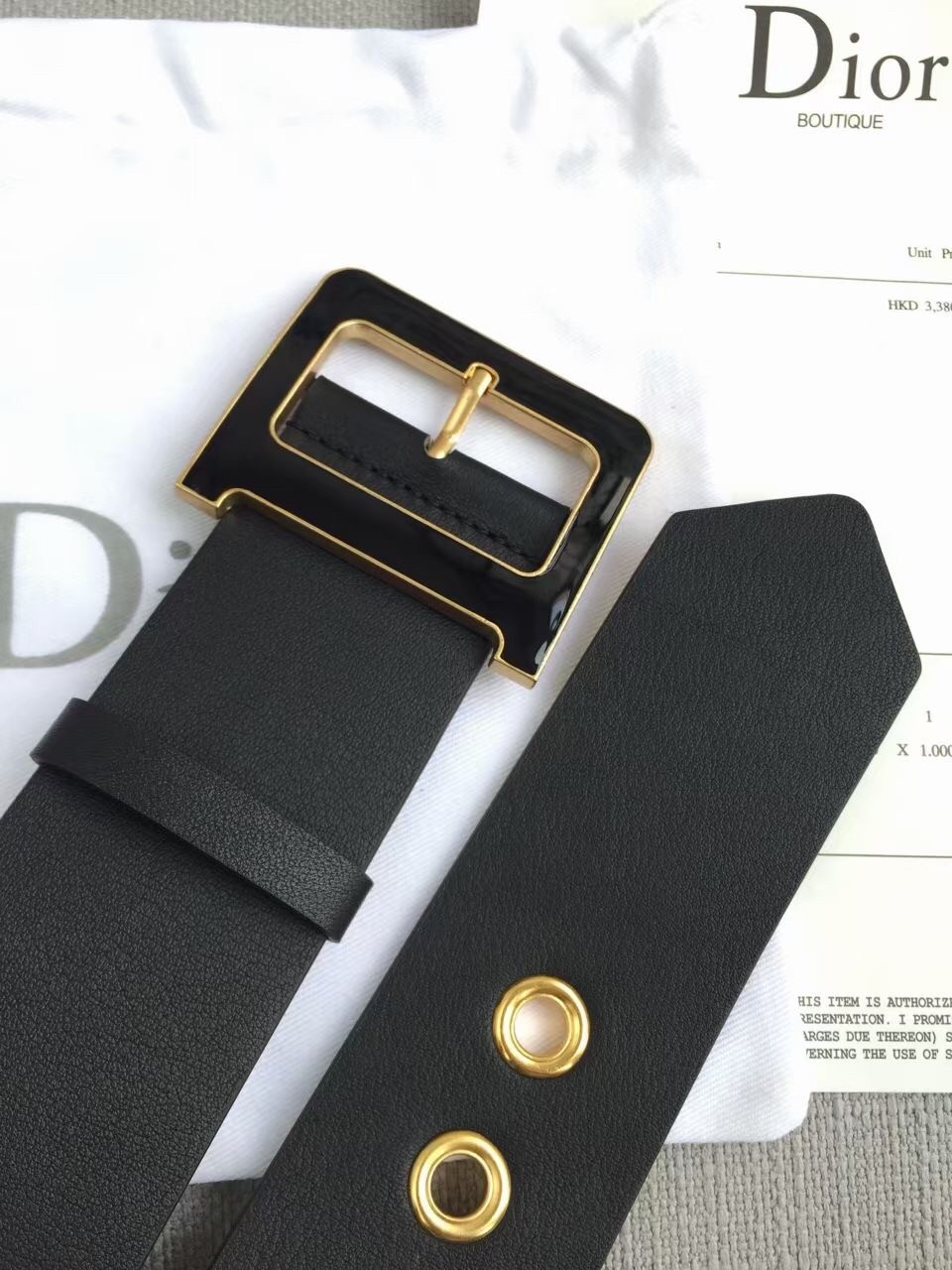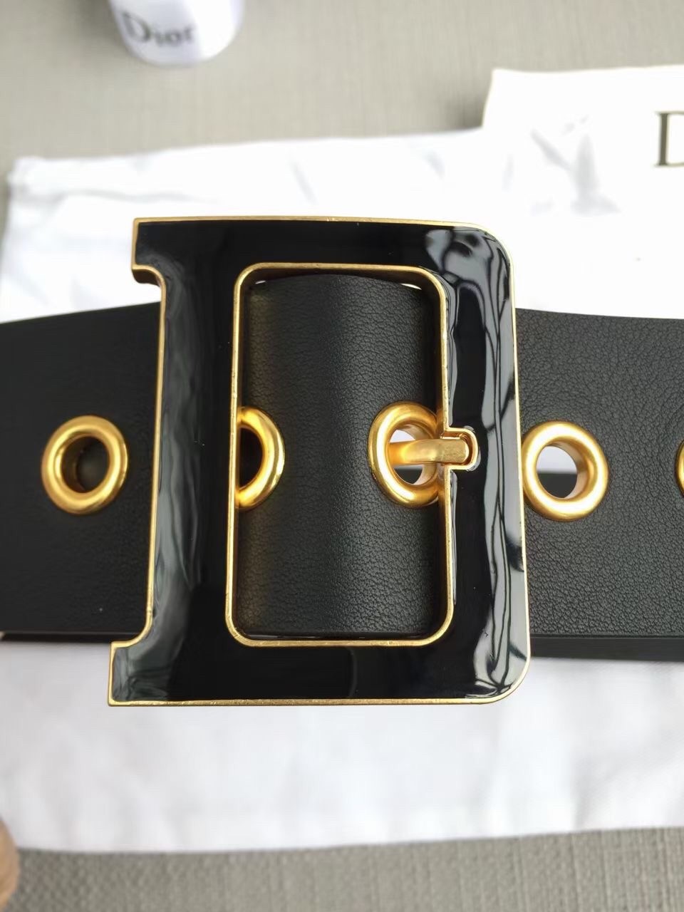 The Diorquake belt is crafted in black smooth calfskin and features the emblematic 'D' buckle in black enamel and gold-finish metal, showcasing a sophisticated look with its shiny finish. A refined style, its wide silhouette will highlight the waist and enhance a skirt, dress or jacket.