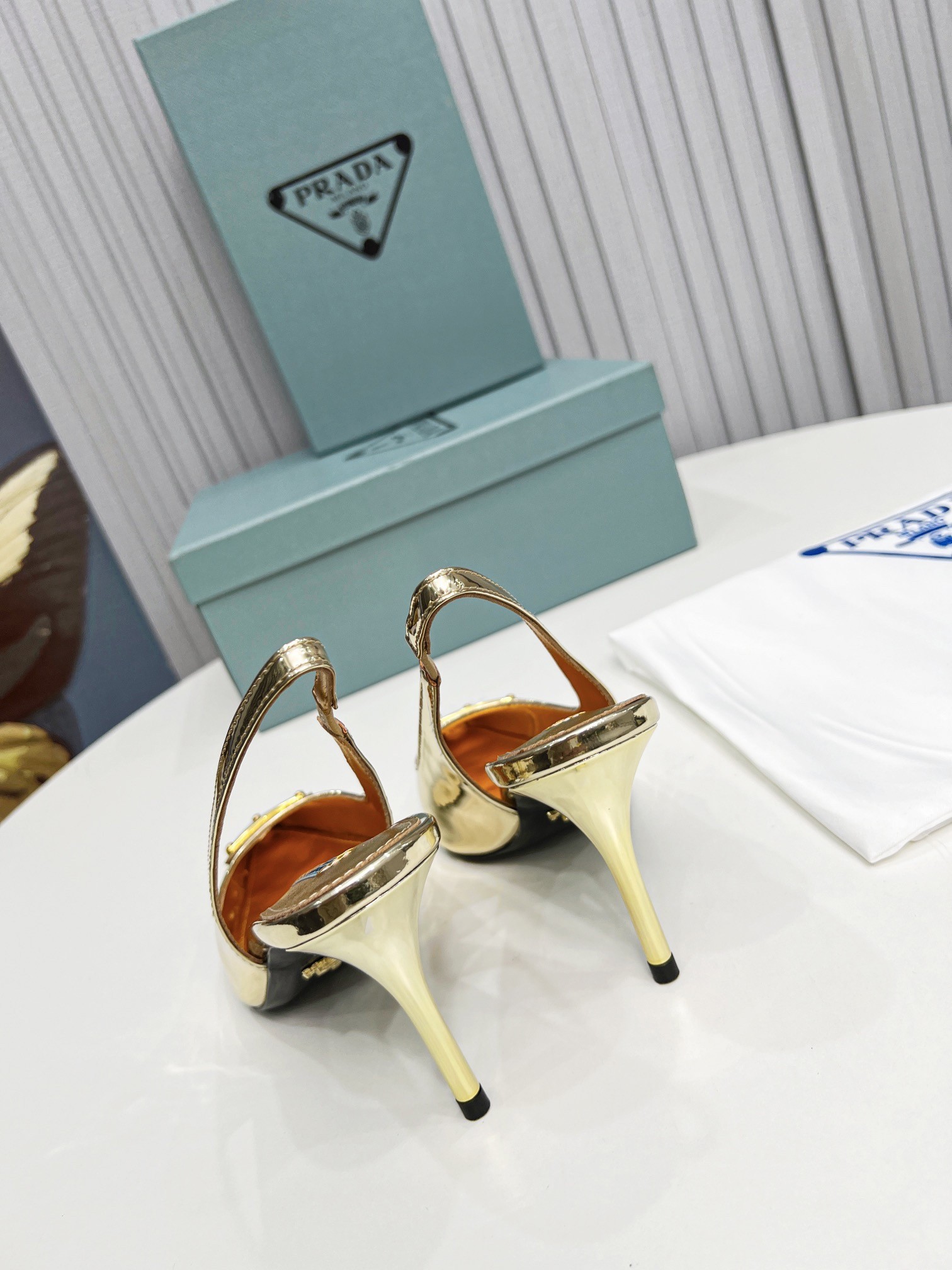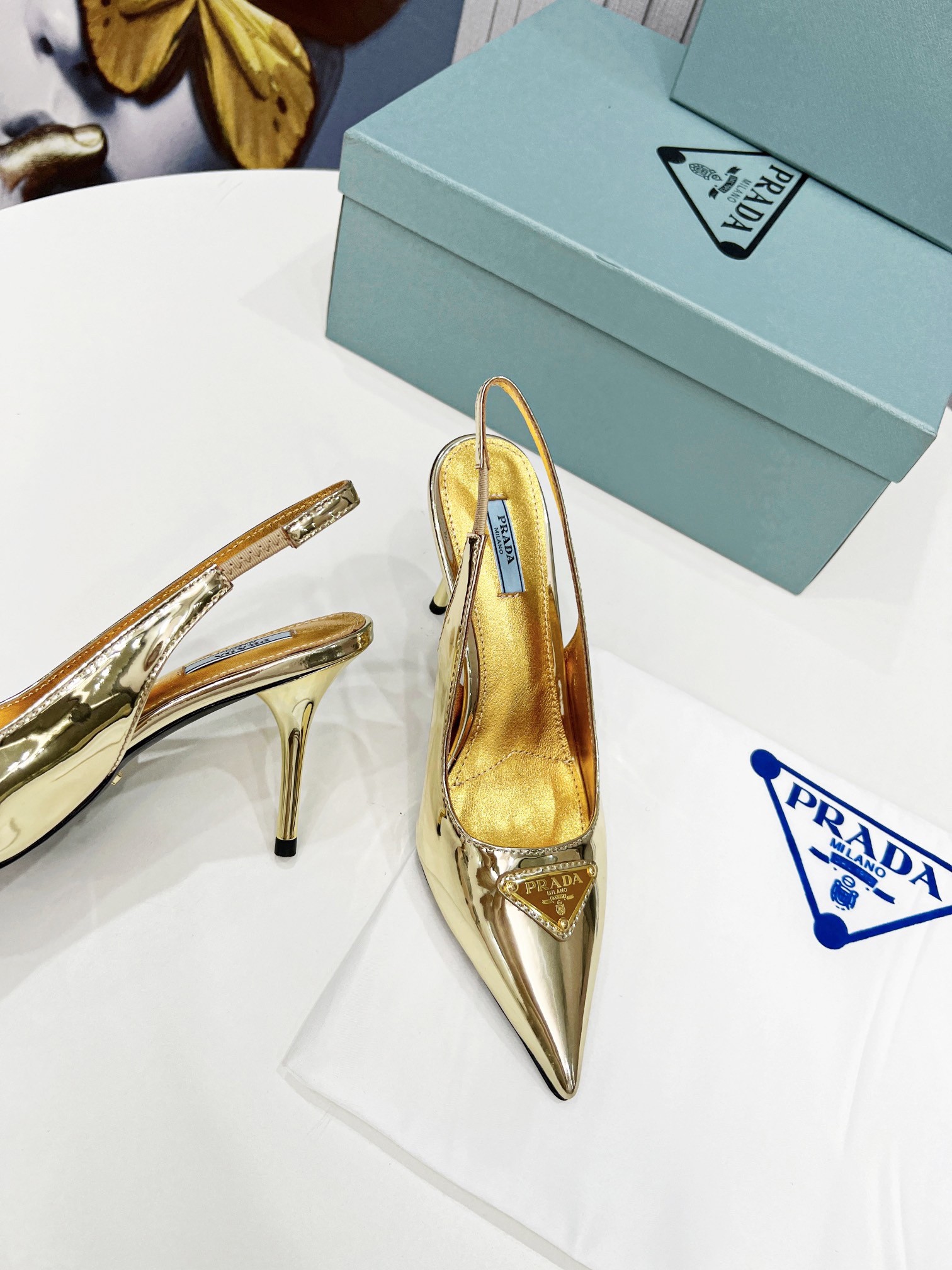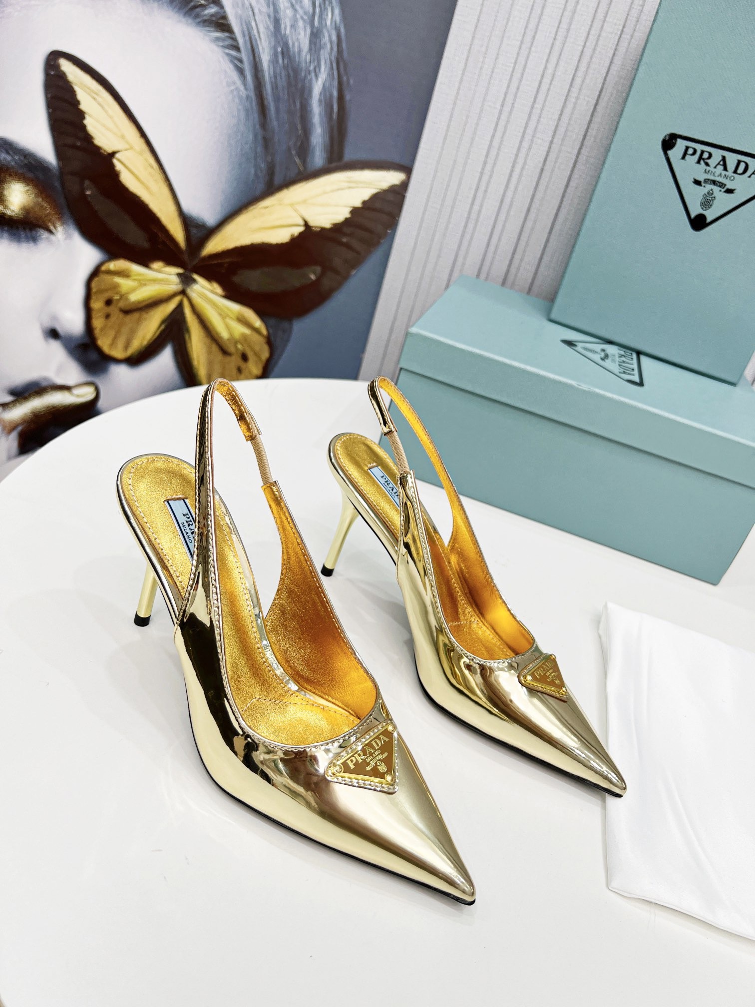 Prada's iconic triangle logo decorates these slingback pumps with sleek allure. A metallic gleam elegantly accents this leather style decorated with the iconic enameled metal triangle logo, which first appeared in 1913 on trunks designed by Mario Prada.