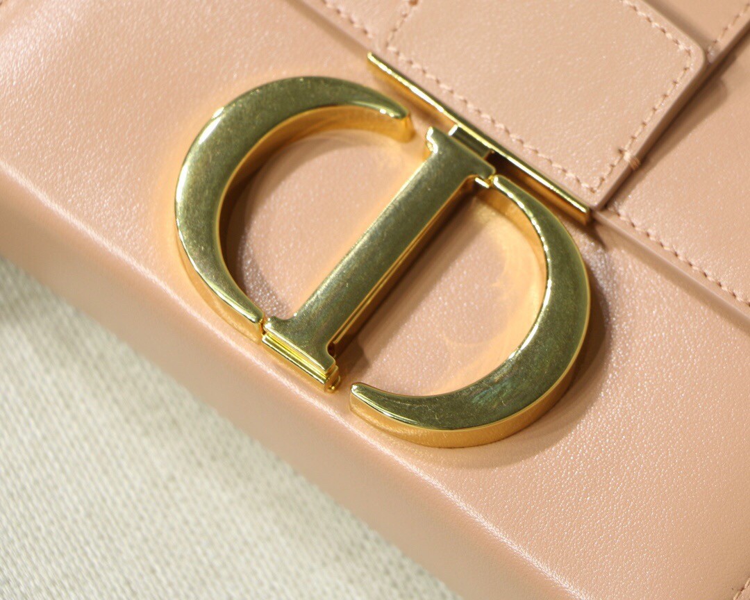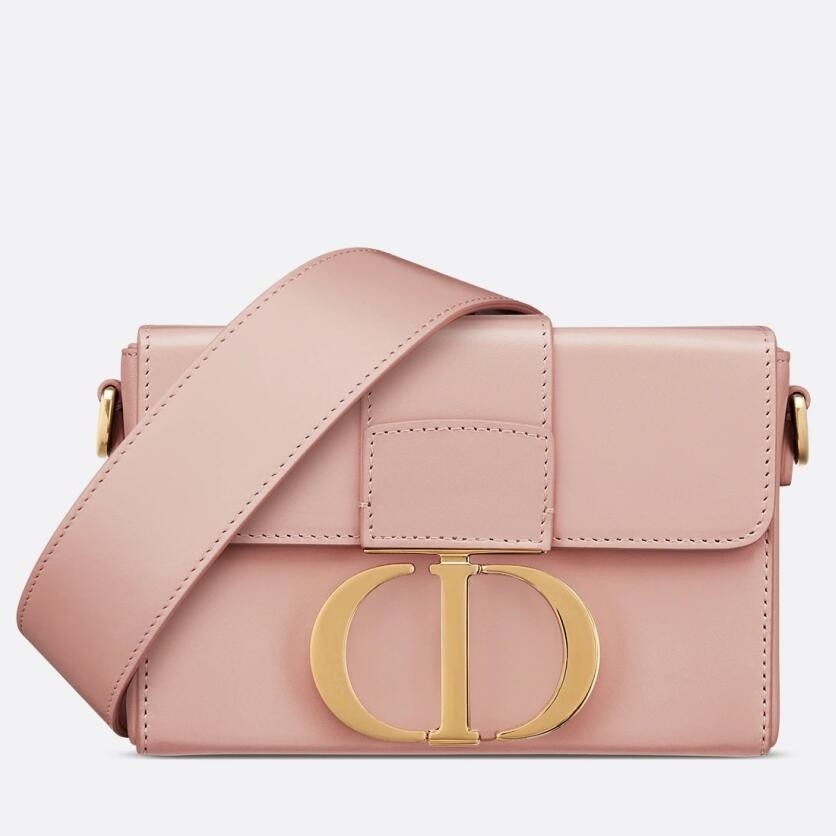 The 30 Montaigne line, inspired by the hallmark address, offers essential pieces that embody the House's iconic codes. The compact handbag is crafted in box calfskin for an elegant and modern design. The flap has an antique gold-finish metal 'CD' clasp, inspired by the seal of a Christian Dior perfume bottle. Other details, like the embossed '30 MONTAIGNE' signature at the back and the military-inspired buckle highlight the streamlined design. The style has an adjustable leather shoulder strap and can be carried by hand, worn over the shoulder or crossbody.
