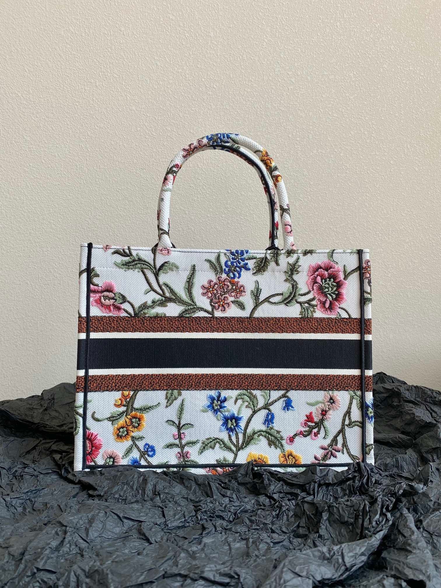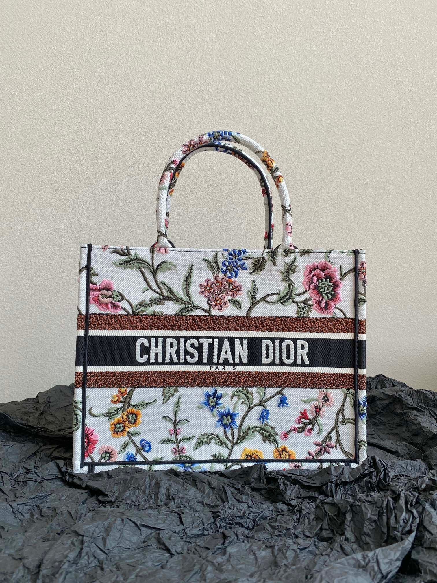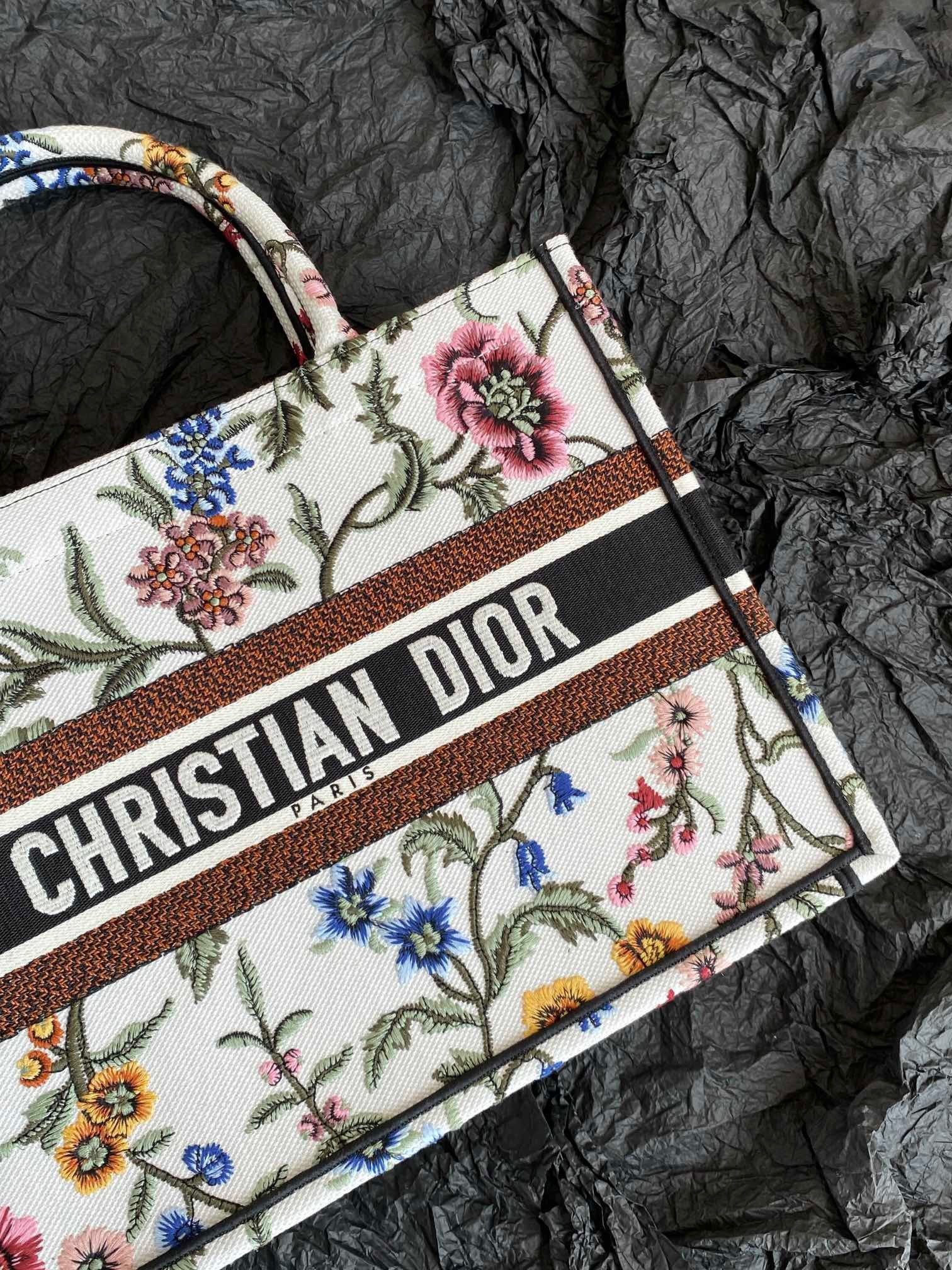 Introduced by Maria Grazia Chiuri, Creative Director of Christian Dior, the Dior Book Tote has become a staple of the Dior aesthetic. Designed to hold all daily essentials, the style is fully embroidered with a white multicolor Dior Petites Fleurs motif, a romantic and vibrant homage to Mr. Dior's passion for florals. Adorned with the Christian Dior Paris signature on the front, the medium tote exemplifies the House's signature savoir-faire and may be carried by hand or worn over the shoulder.