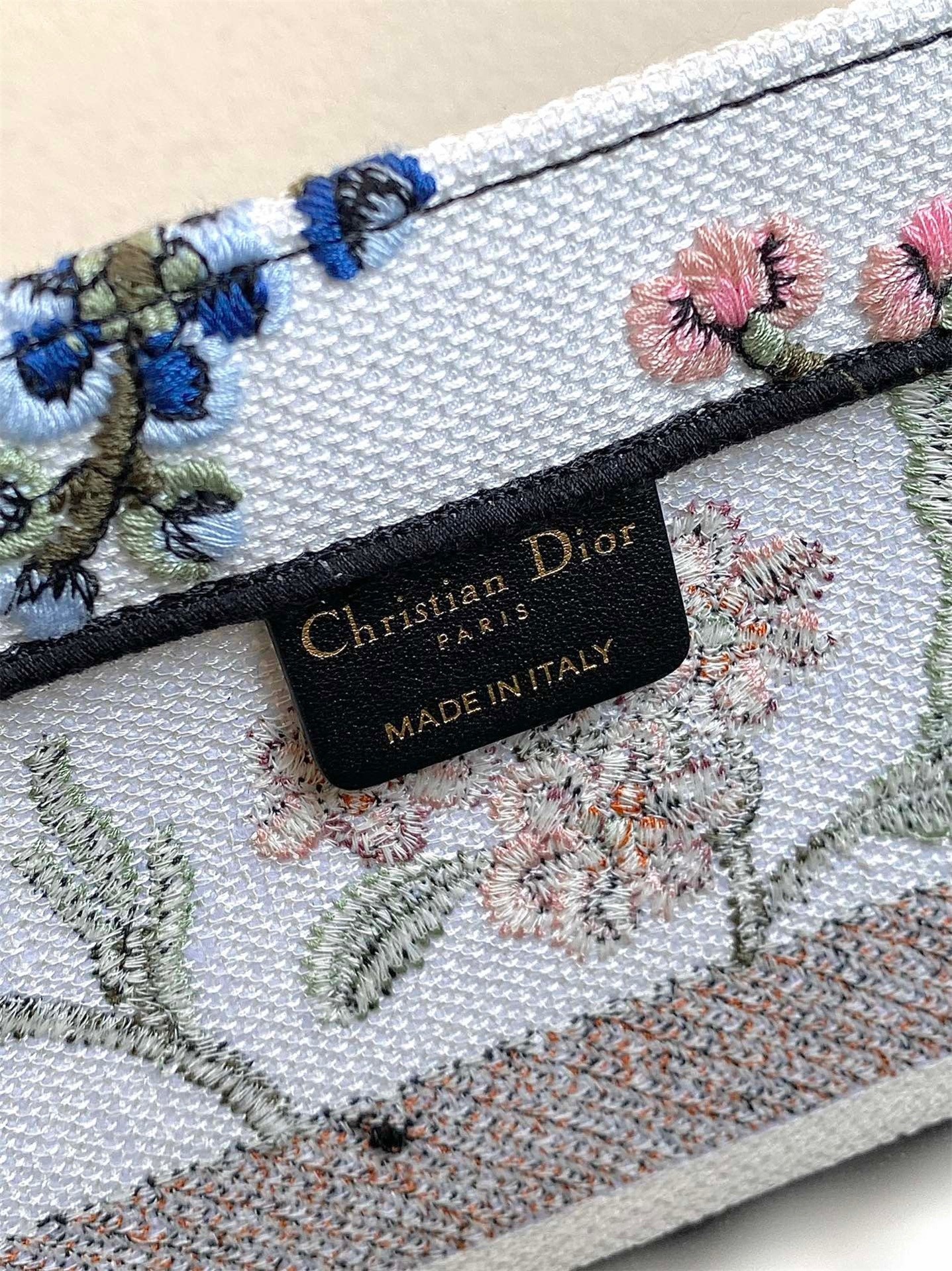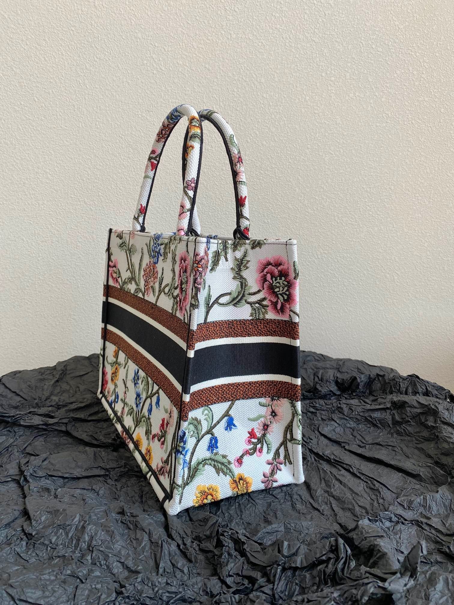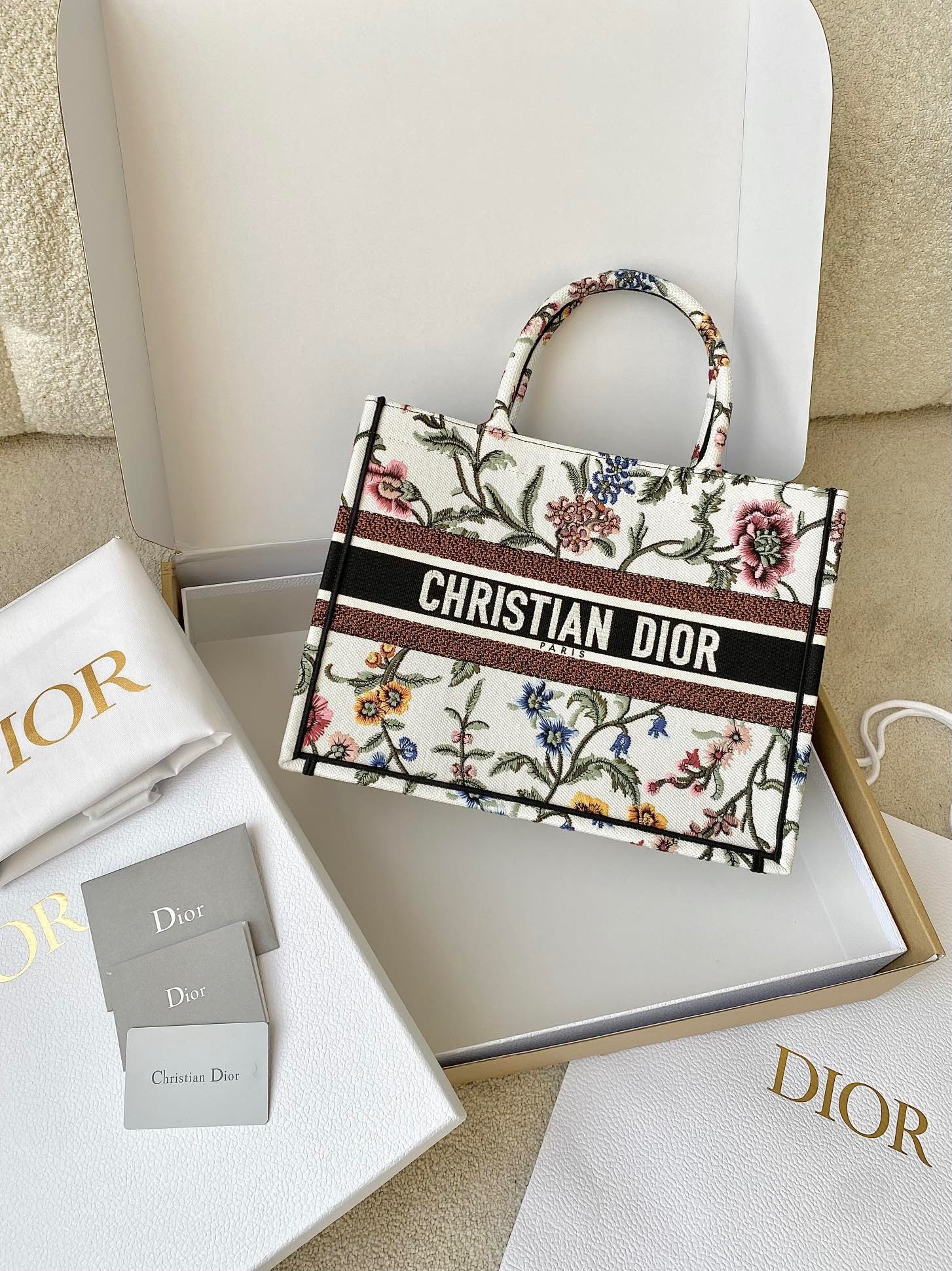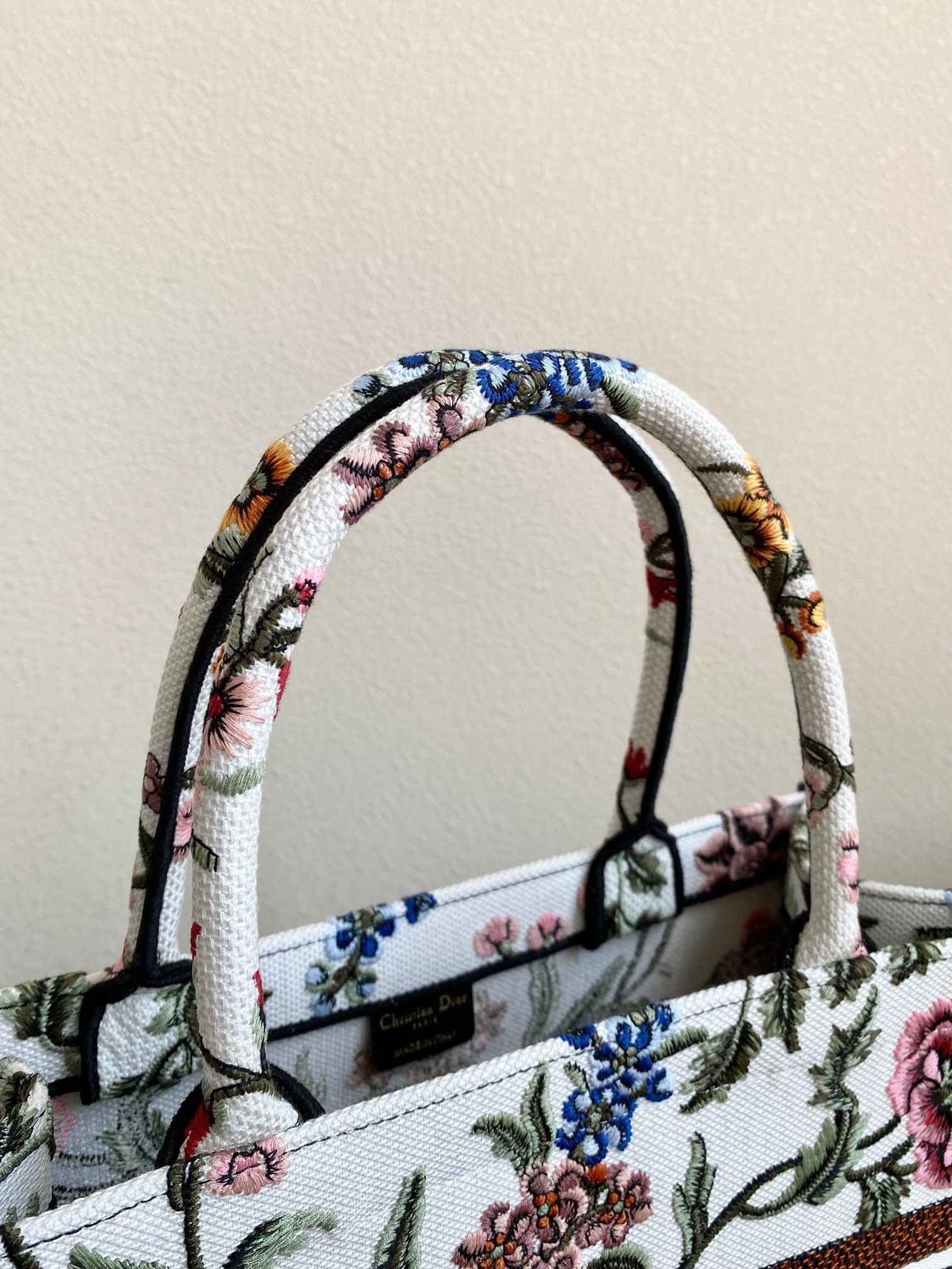 Introduced by Maria Grazia Chiuri, Creative Director of Christian Dior, the Dior Book Tote has become a staple of the Dior aesthetic. Designed to hold all daily essentials, the style is fully embroidered with a white multicolor Dior Petites Fleurs motif, a romantic and vibrant homage to Mr. Dior's passion for florals. Adorned with the Christian Dior Paris signature on the front, the medium tote exemplifies the House's signature savoir-faire and may be carried by hand or worn over the shoulder.