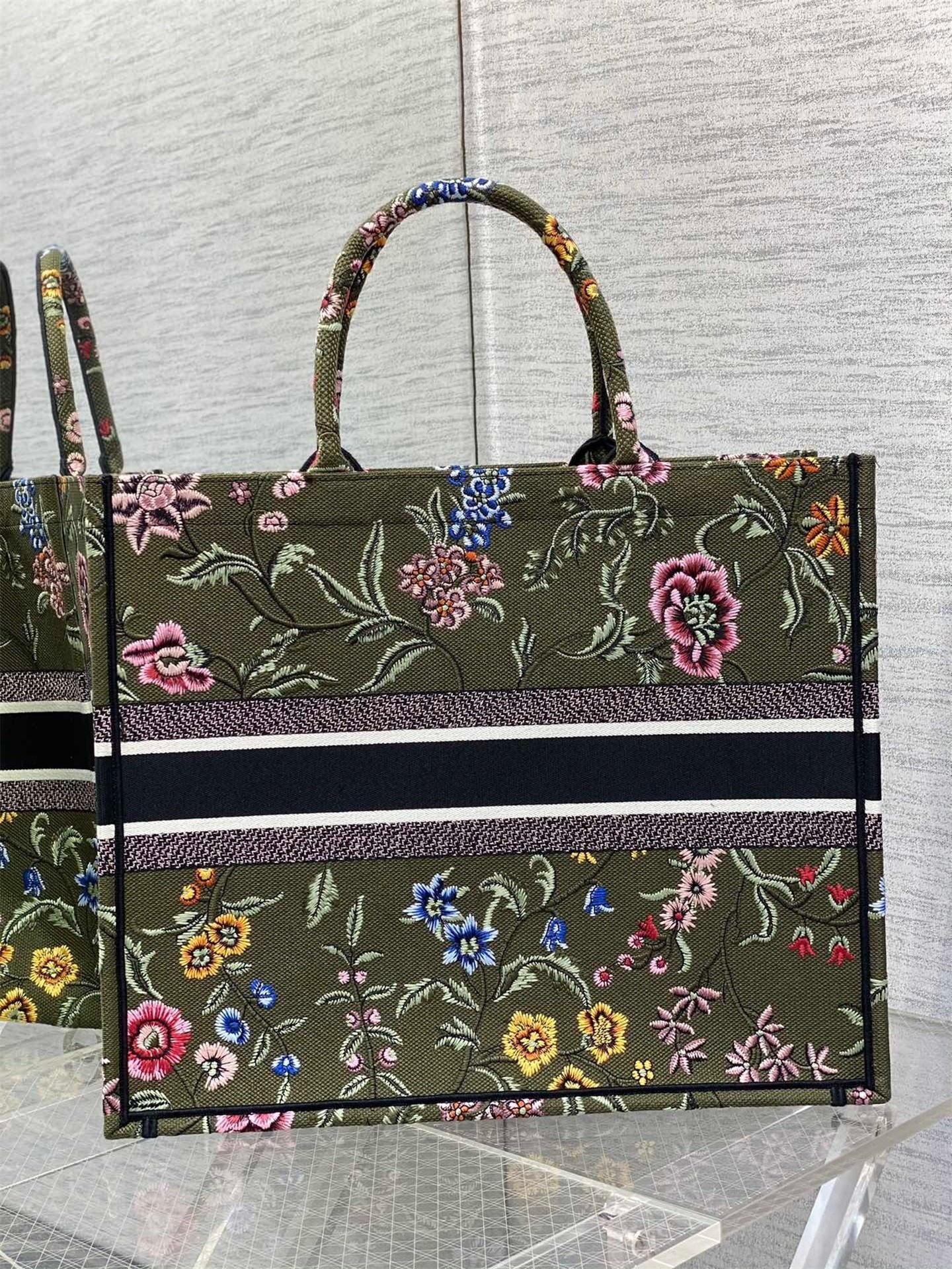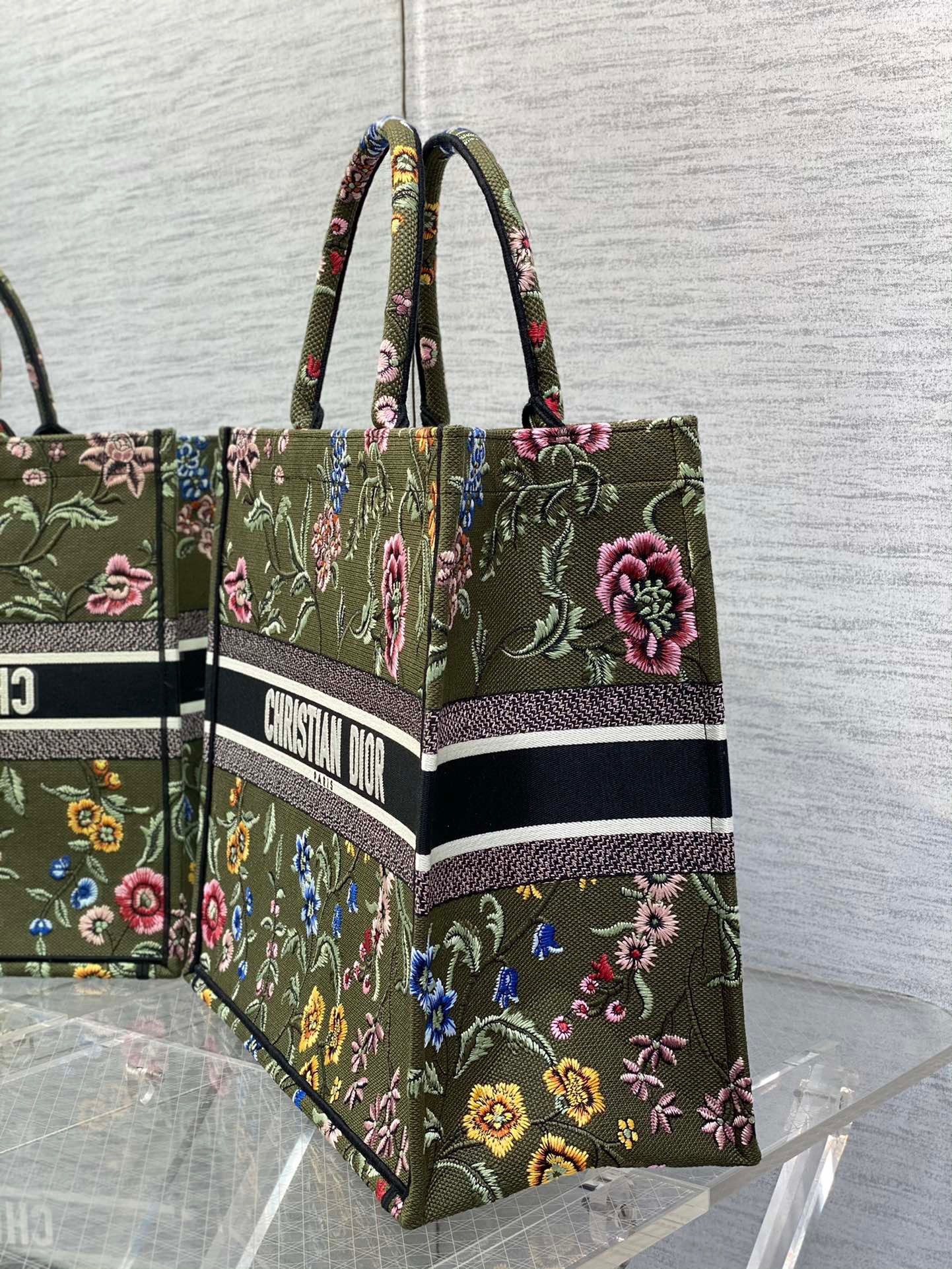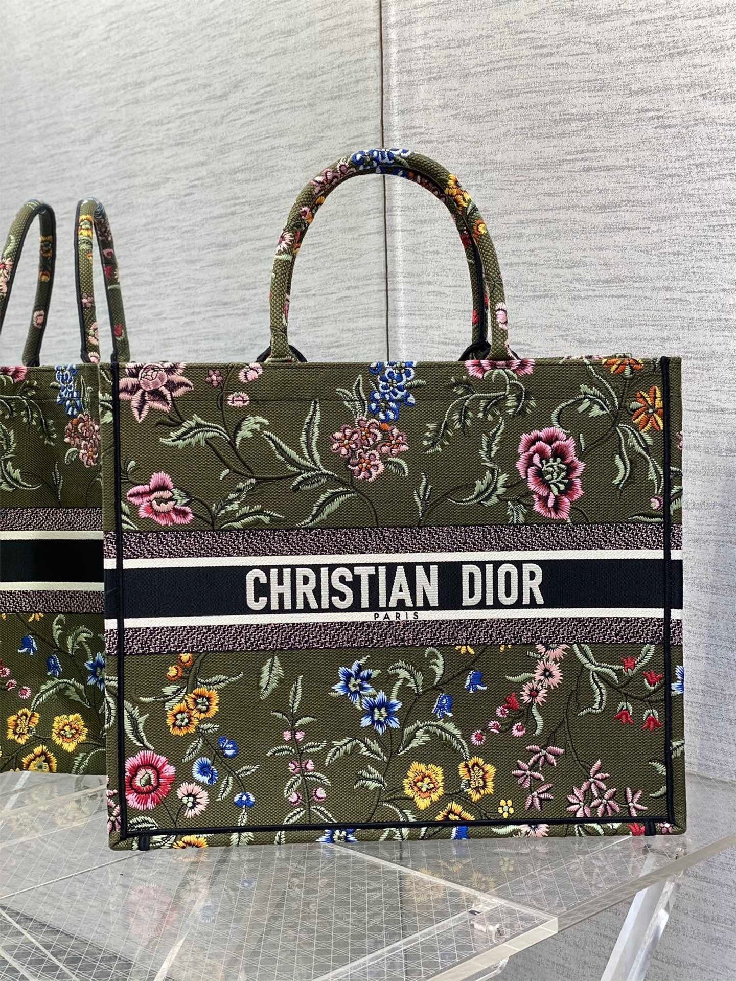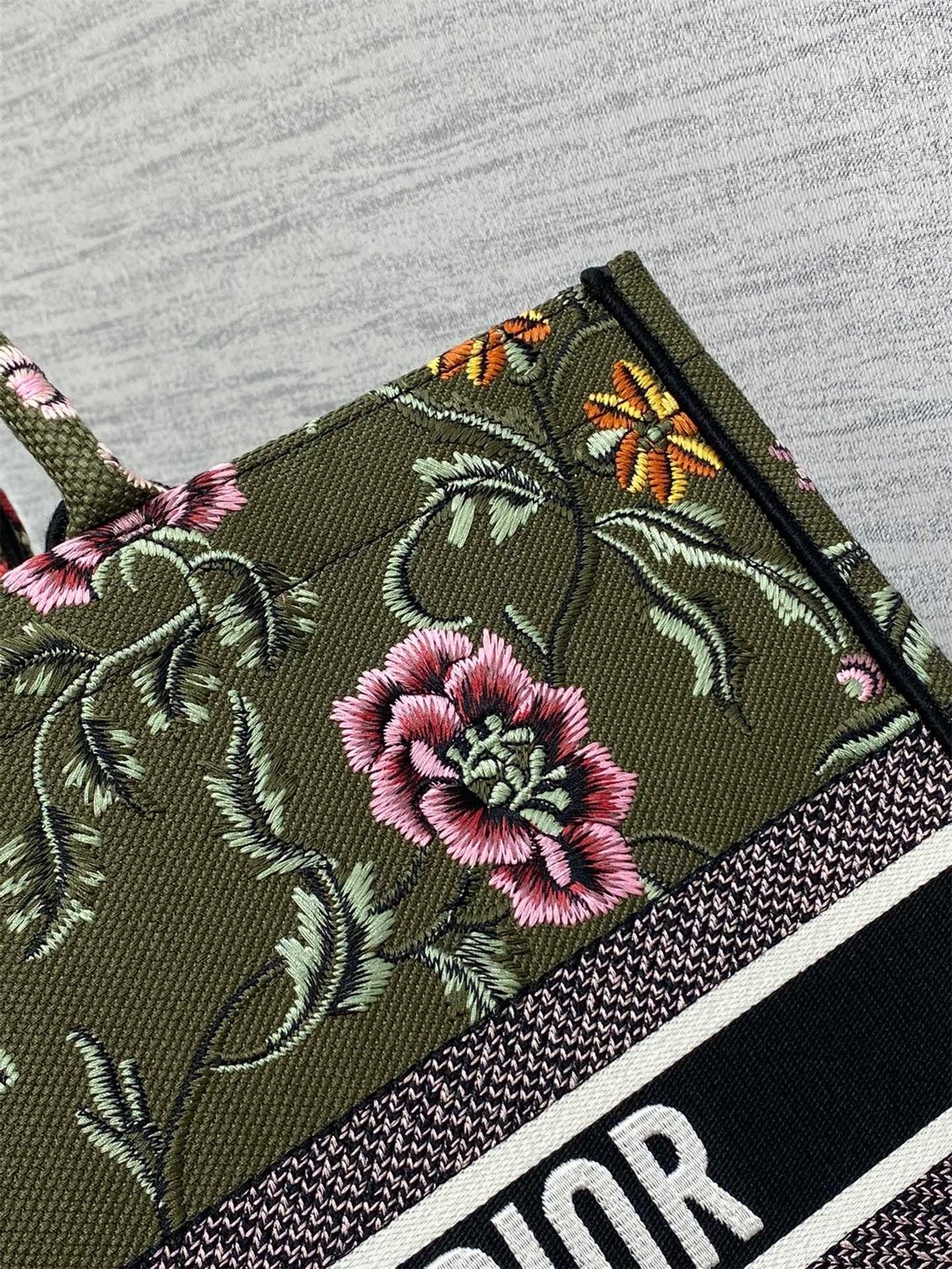 Introduced by Maria Grazia Chiuri, Creative Director of Christian Dior, the Dior Book Tote has become a staple of the Dior aesthetic. Designed to hold all daily essentials, the style is fully embroidered with a green multicolor Dior Petites Fleurs motif, a romantic and vibrant homage to Mr. Dior's passion for florals. Adorned with the Christian Dior Paris signature on the front, the large tote exemplifies the House's signature savoir-faire and may be carried by hand or worn over the shoulder.