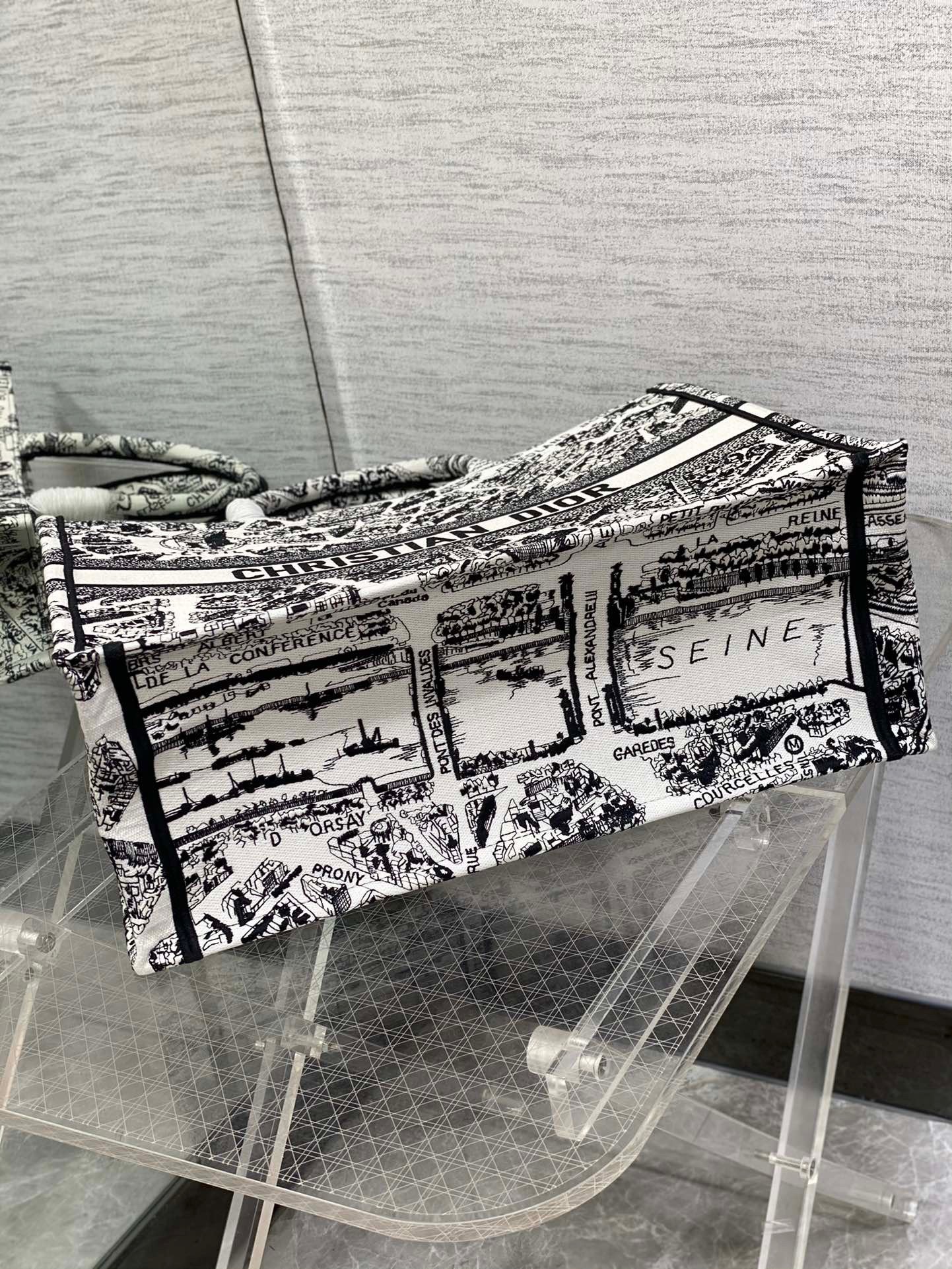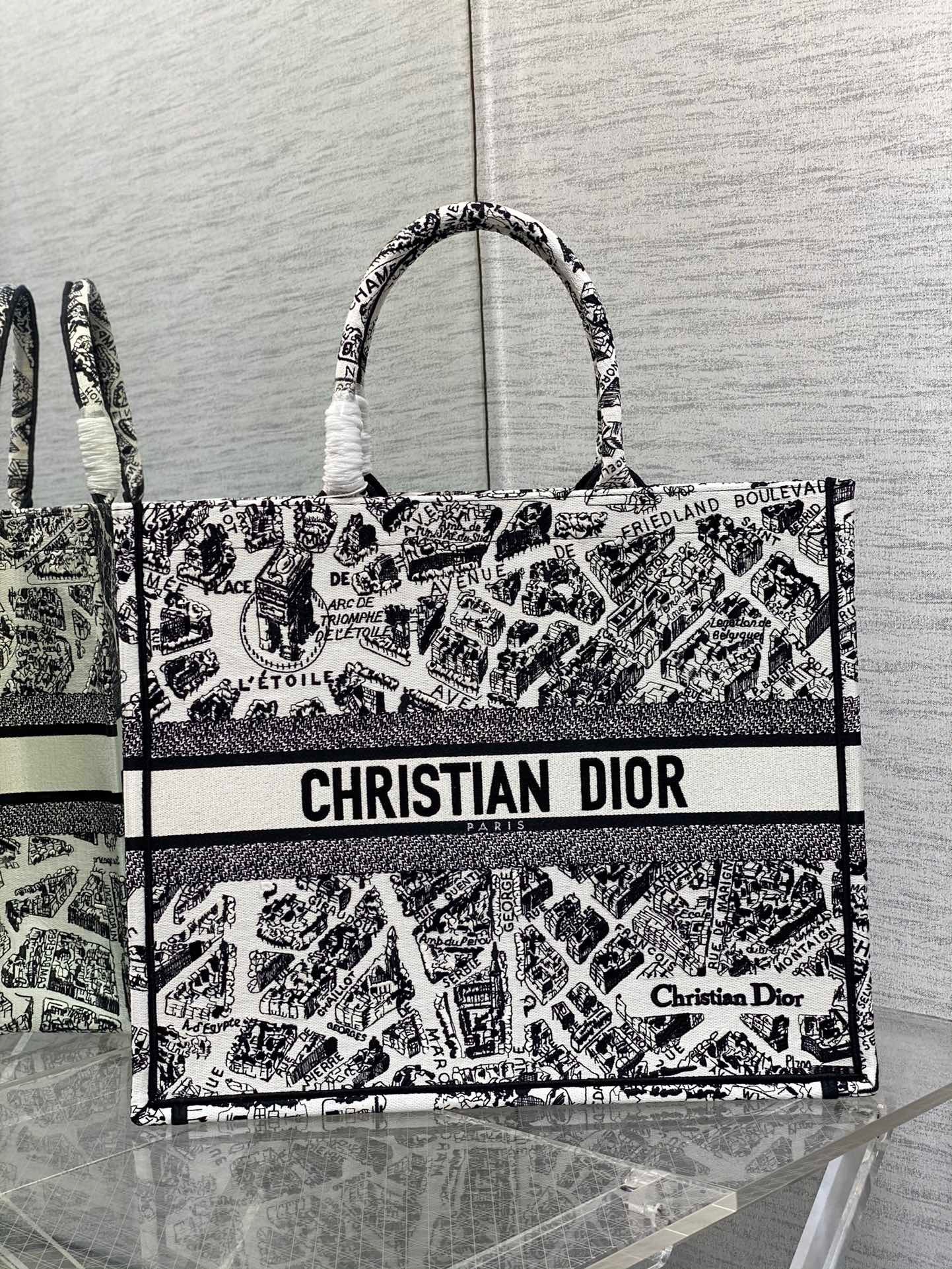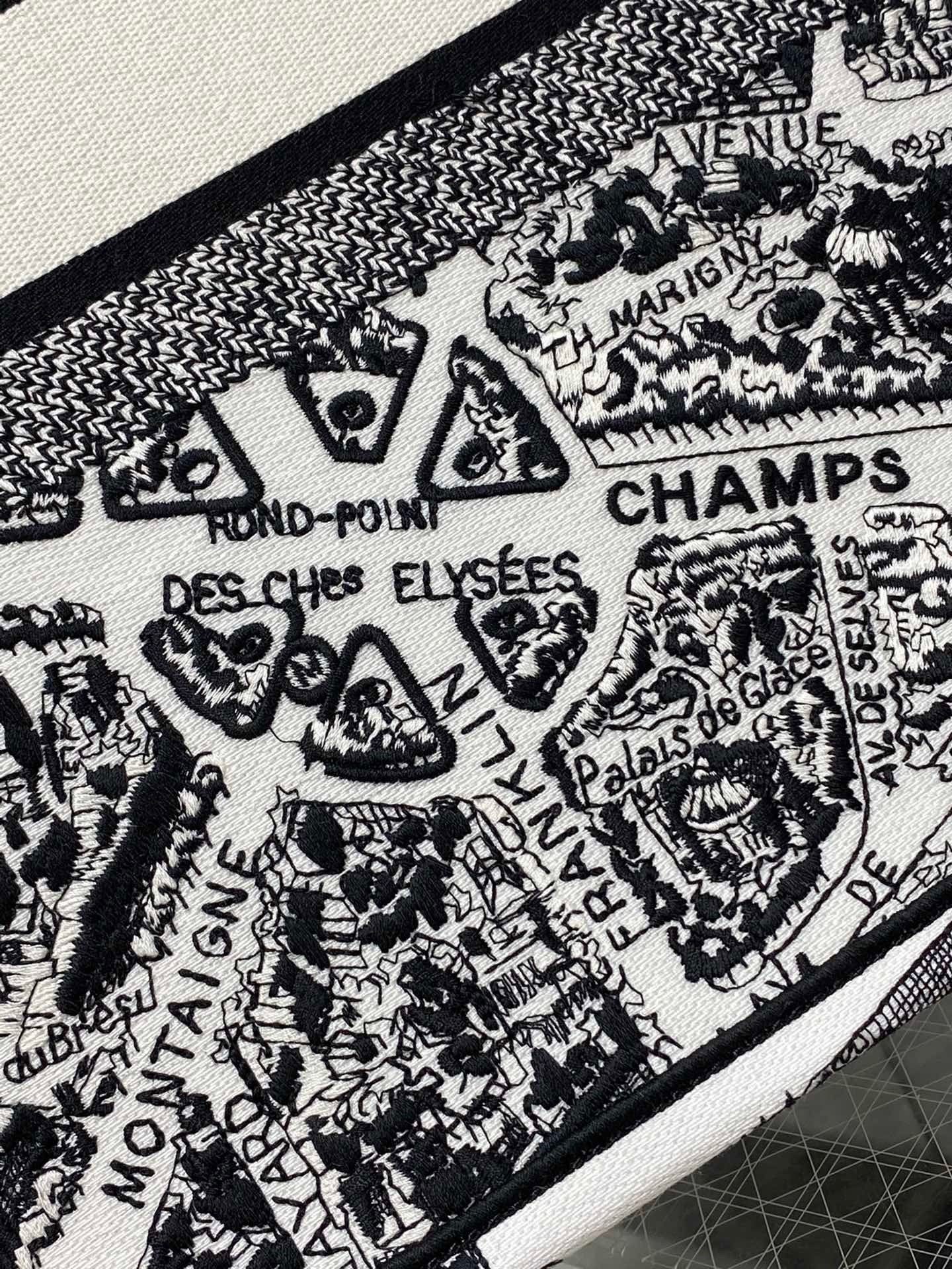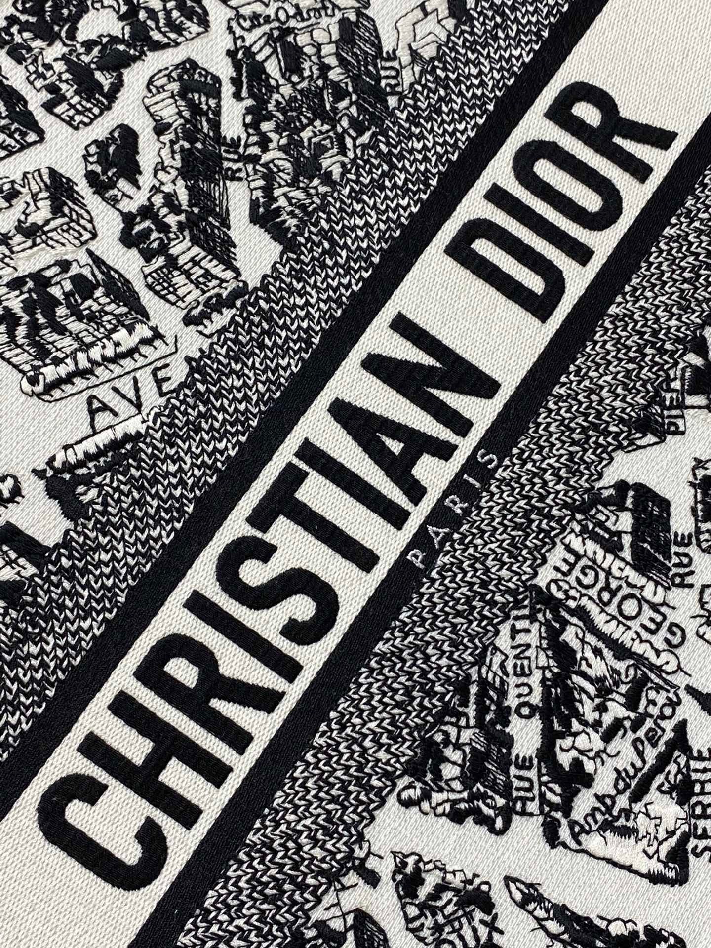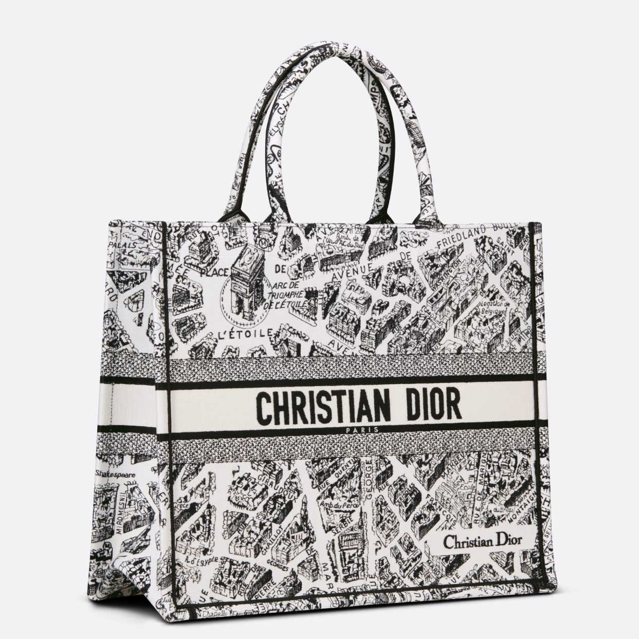 Introduced by Maria Grazia Chiuri, Creative Director of Christian Dior, the Dior Book Tote has become a staple of the Dior aesthetic. Designed to hold all the daily essentials, the style is fully embroidered with the season's signature white and black Plan de Paris motif, inspired by the House archives and centered around Dior's historic address on Avenue Montaigne. Adorned with the Christian Dior Paris signature on the front, the large tote exemplifies the House's signature savoir-faire and may be carried by hand or worn over the shoulder.
