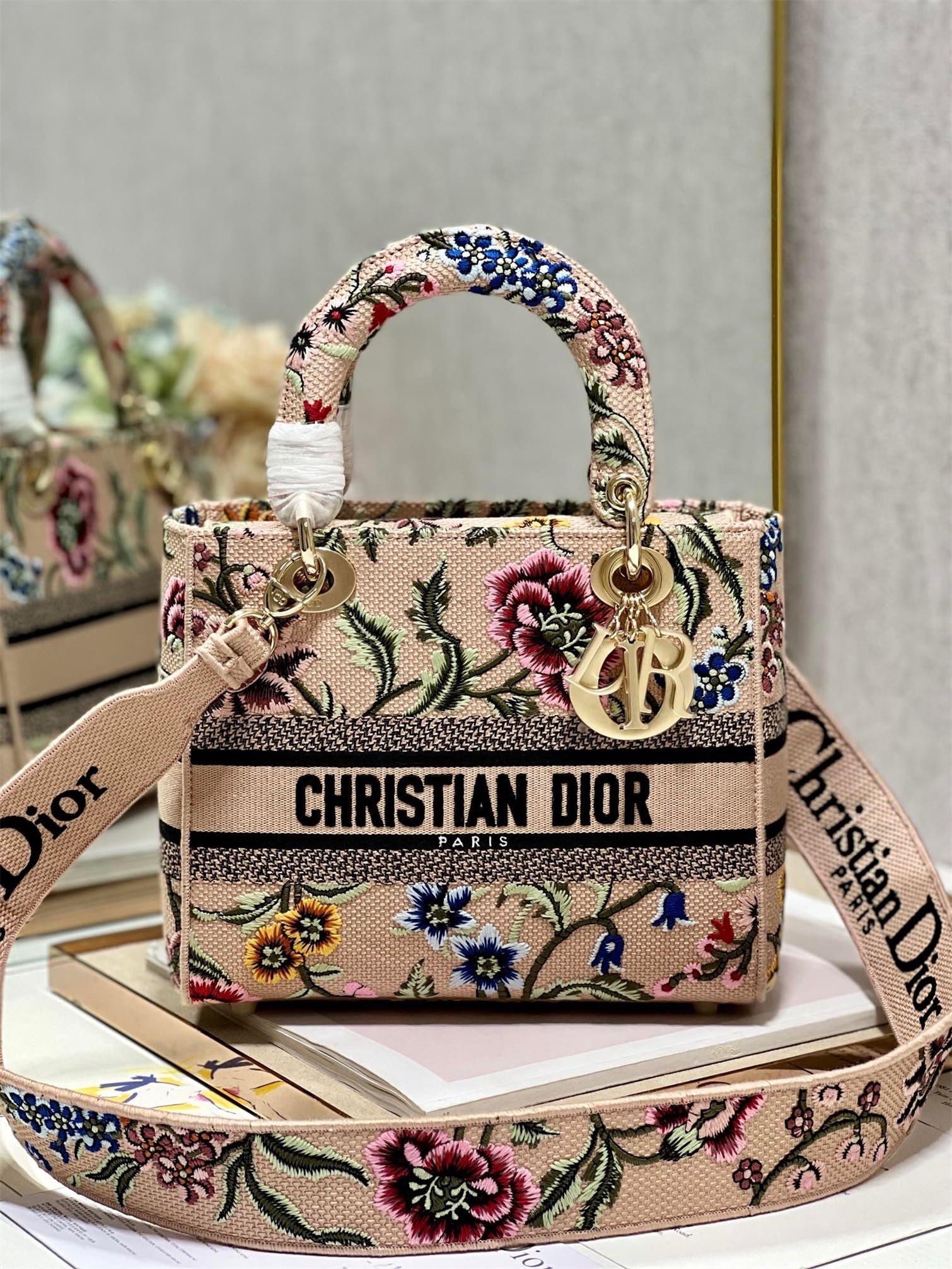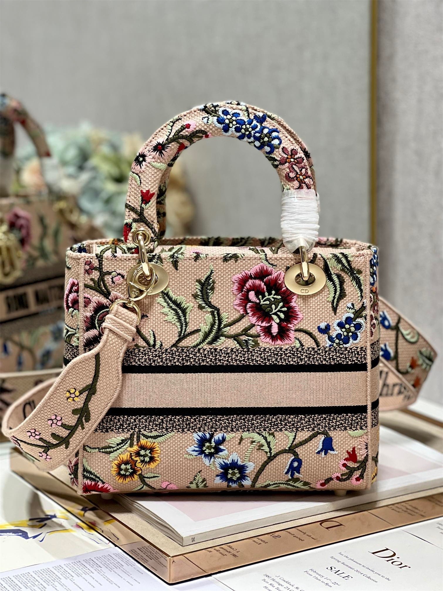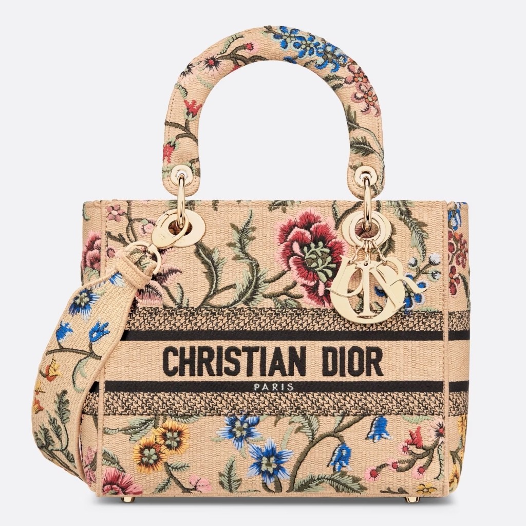 The Lady D-Lite bag combines classic elegance with House modernity. Crafted in natural raffia, the style is embroidered with the multicolor Dior Petites Fleurs motif, a romantic and vibrant homage to Mr. Dior's passion for florals. D.I.O.R. charms in pale gold-finish metal enhance and highlight the silhouette. Featuring a wide, removable and reversible embroidered shoulder strap, the medium Lady D-Lite bag can be carried by hand or worn crossbody.