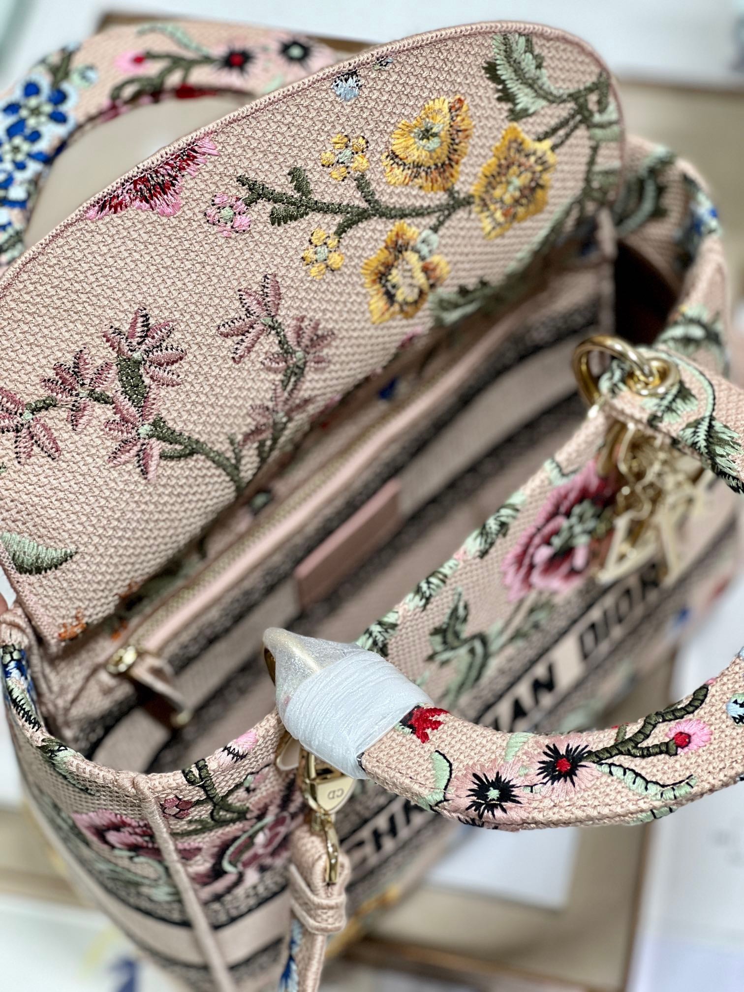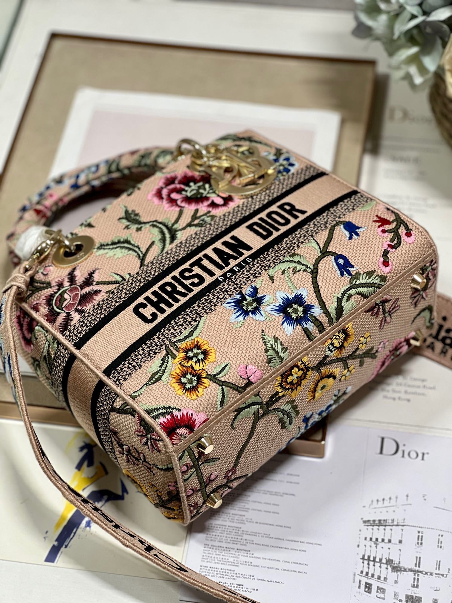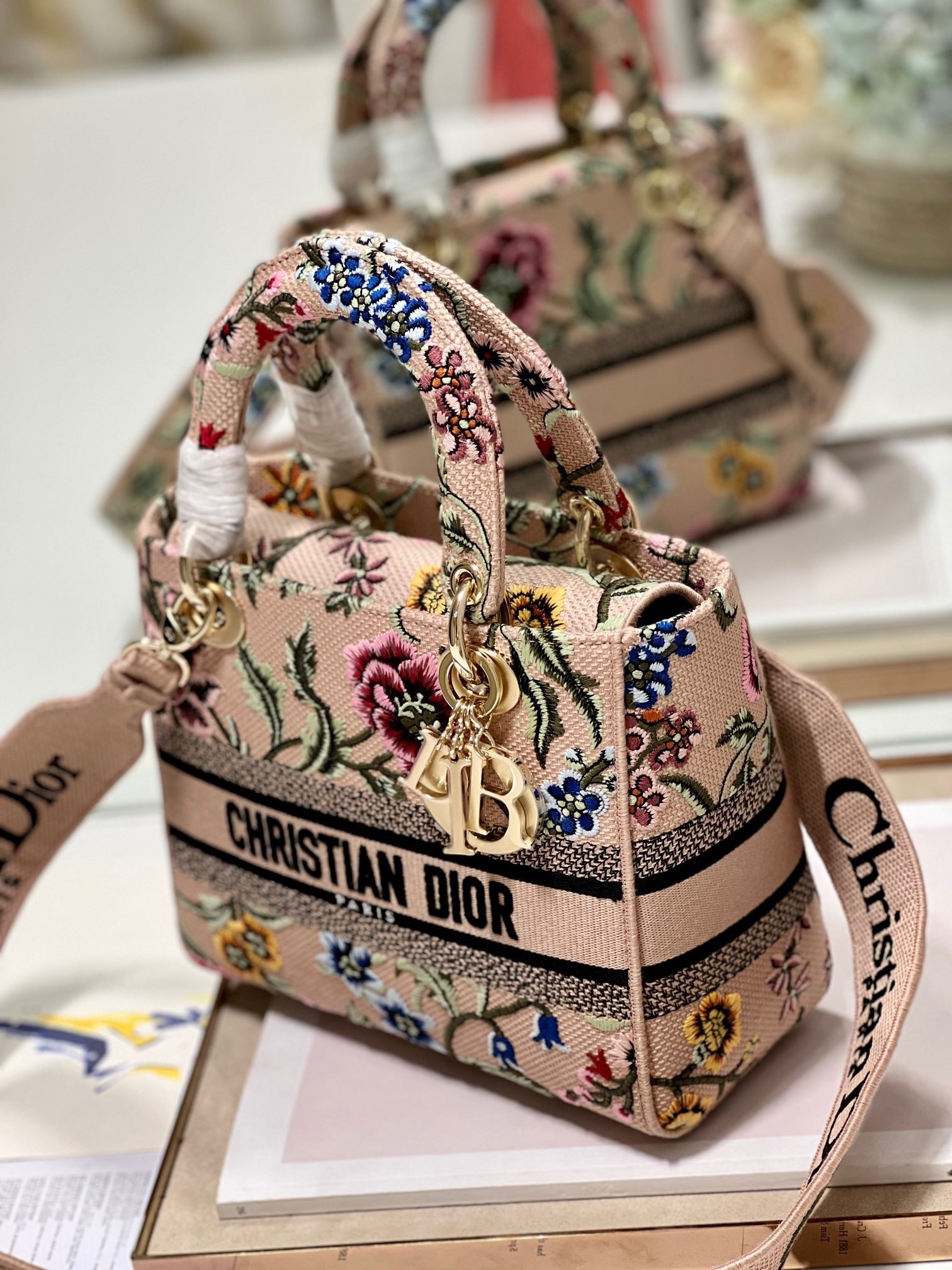 The Lady D-Lite bag combines classic elegance with House modernity. Crafted in natural raffia, the style is embroidered with the multicolor Dior Petites Fleurs motif, a romantic and vibrant homage to Mr. Dior's passion for florals. D.I.O.R. charms in pale gold-finish metal enhance and highlight the silhouette. Featuring a wide, removable and reversible embroidered shoulder strap, the medium Lady D-Lite bag can be carried by hand or worn crossbody.