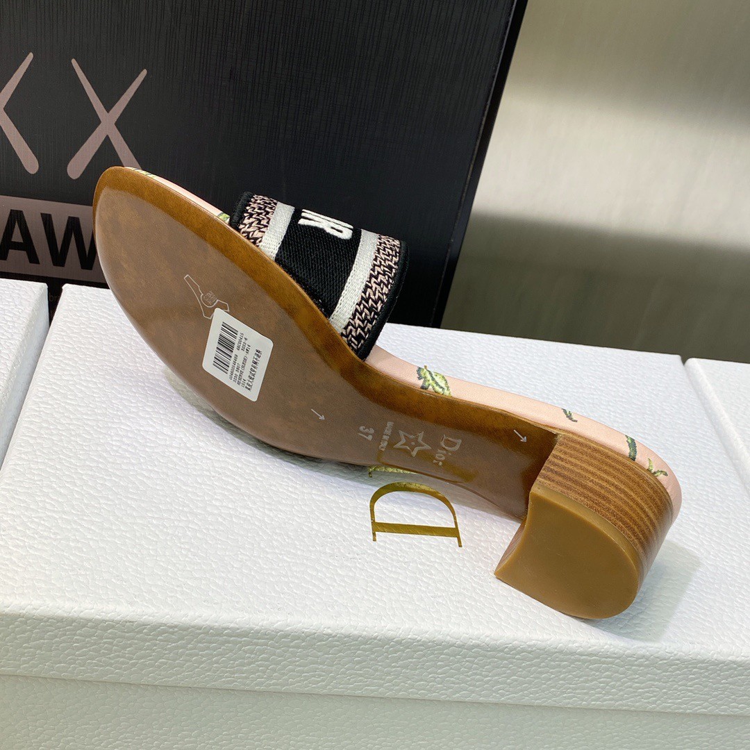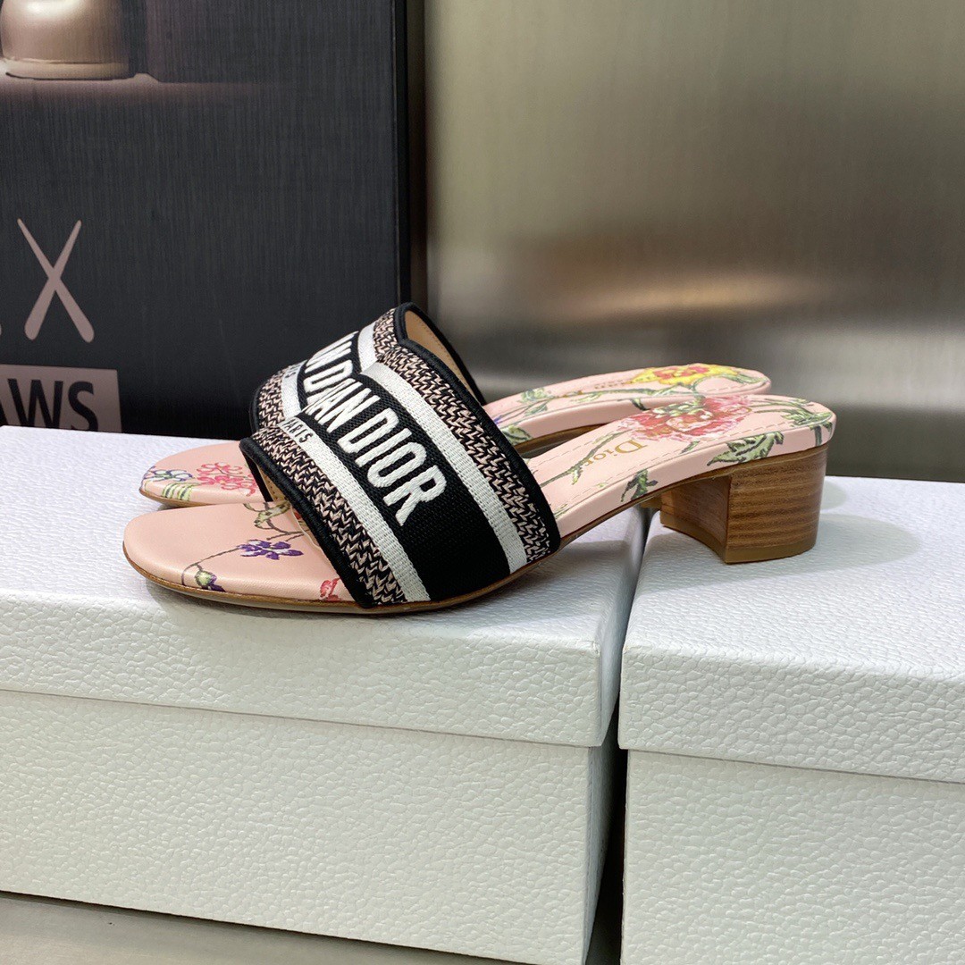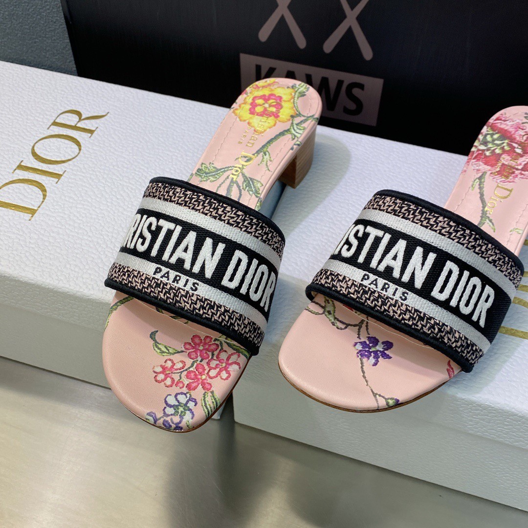 The hallmark and timeless Dway heeled slide is enhanced by the multicolor Dior Petites Fleurs motif, a romantic and vibrant homage to Mr. Dior's passion for florals. The multicolor cotton upper embroidered with the Christian Dior Paris signature adds an instantly recognizable touch. Completed by a 4 cm block heel, the slide will lend a modern touch to any attire and can be paired with other Dior Petites Fleurs creations from the collection.