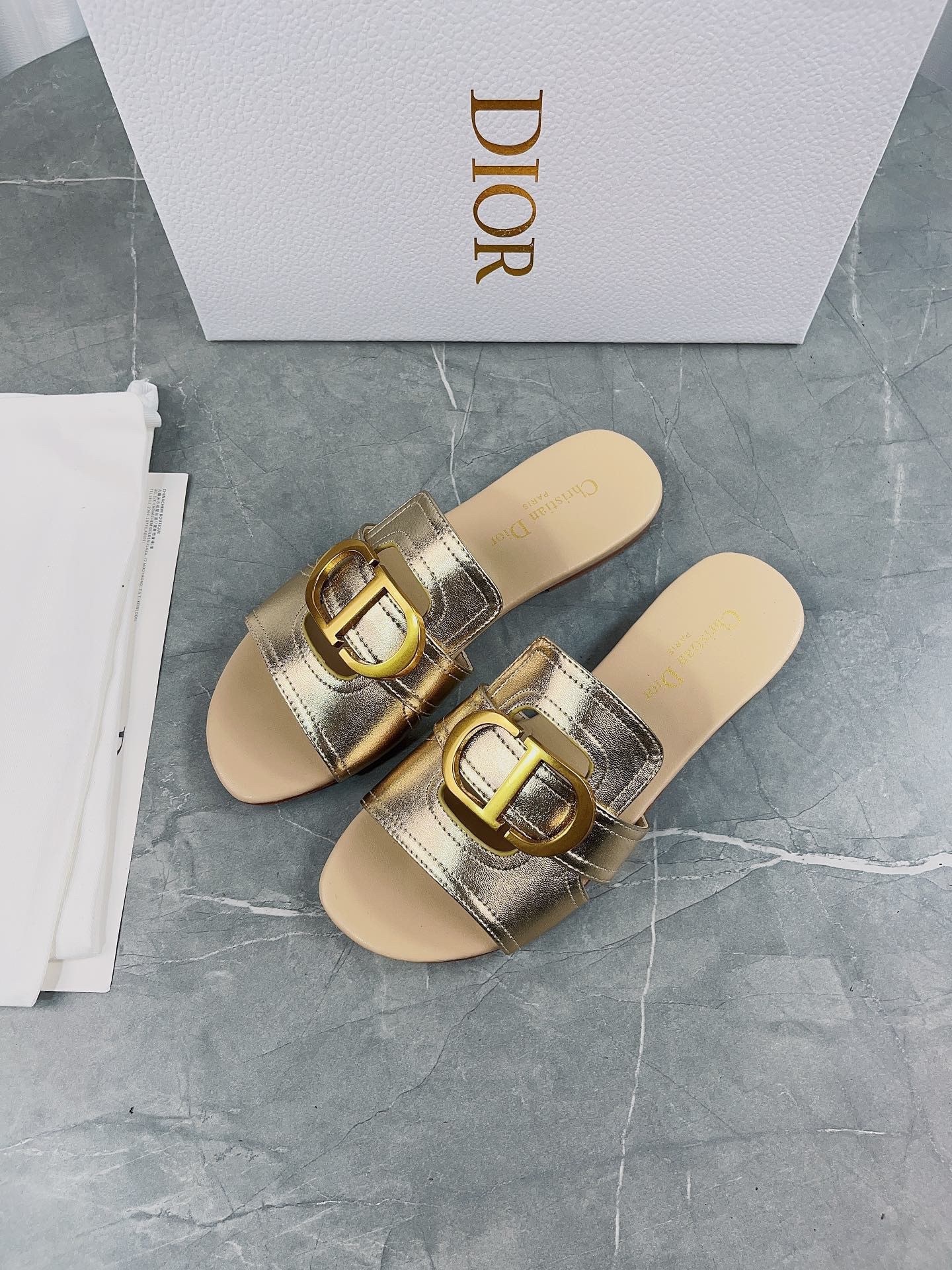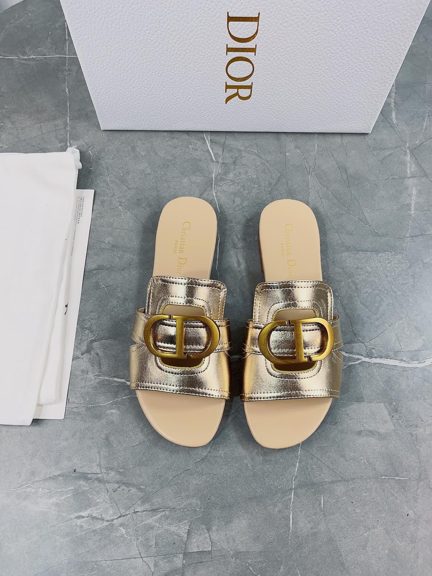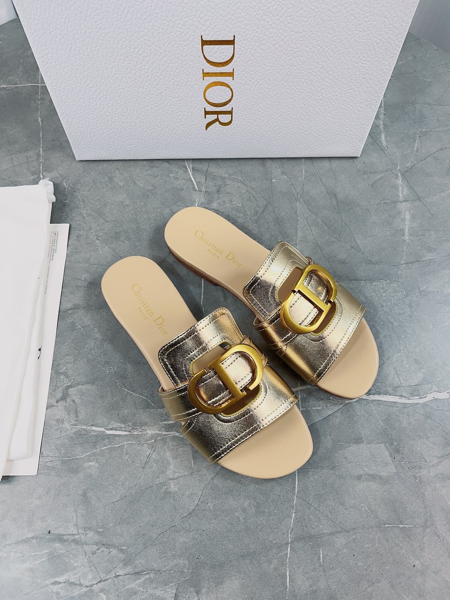 Part of the Dior Or capsule collection, the 30 Montaigne slide is a staple of the Dior wardrobe. The gold-finish metal CD signature highlights the style and adorns the platinum-tone metallic calfskin. Featuring a timeless and elegant silhouette, the slide will effortlessly add the finishing touch to any attire and can pair with other Dior Or creations.