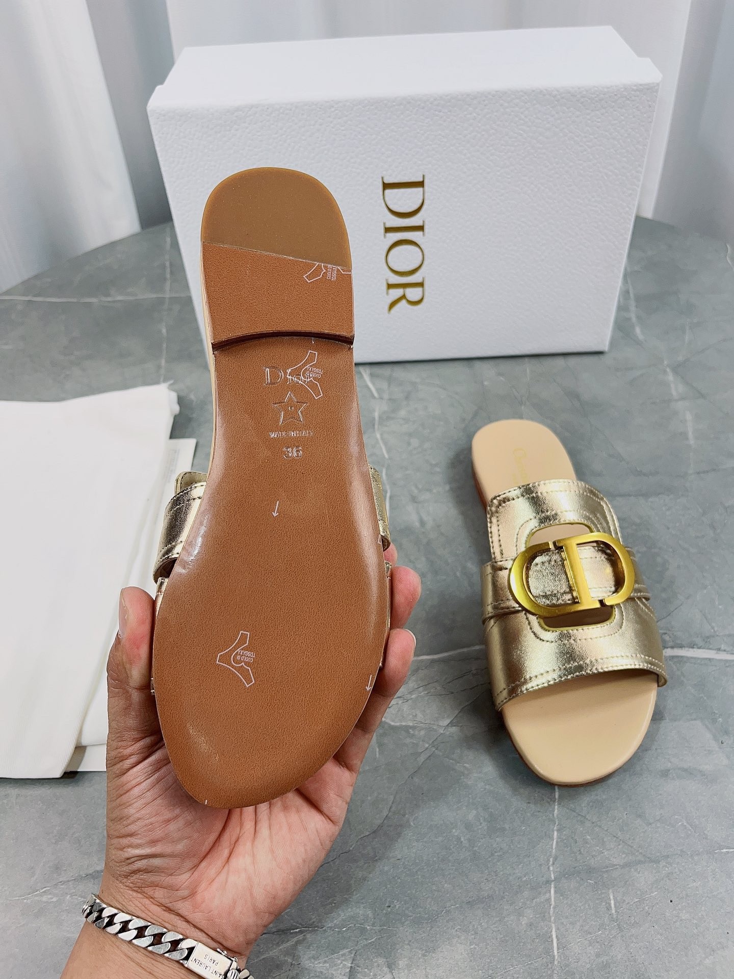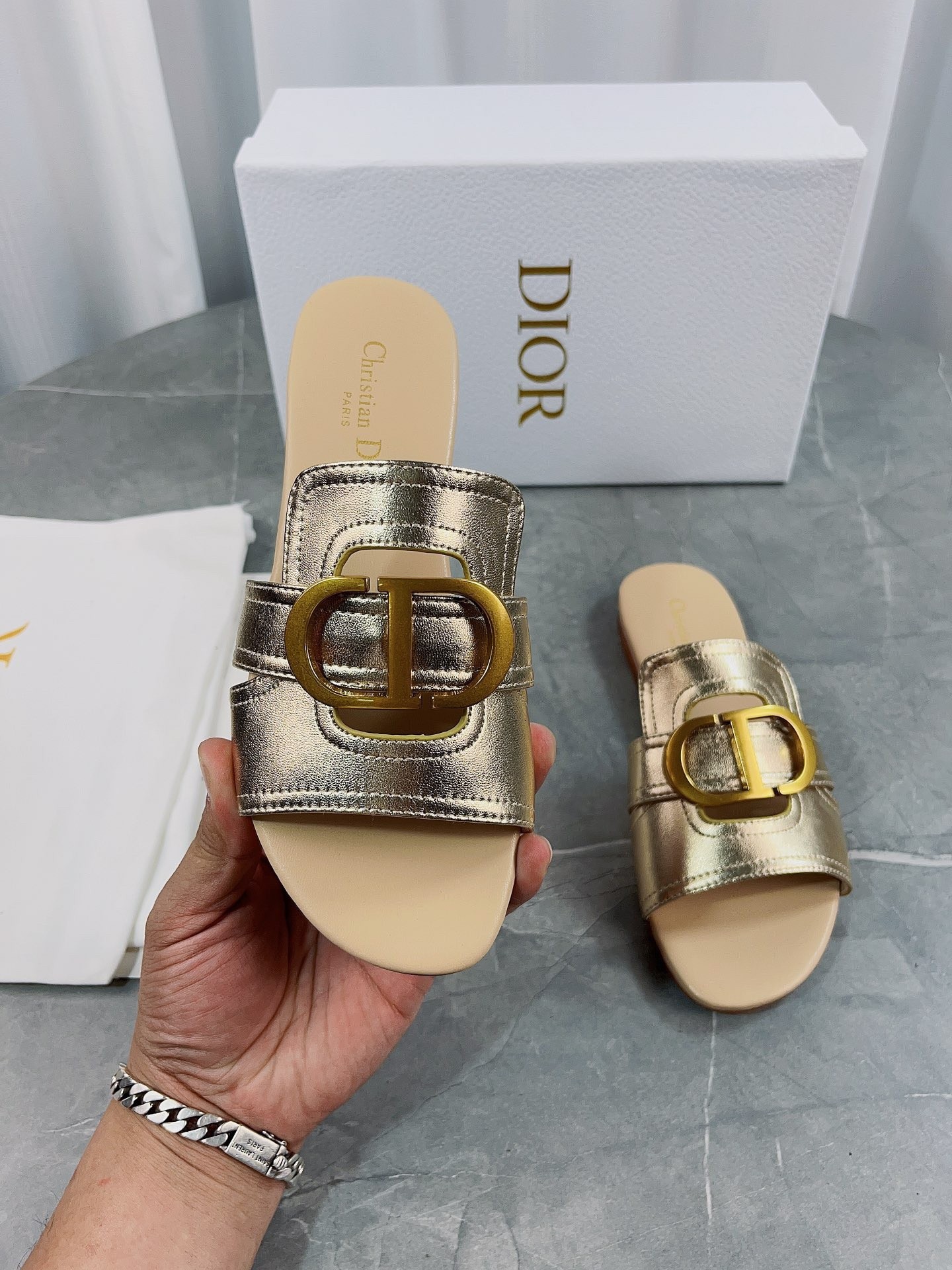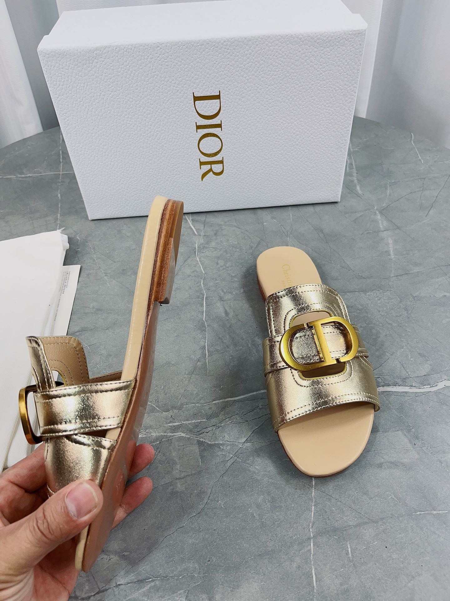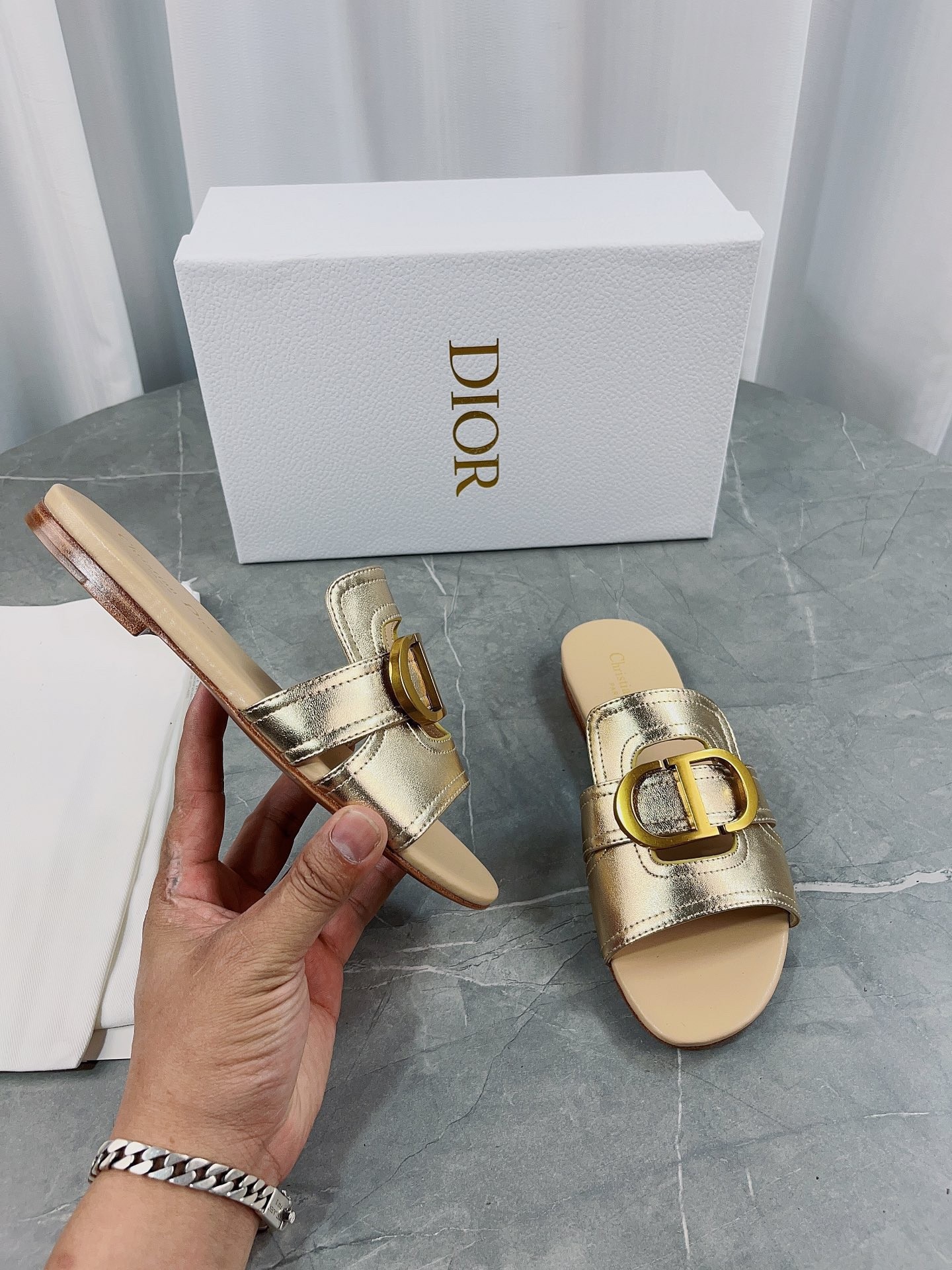 Part of the Dior Or capsule collection, the 30 Montaigne slide is a staple of the Dior wardrobe. The gold-finish metal CD signature highlights the style and adorns the platinum-tone metallic calfskin. Featuring a timeless and elegant silhouette, the slide will effortlessly add the finishing touch to any attire and can pair with other Dior Or creations.