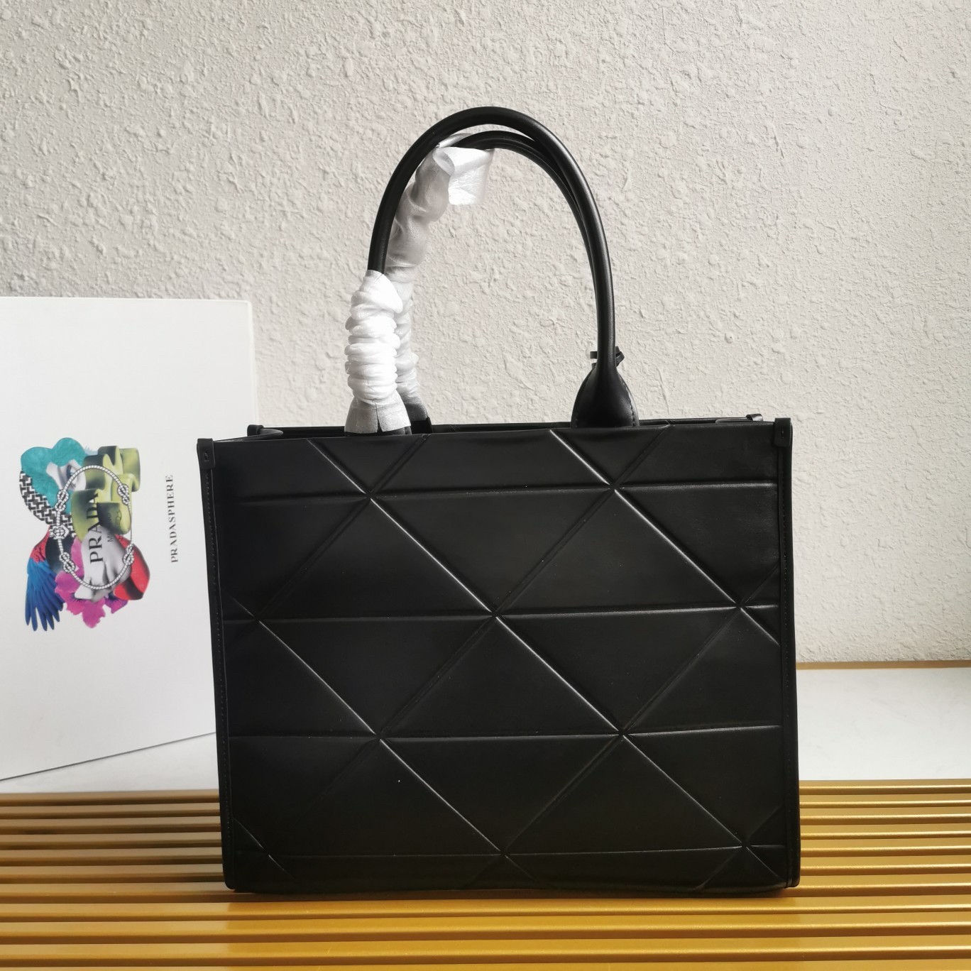 This leather handbag with a sleek, elegant design features a double handle and an internal leather keychain. The accessory infused with contemporary allure is characterized by the stitched motif that echoes the iconic geometric shape of the brand. The metal lettering logo decorates the front of the bag.