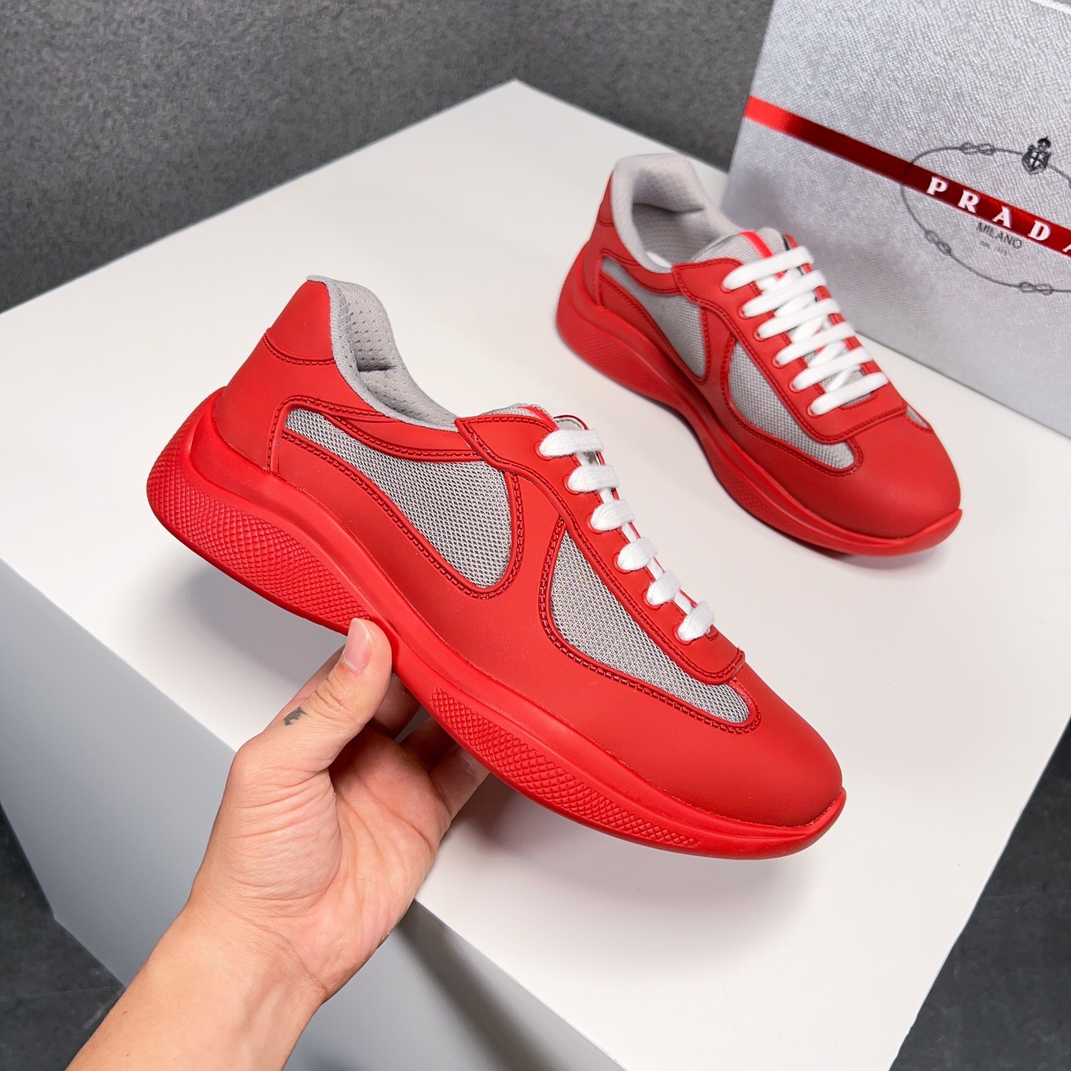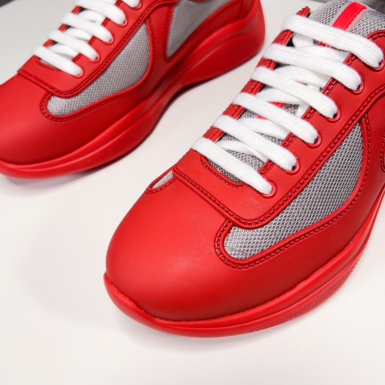 The America's Cup sneaker, which is part of the Prada identity, is reinvented with new materials and colors that instill it with a new contemporary spirit. Originally designed in the '90s for the Luna Rossa crew, the laced shoe inspired by the sailing world is now presented in a combination of colored rubber and bike fabric. The Prada Linea Rossa logo emphasizes the timeless attitude of this style.