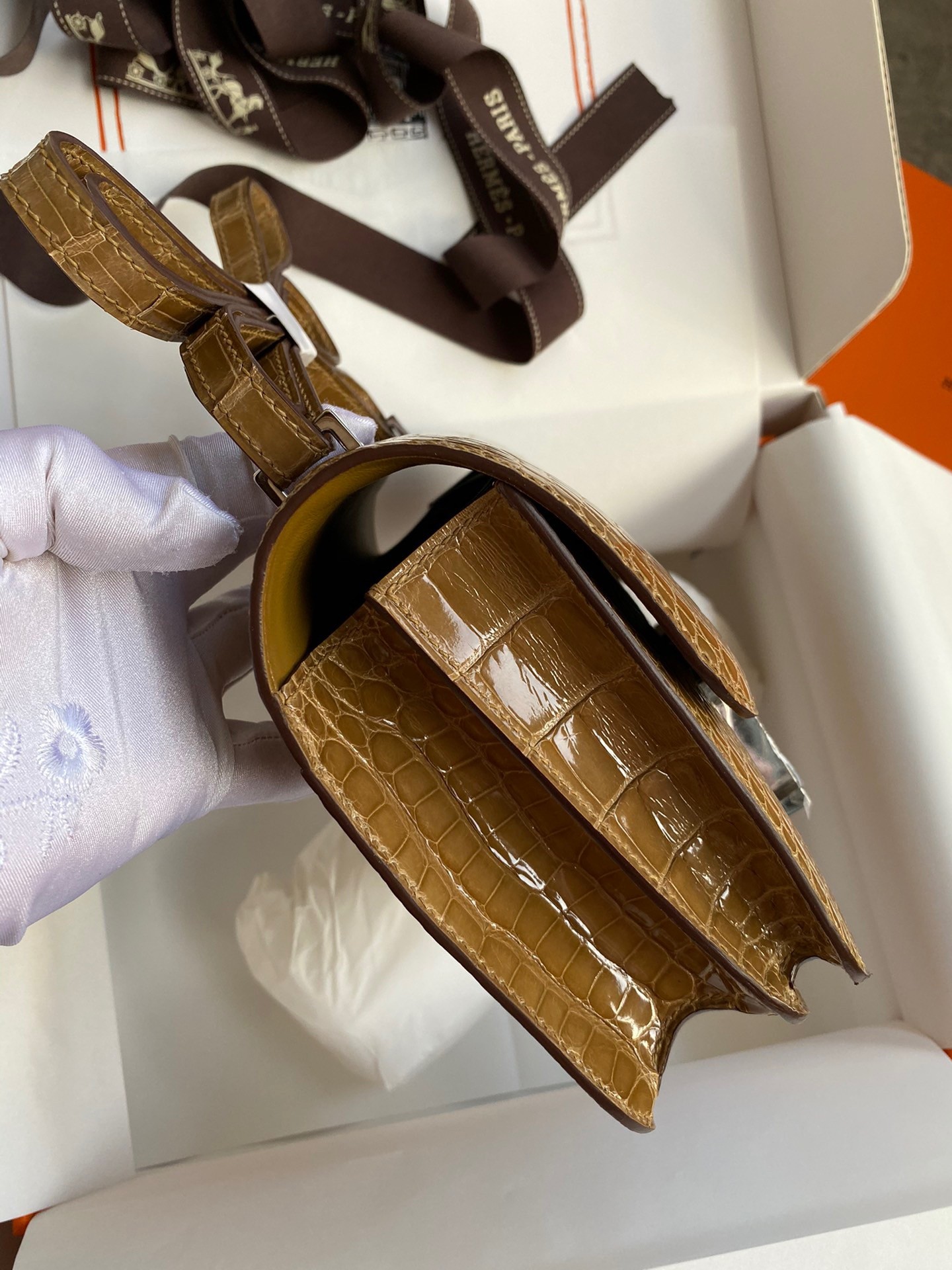 Introduced in 1969, the Hermès Constance quickly became one of the most highly sought-after of the brand’s luxury bags, behind only the Kelly bag and the Birkin. The Hermès Constance 18 is a stylish shoulder bag designed with versatility in mind. The Constance 18, also referred to as the Hermès Constance Mini. The squarish shape and large, prominent “H” closure across the front give this bag a youthful appeal, even when rendered in a sophisticated Shiny Alligator skin. A skin that comes from the Mississippi Alligator, this leather is created by polishing the spots with agate for a Shiny finish.