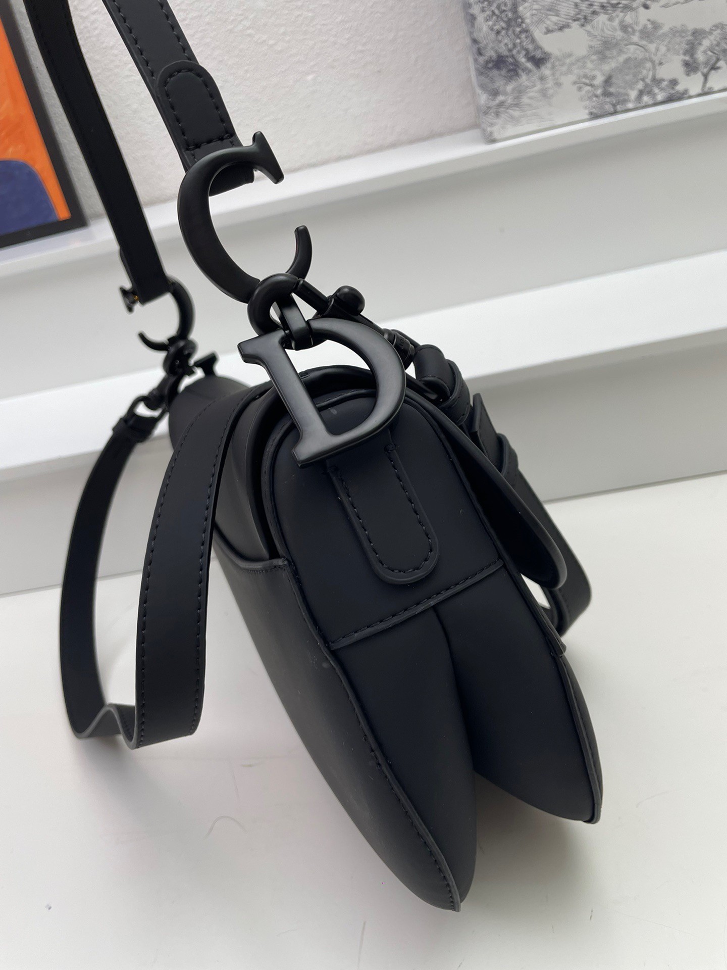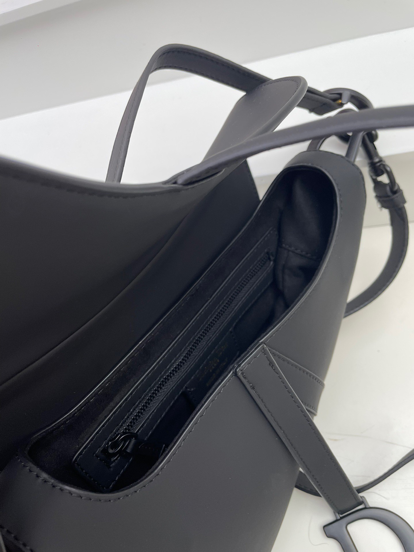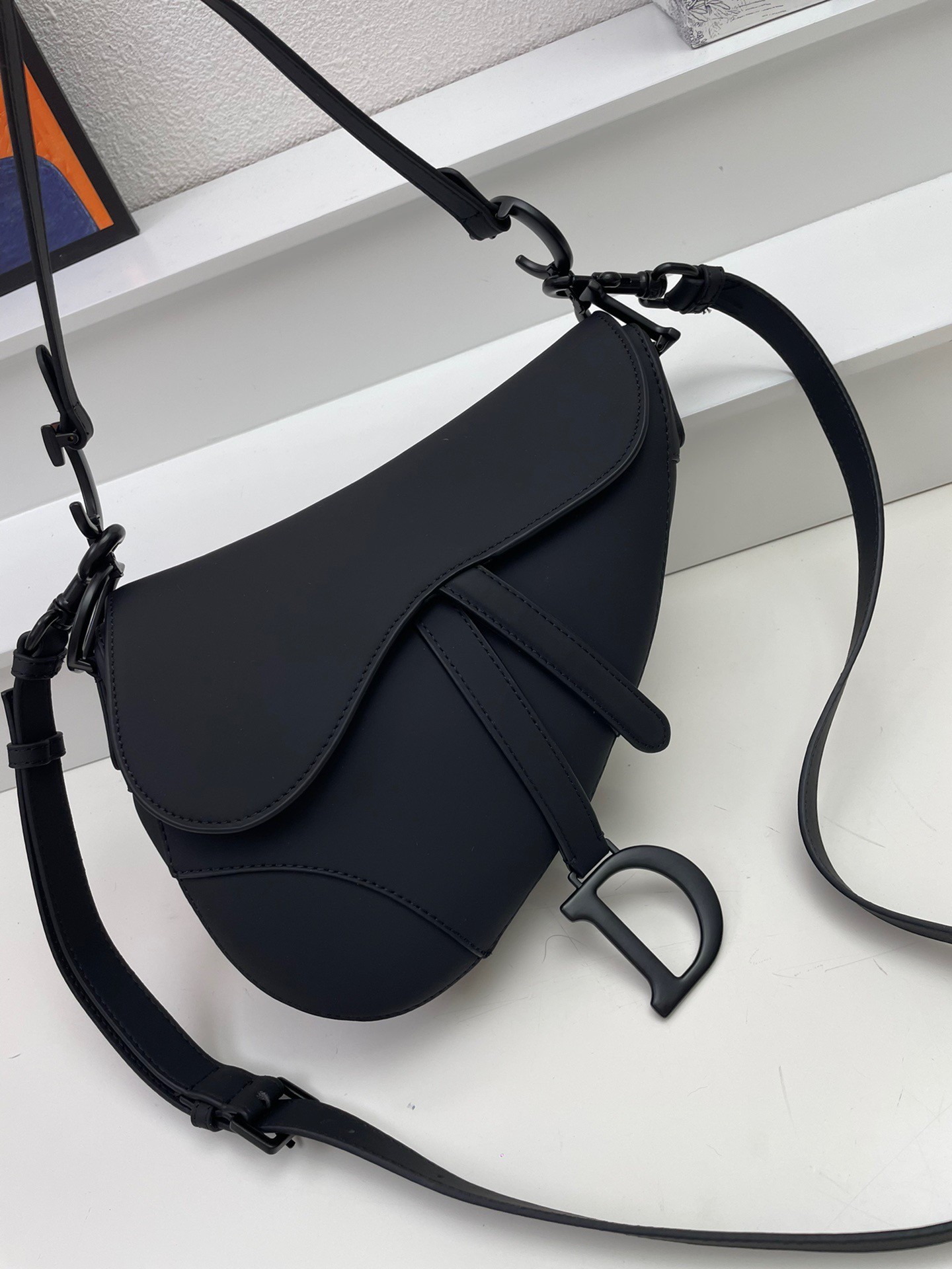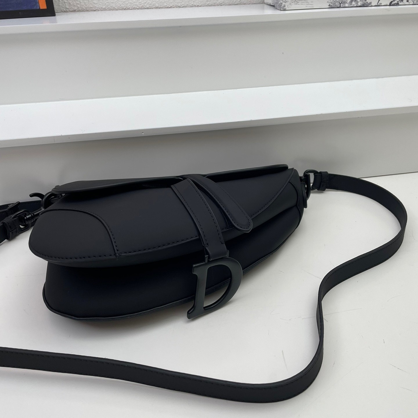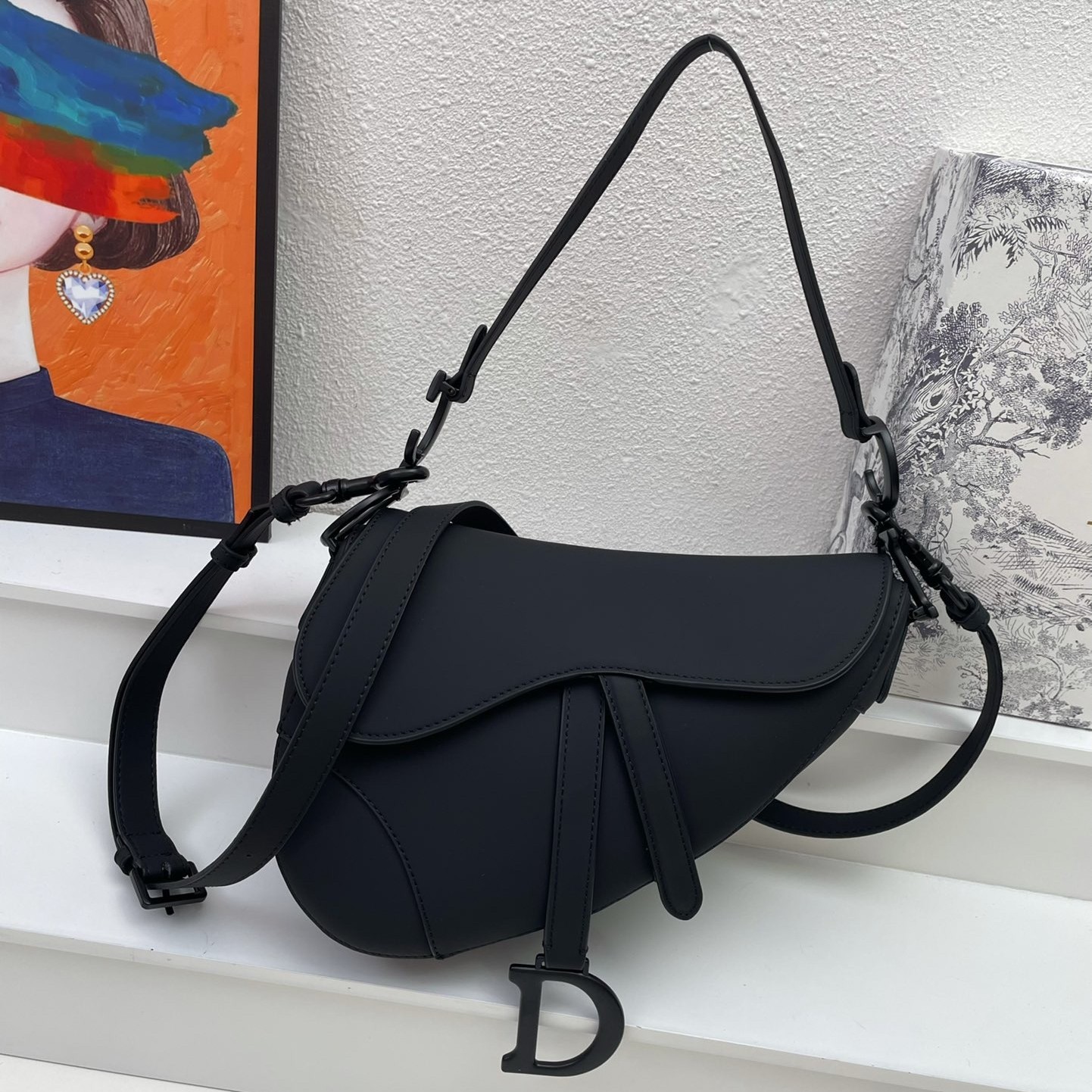 Maria Grazia Chiuri brings a fresh update to the iconic Saddle bag. Crafted in black ultramatte calfskin, the legendary design presents a Saddle flap with a magnetic D stirrup clasp, as well as a tonal-finish metal CD signature on either side of the strap. Featuring a thin, adjustable and removable shoulder strap, the Saddle bag may be carried by hand, worn over the shoulder or crossbody.