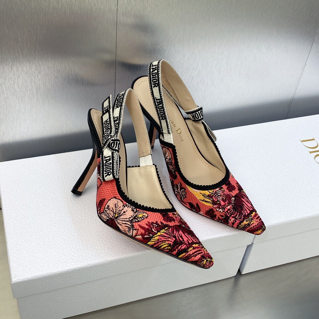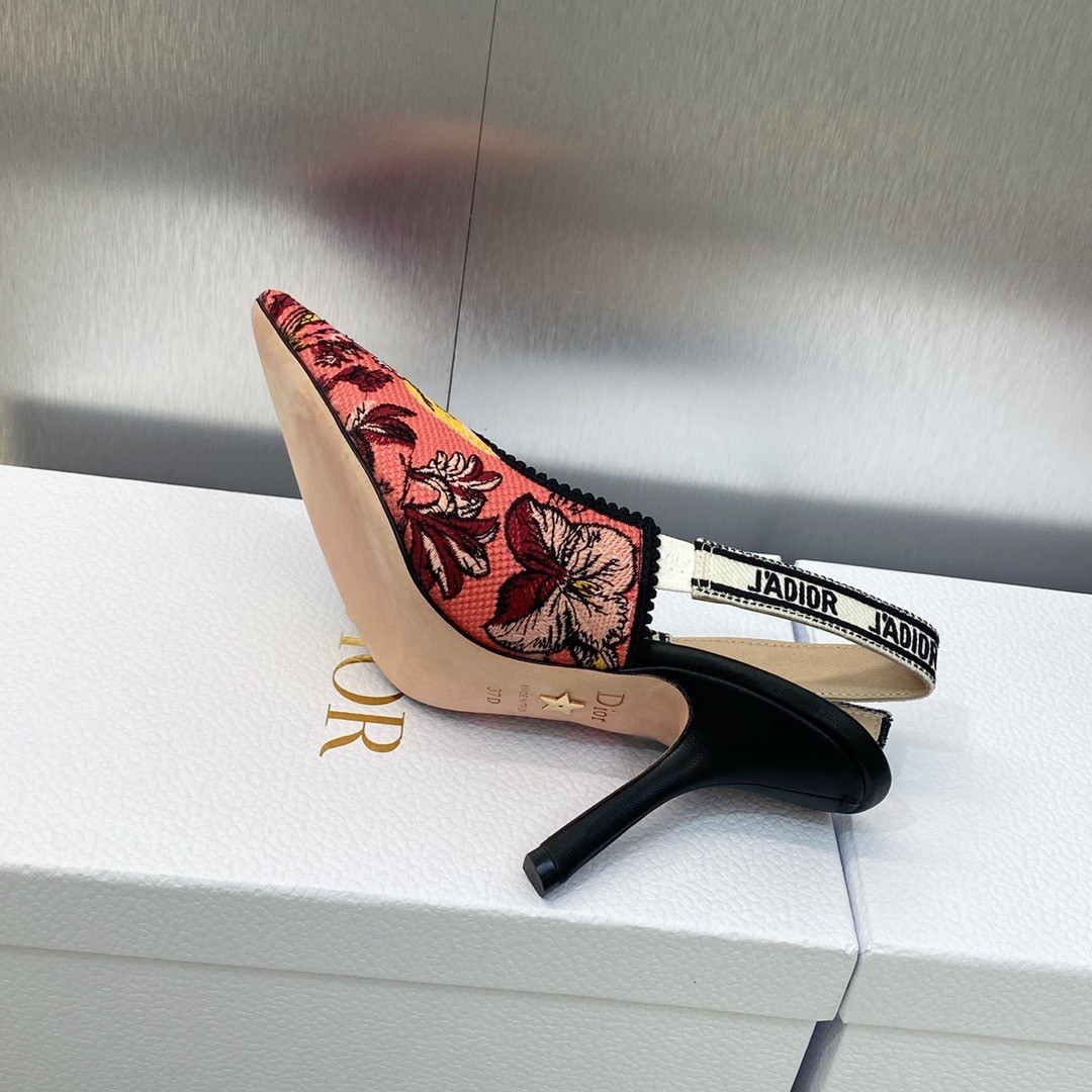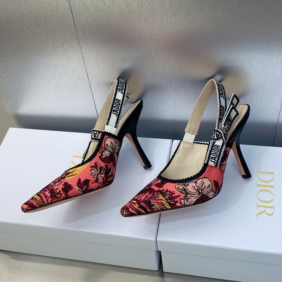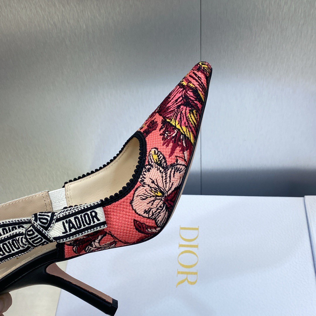 The J'Adior slingback pump is an exceptional example of House savoir-faire. The style reveals the rani pink multicolor Toile de Jouy Voyage motif by Pietro Ruffo, setting Mr. Dior's iconic pattern in the heart of Indian flora and fauna. The two-tone J'Adior signature embroidered cotton ribbon, bow and 10 cm comma heel complete the elegant and refined design.