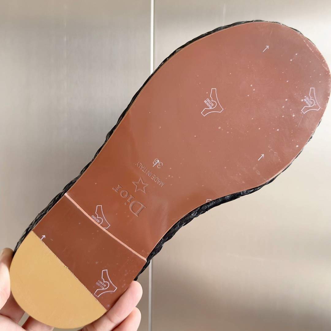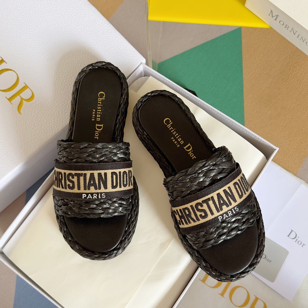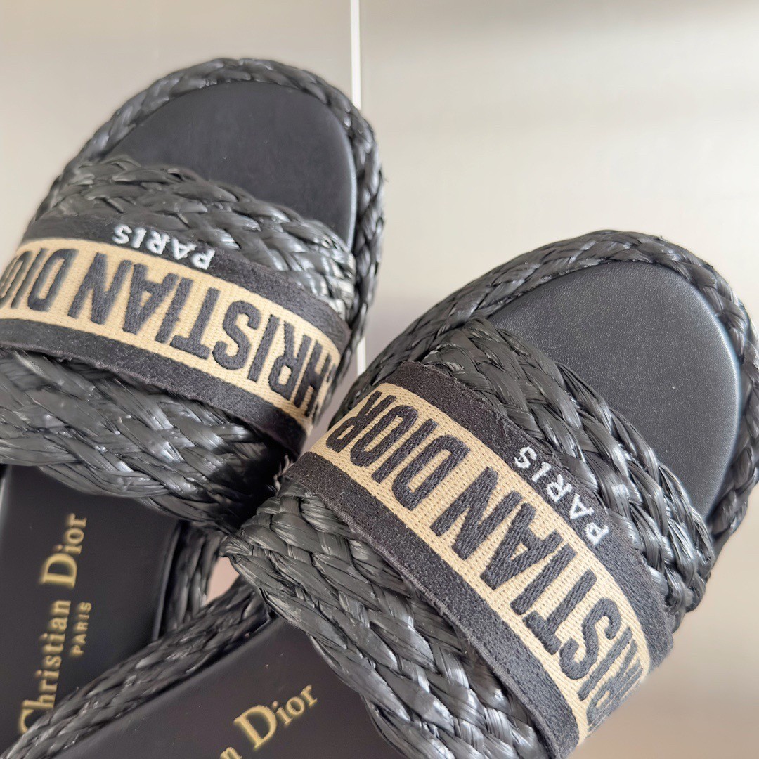 The Dway slide has a timeless and emblematic silhouette. A refined pairing of jute-colored raffia and cotton, the slide's Christian Dior Paris embroidered upper instantly stands out. The shoe offers effortless style, with a leather insole completed by quilted padding for ultimate comfort. Its streamlined design allows it to be easily slipped on to complete a laid-back outfit.