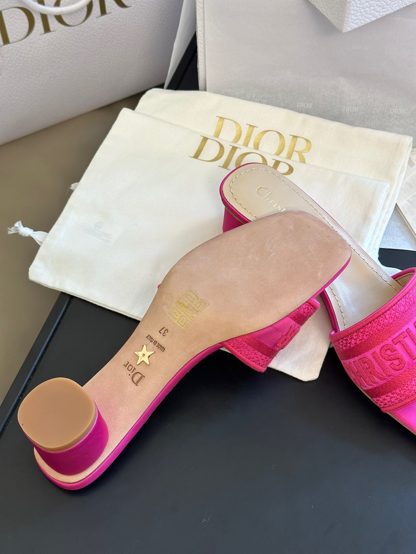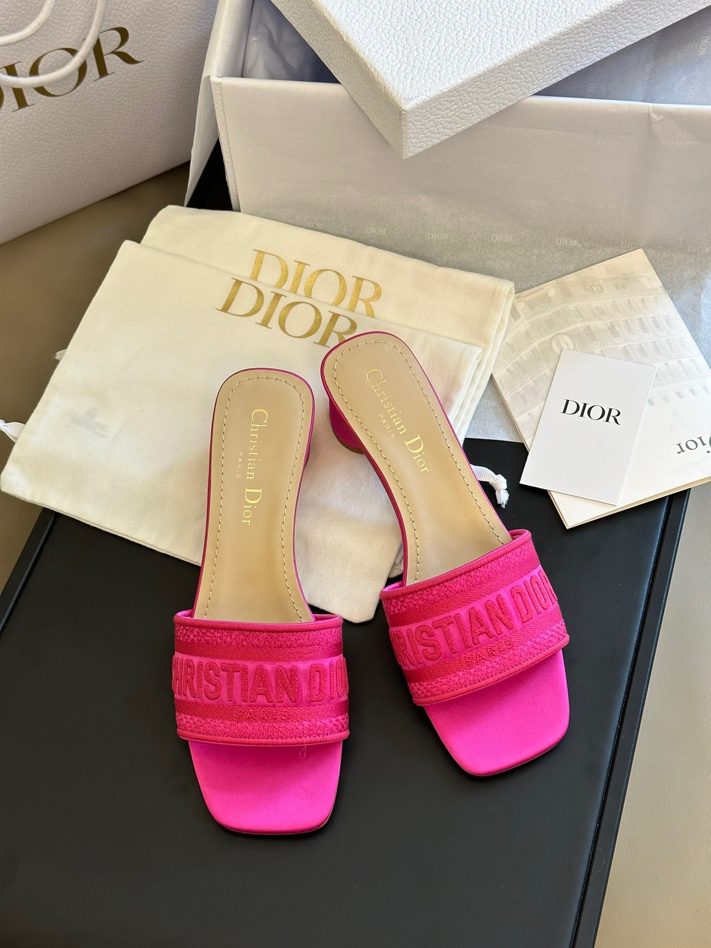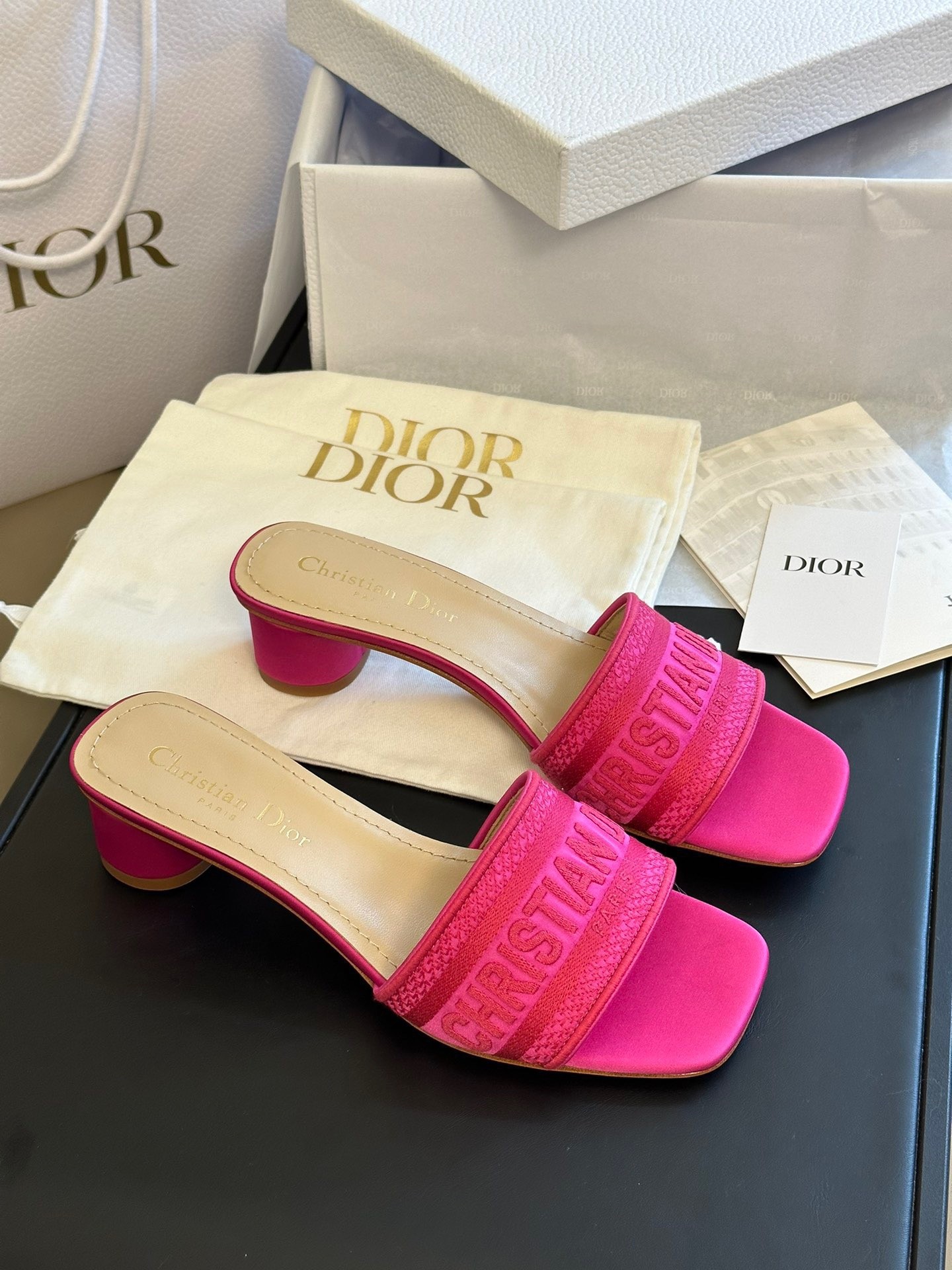 The Dway heeled slide revisits a hallmark creation in a modern variation. Crafted in rani pink embroidered satin and cotton, it showcases the Christian Dior Paris signature embroidered on the upper as well as a very contemporary square toe. Completed by a 3.5 cm cylindrical heel, the slide will lend a modern touch to any attire.