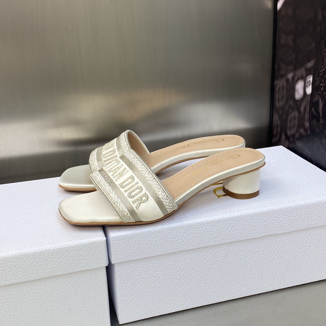 Part of the Dior Or capsule, the Dway heeled slide revisits a hallmark creation in a modern variation. Crafted in gold-tone satin embroidered with metallic thread, it showcases the Christian Dior Paris signature embroidered on the upper as well as a very contemporary square toe. Completed with a 3.5 cm cylindrical heel, the slide will lend a modern touch to any attire and will pair effortlessly with other Dior Or creations.