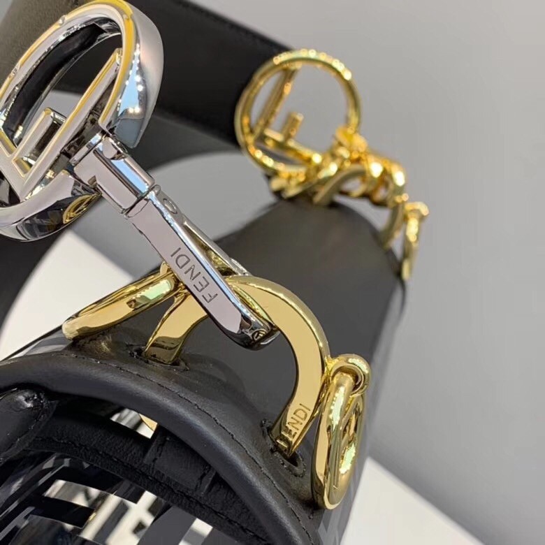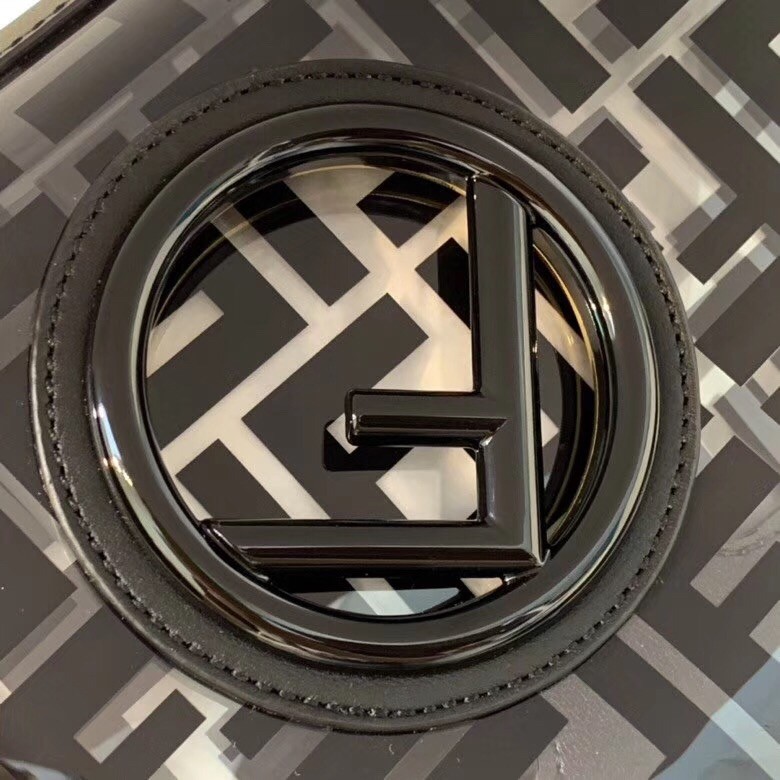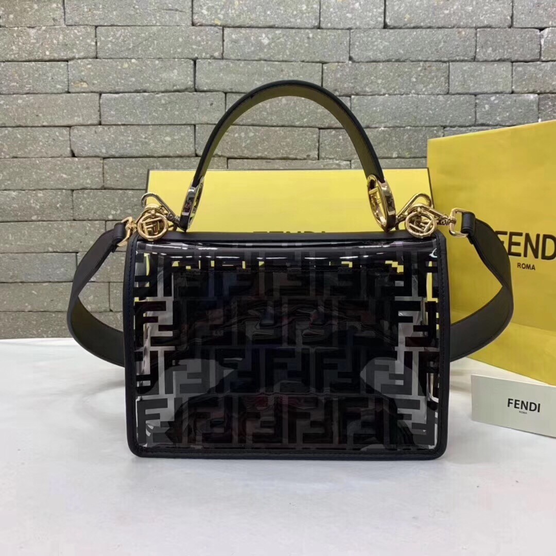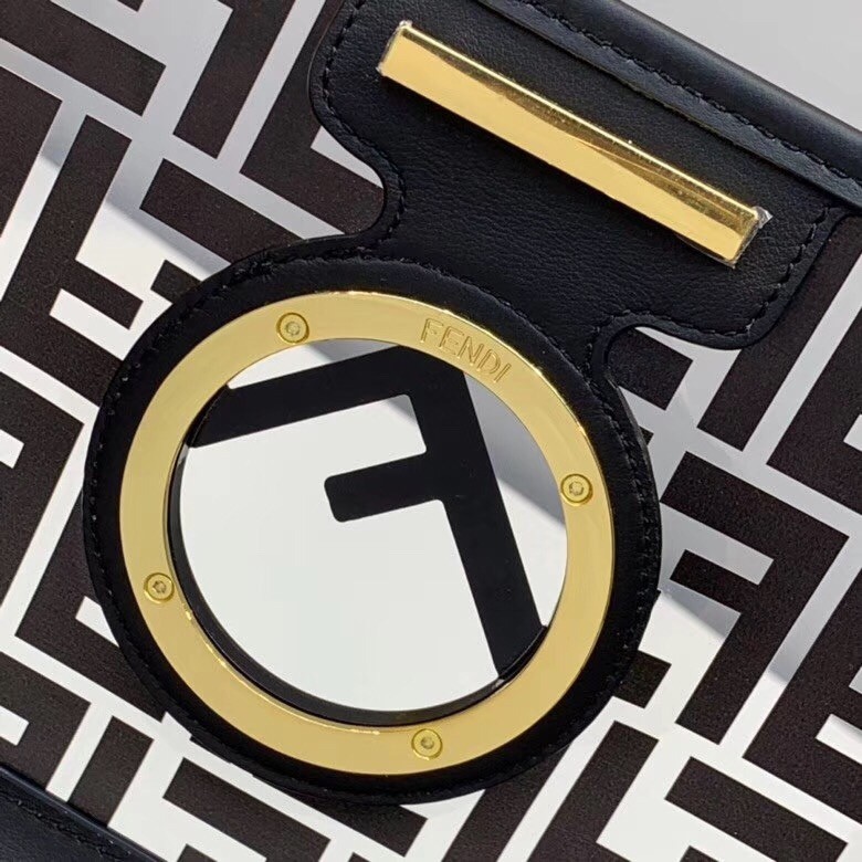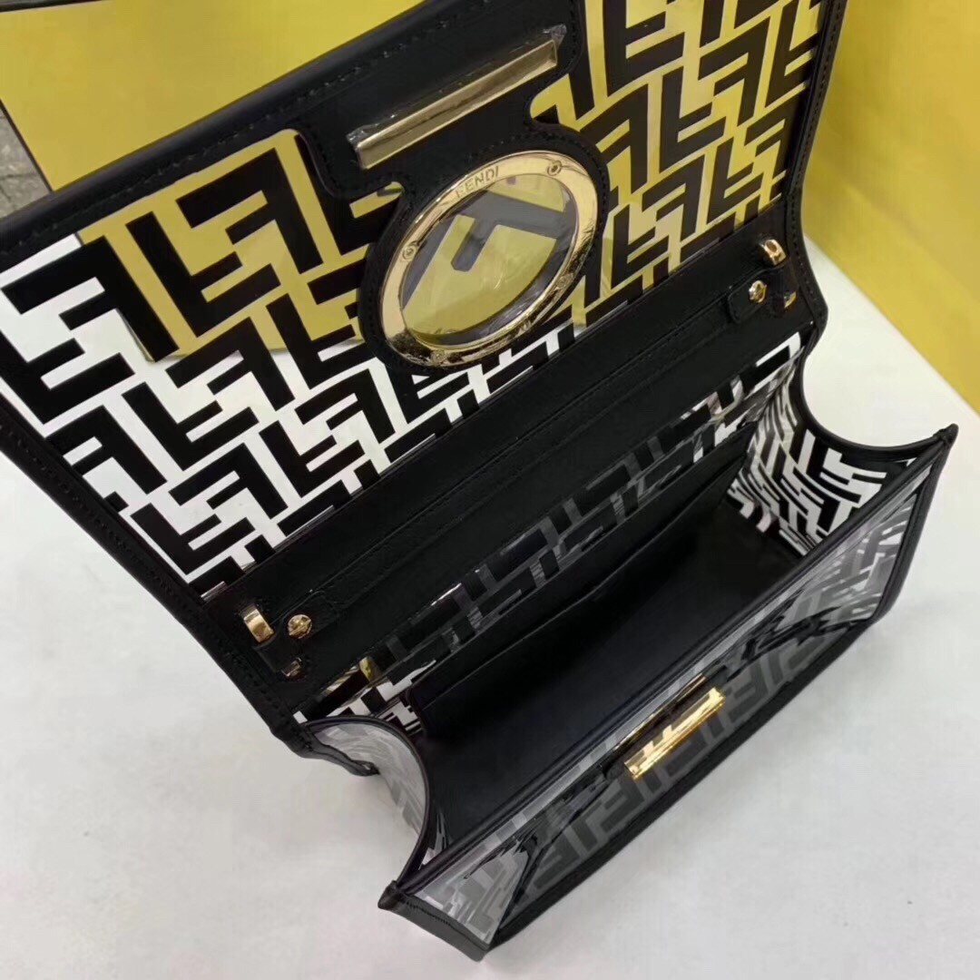 The FF logo steals the spotlight of Fendi’s latest collection, adding elegance and luxury to its designs. Expect to see it as a bold graphic print or as a stylish metal embellishment. Transparent PVC trimmed with White leather Kan I F shoulder bag from Fendi features a top handle, a detachable shoulder strap, a foldover top, a main internal compartment, gold and silver-tone hardware, hand-painted FF motifs all over and the new Fendi logo on the front.