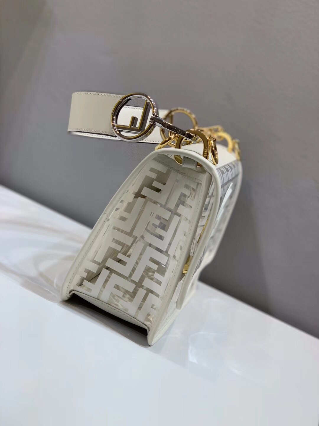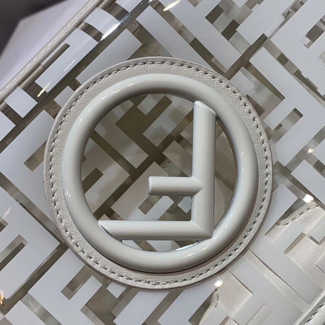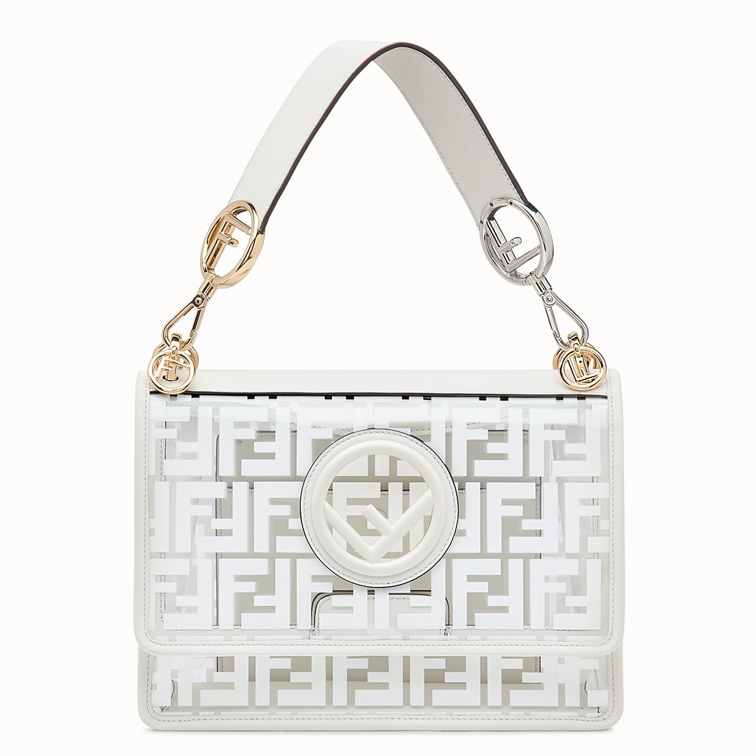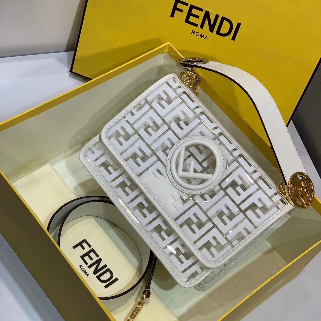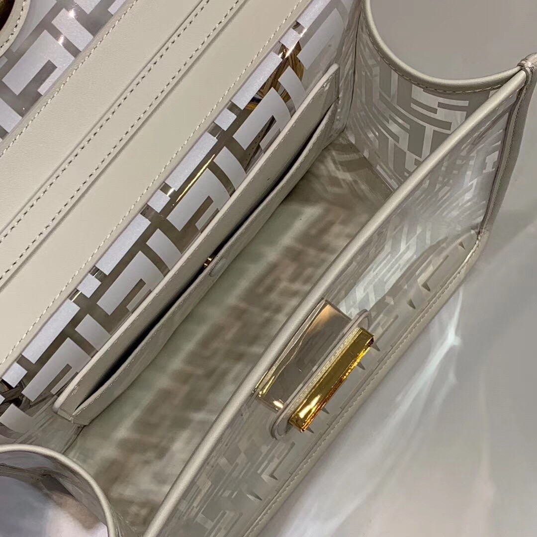 The FF logo steals the spotlight of Fendi’s latest collection, adding elegance and luxury to its designs. Expect to see it as a bold graphic print or as a stylish metal embellishment. Transparent PVC trimmed with White leather Kan I F shoulder bag from Fendi features a top handle, a detachable shoulder strap, a foldover top, a main internal compartment, gold and silver-tone hardware, hand-painted FF motifs all over and the new Fendi logo on the front.