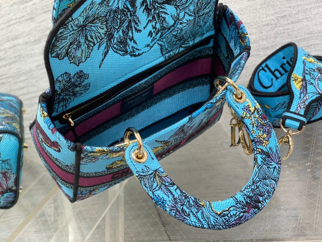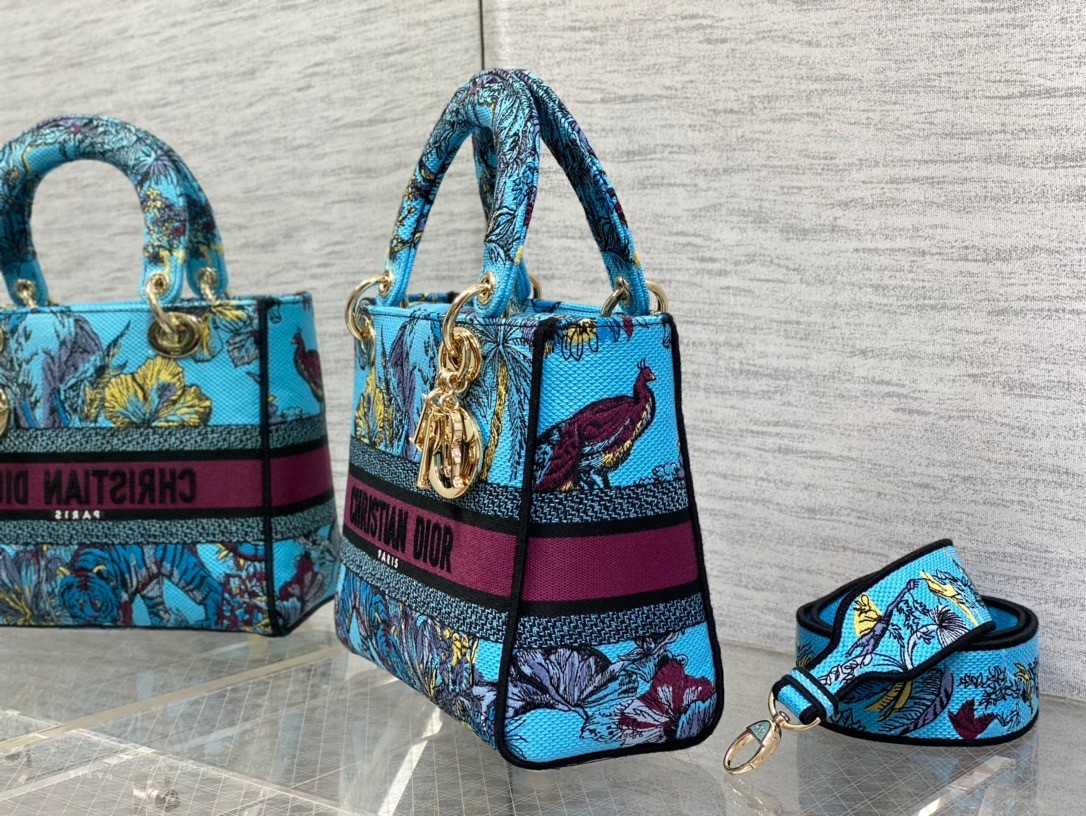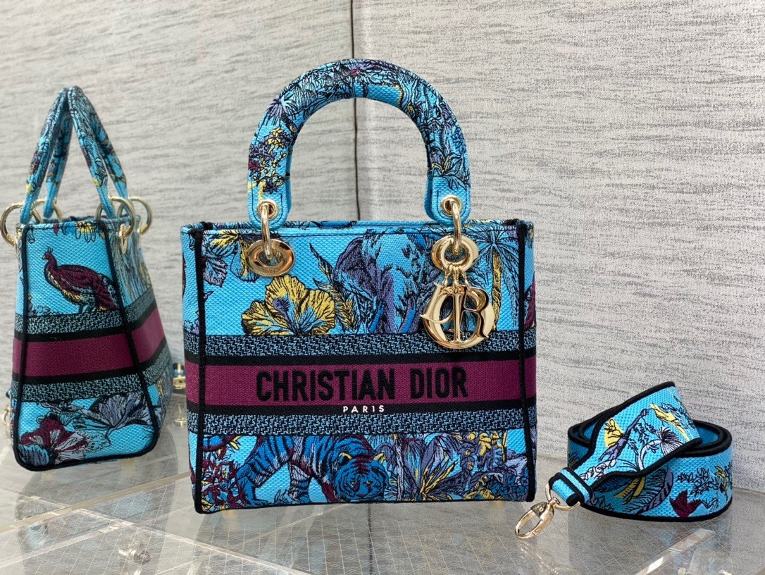 The Lady D-Lite bag embodies the House's vision of elegance and beauty. Refined and timeless, the creation is entirely embroidered with the multicolor Toile de Jouy Voyage motif by Pietro Ruffo, setting Mr. Dior's iconic pattern in the heart of Indian flora and fauna. Pale gold-finish metal D.I.O.R. charms embellish and illuminate the silhouette. Featuring a reversible and removable wide, embroidered shoulder strap, the medium Lady D-Lite bag can be carried by hand or worn crossbody.