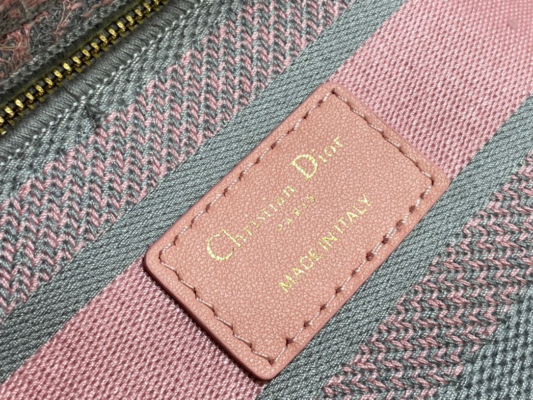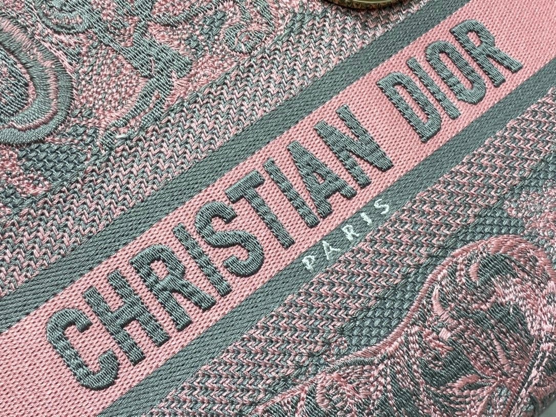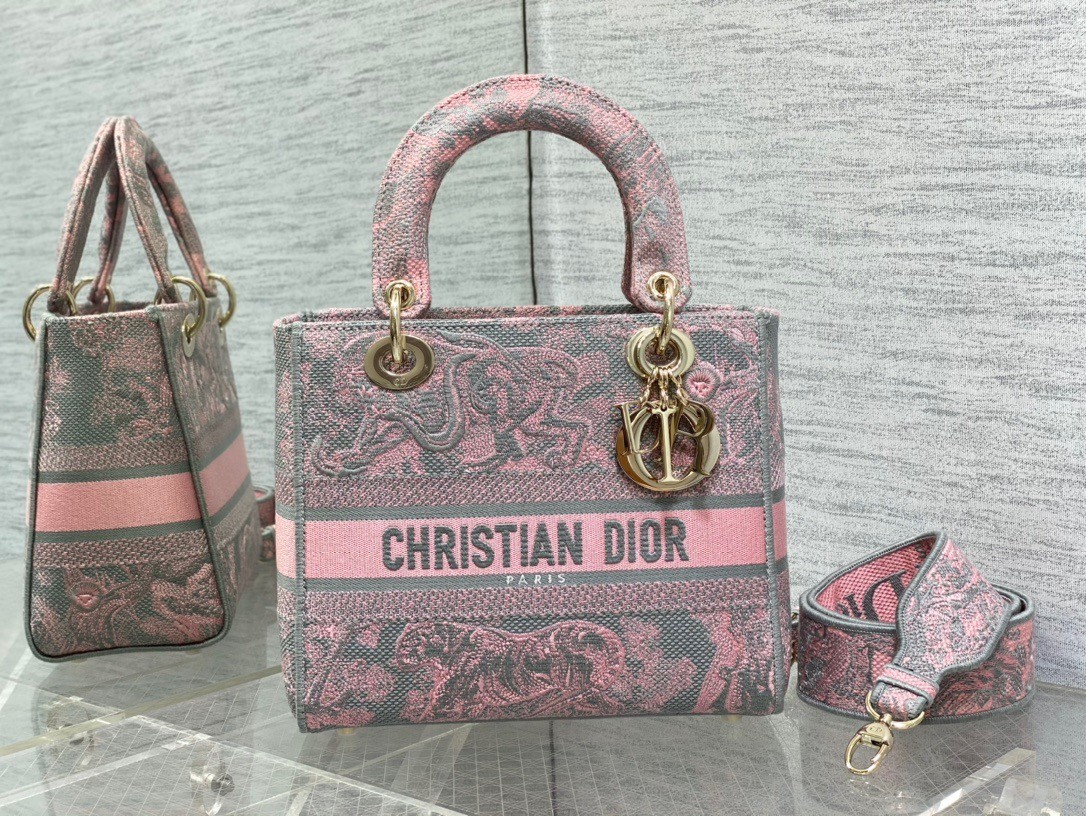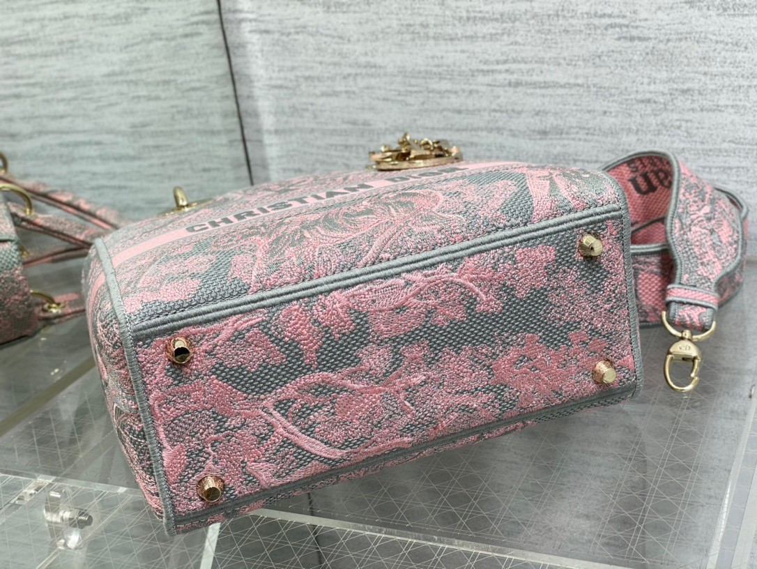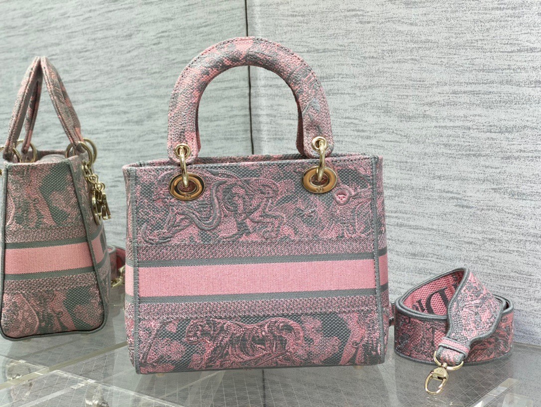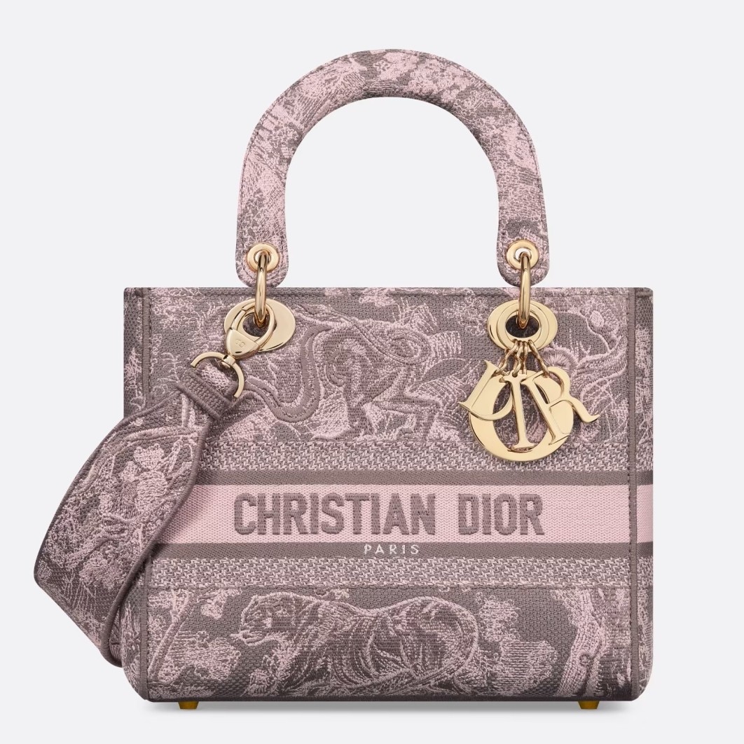 The Lady D-Lite bag combines classic elegance with House modernity. The style is fully embroidered with the gray and pink Toile de Jouy Reverse motif, a variation of the hallmark House pattern with a play on reversed colors. The front features a Christian Dior Paris signature while the thick D.I.O.R. charms in pale gold-finish metal enhance the silhouette. Equipped with a wide, reversible and removable embroidered shoulder strap, the medium Lady D-Lite bag can be carried by hand or worn crossbody.