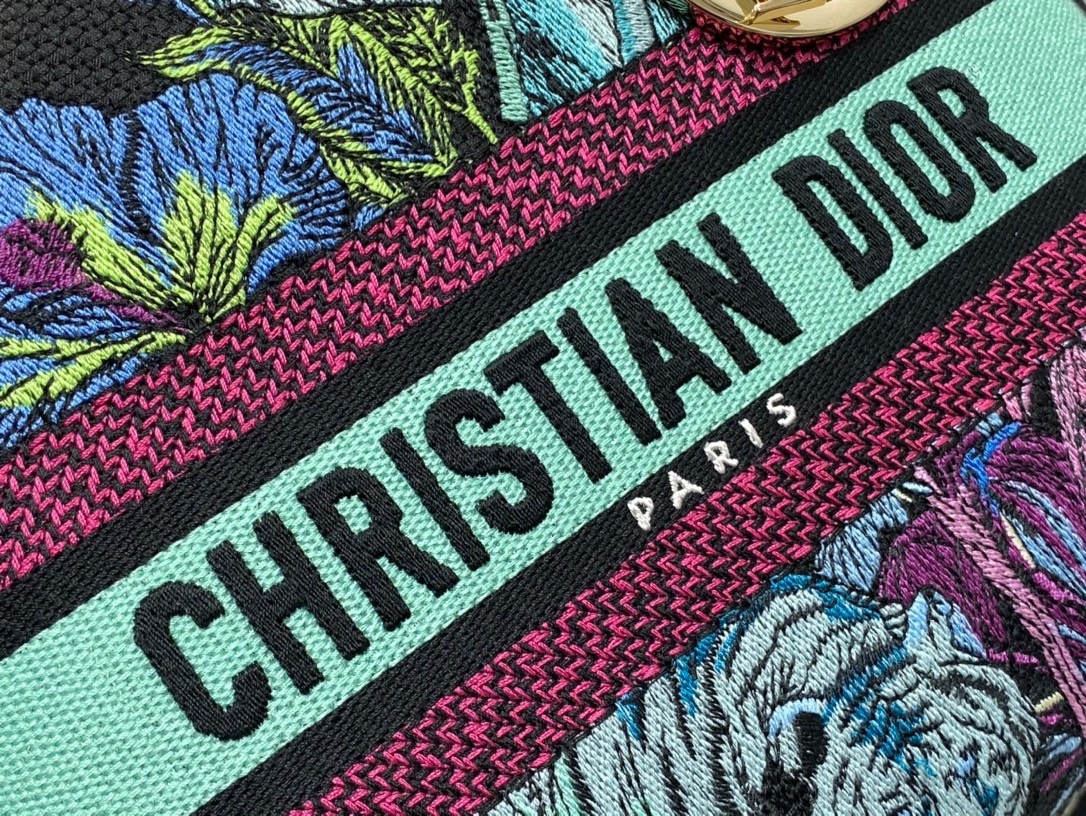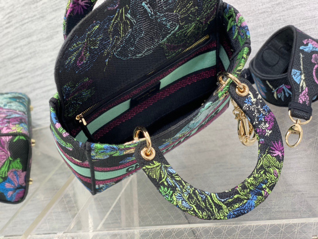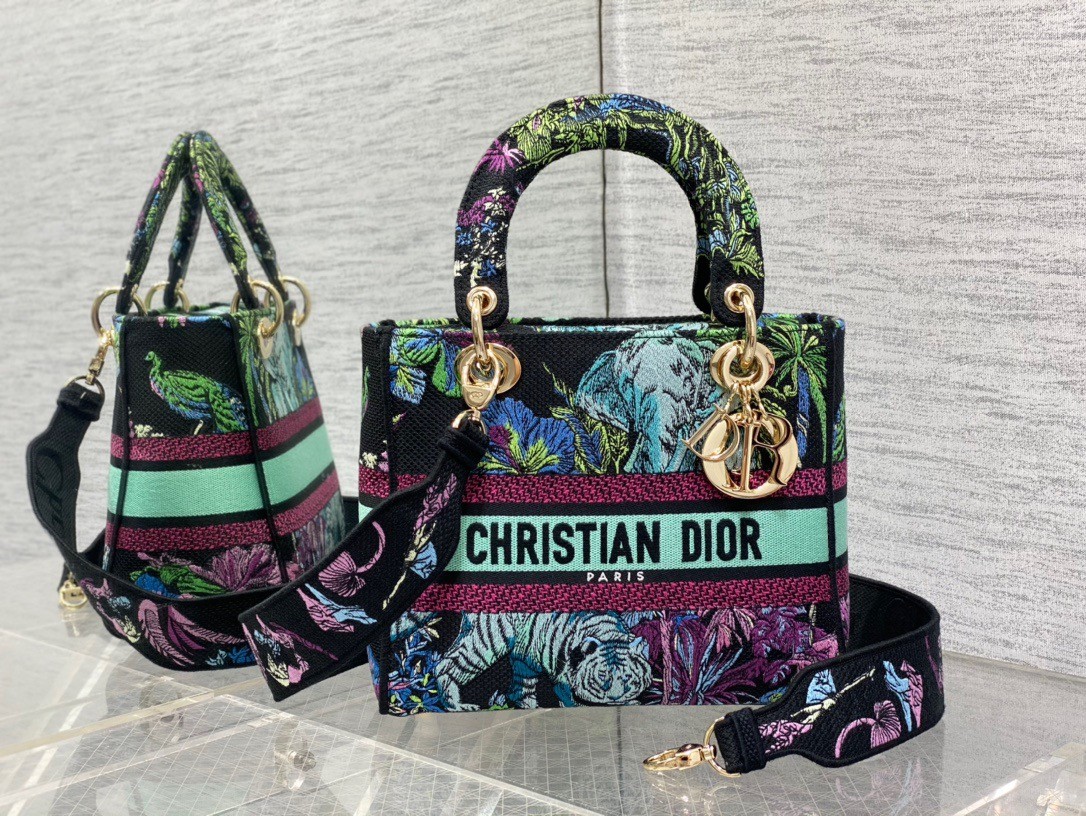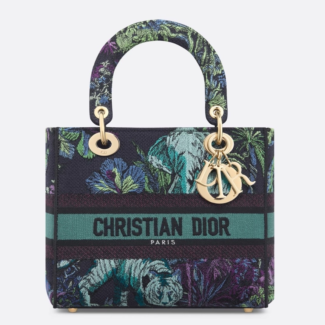 The Lady D-Lite bag embodies the House's vision of elegance and beauty. Refined and timeless, the creation is entirely embroidered with the blue multicolor Toile de Jouy Voyage motif by Pietro Ruffo, setting Mr. Dior's iconic pattern in the heart of Indian flora and fauna. Pale gold-finish metal D.I.O.R. charms embellish and illuminate the silhouette. Featuring a reversible and removable wide, embroidered shoulder strap, the medium Lady D-Lite bag can be carried by hand or worn crossbody.