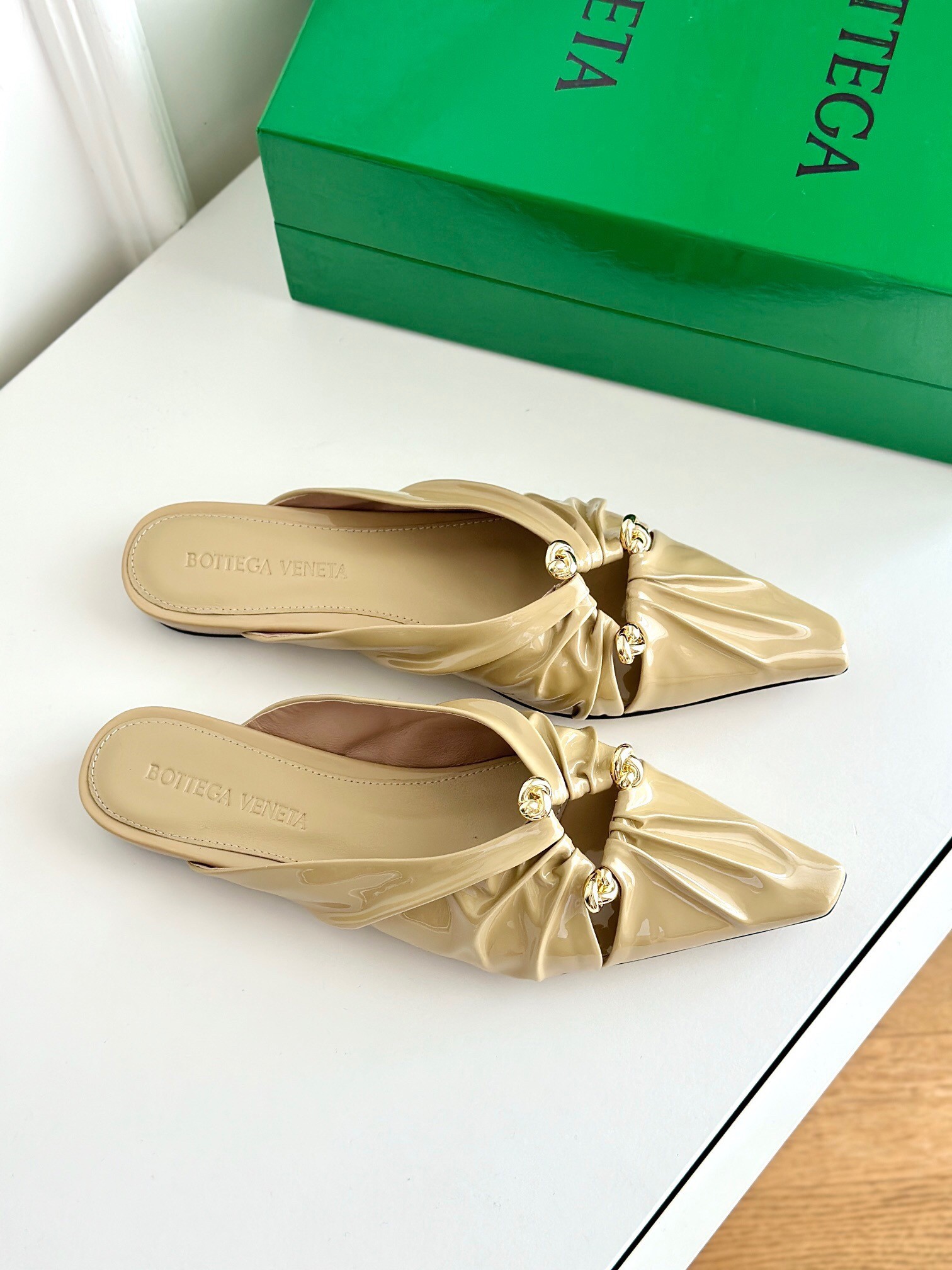 Bottega Veneta Bunnie Flat Mules In Beige Patent Leather