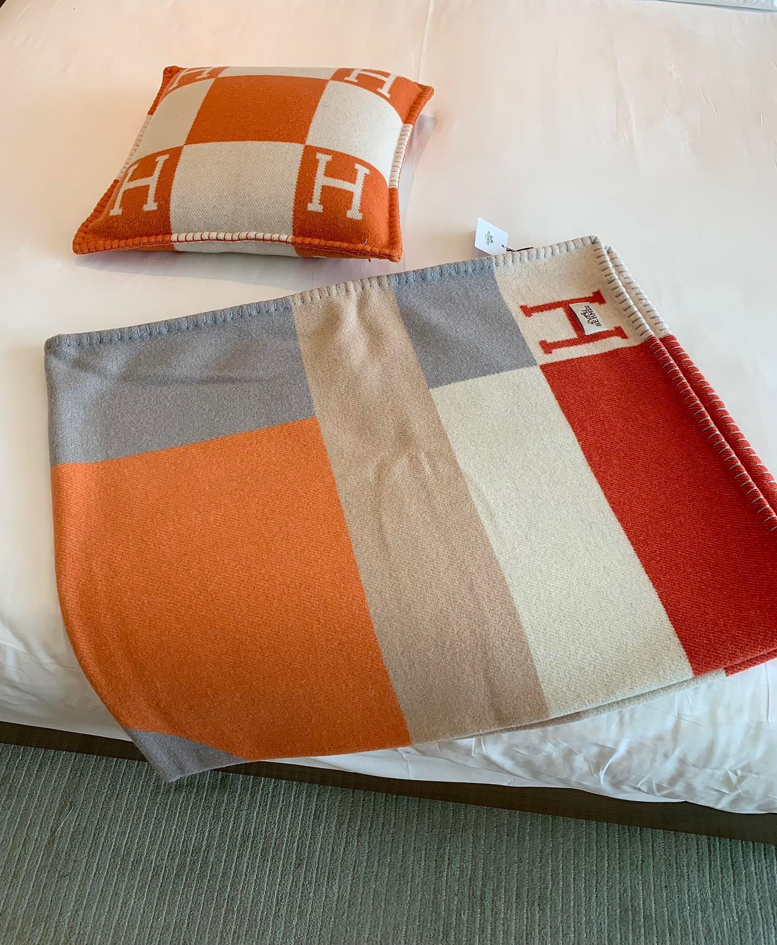 Revealed by a hand-woven jacquard weave, the graphic motifs of this line of cashmere blankets and cushions are inspired by a 1929 Hermès advertising poster. Refined and stylized by the Hermès design studio, it became the H Drapeau design, while its graphic and colorful lines are reminiscent of the emblematic Avalon blanket. The composition of the drawing and juxtaposed lines reinforces the interplay of colors and contrasts to give the appearance of a superimposed material.
