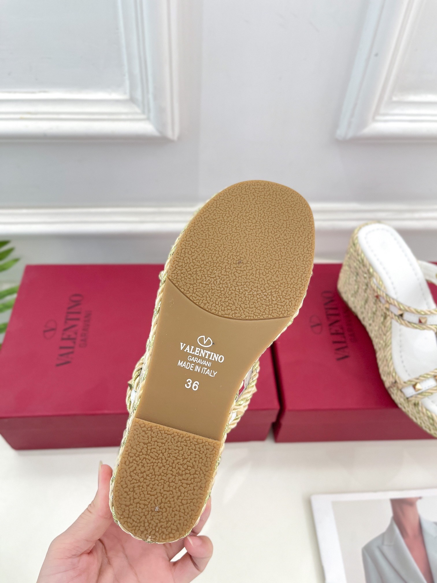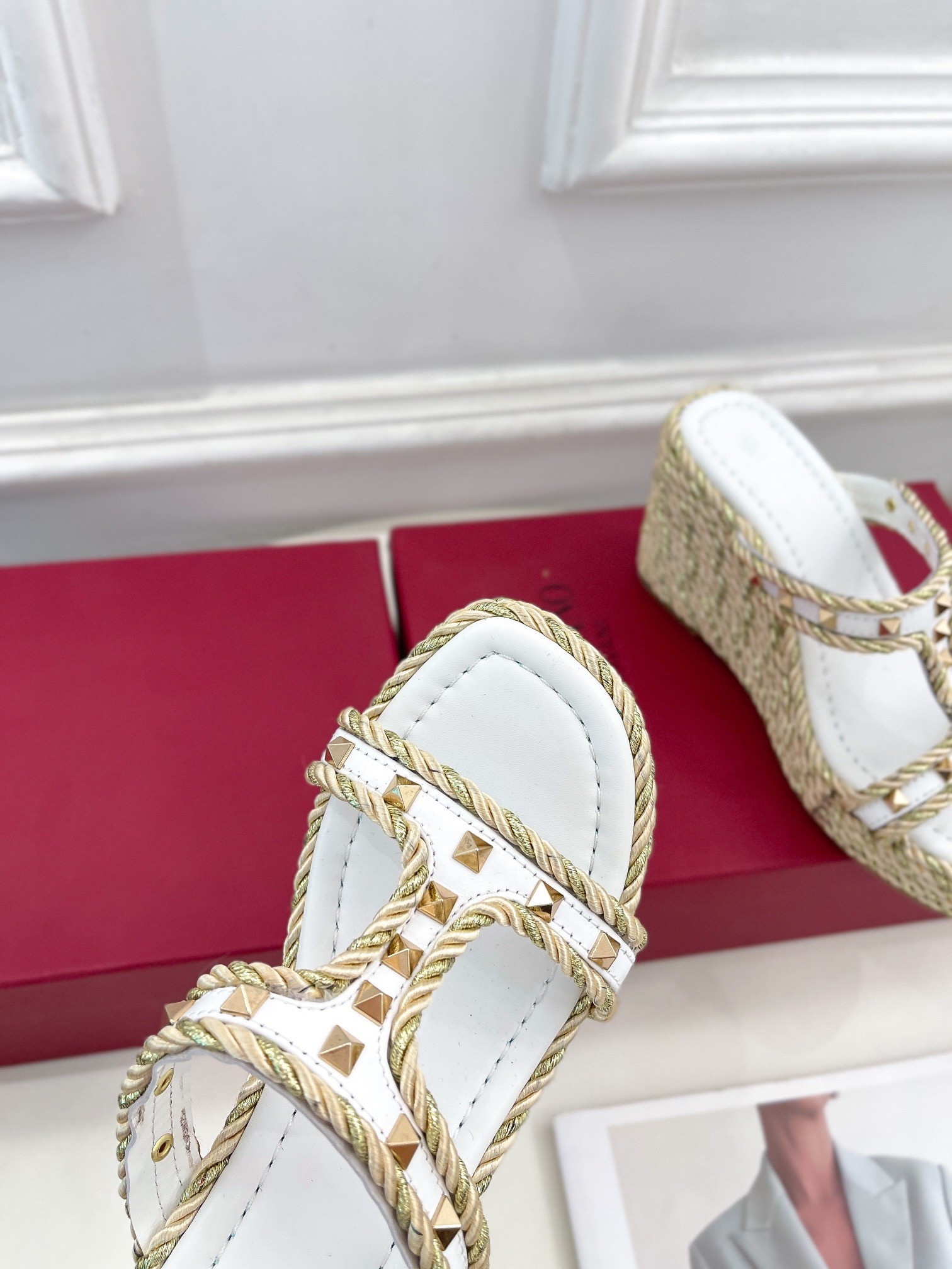 Making sure not to compromise comfort for towering height, Valentino Garavani sets its striking Rockstud sandals atop a practical woven wedge heel. Named after the scattered Rockstud accents that adorn its elegant leather straps, this Italian-crafted style makes the case for wedges beyond the holiday season.