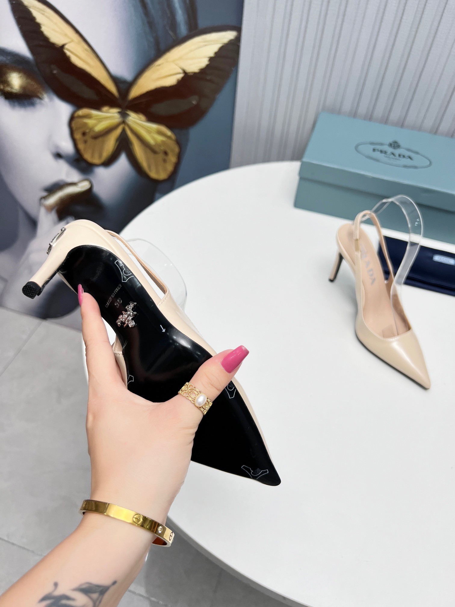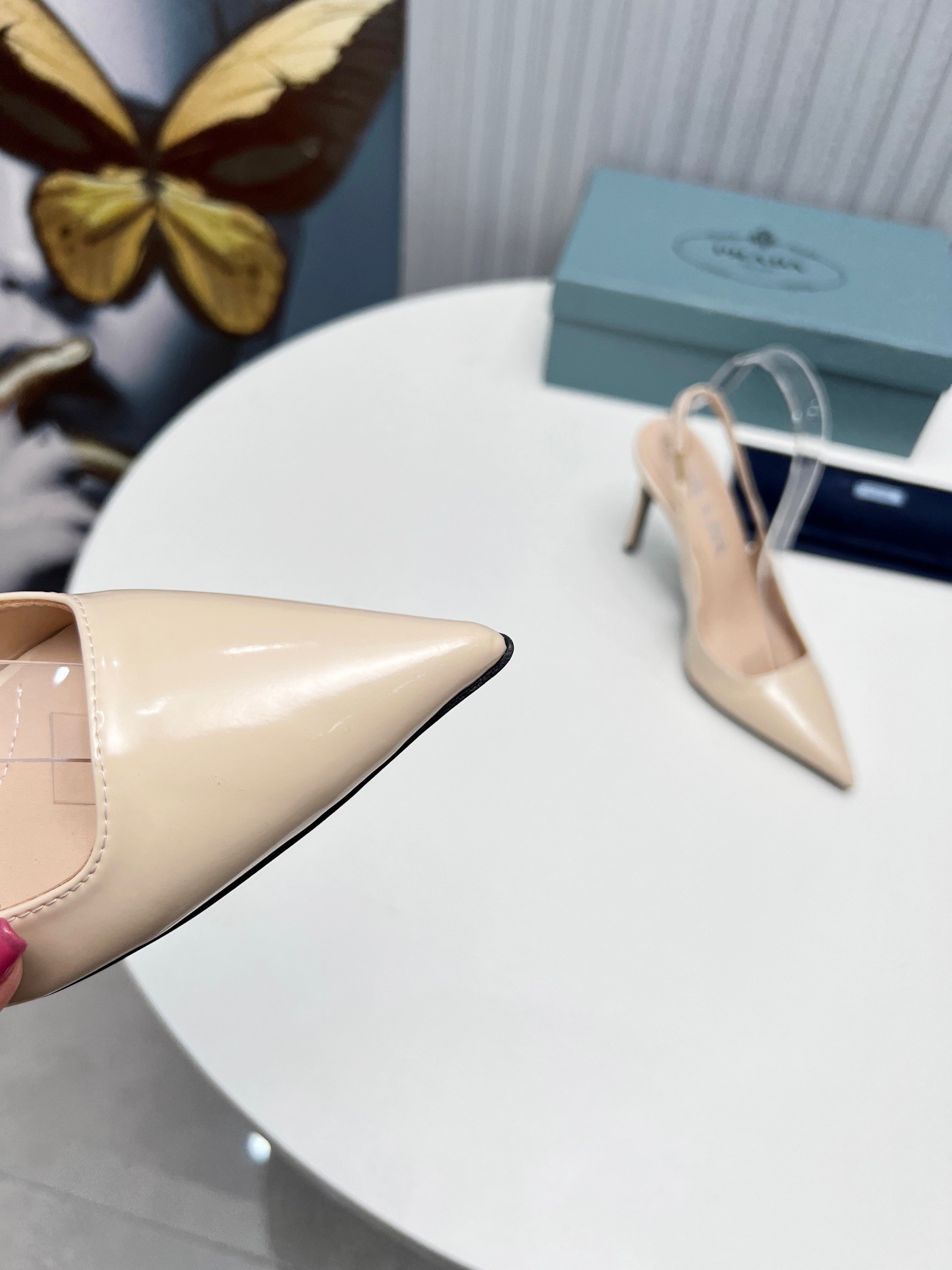 Prada presents an innovative take on the slingback style for SS23. Crafted from glossy patent leather, these tapered and sinuous slingbacks are embellished with the iconic enameled metal triangle logo.