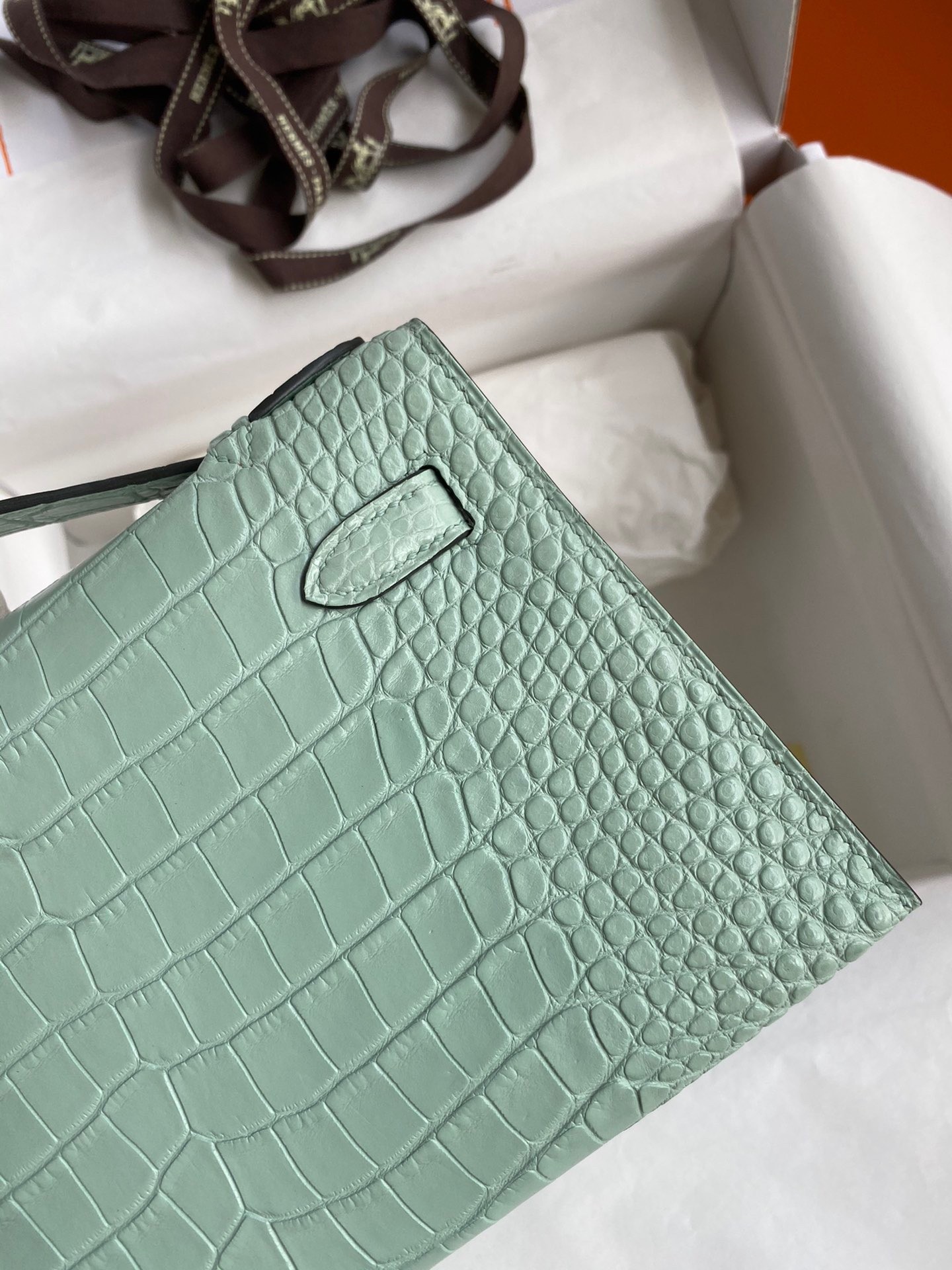 Hermes Kelly Pochette Handmade Bag In Vert D'eau Matte Alligator Leather