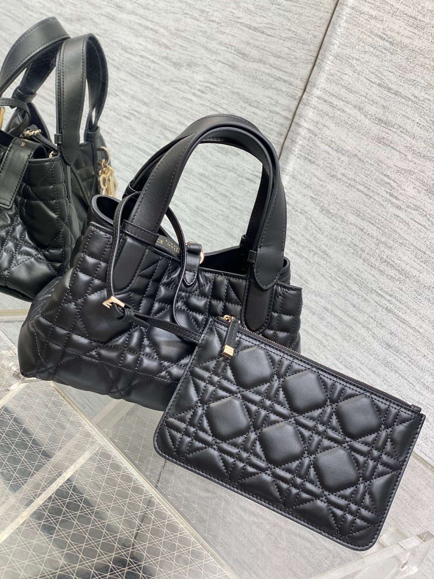 Unveiled at the Spring-Summer 2023 fashion show, the Dior Toujours bag is distinguished by a casual and practical design. Crafted in calfskin with Macrocannage topstitching, it showcases a spacious interior compartment with a matching pouch to organize essentials. Its leather strap closure keeps items secure while the D of the CD Lock closure twists to adjust the sides and enhance the bag's silhouette. Equipped with leather handles that can be adjusted using the small notches, the small bag can be effortlessly carried by hand.