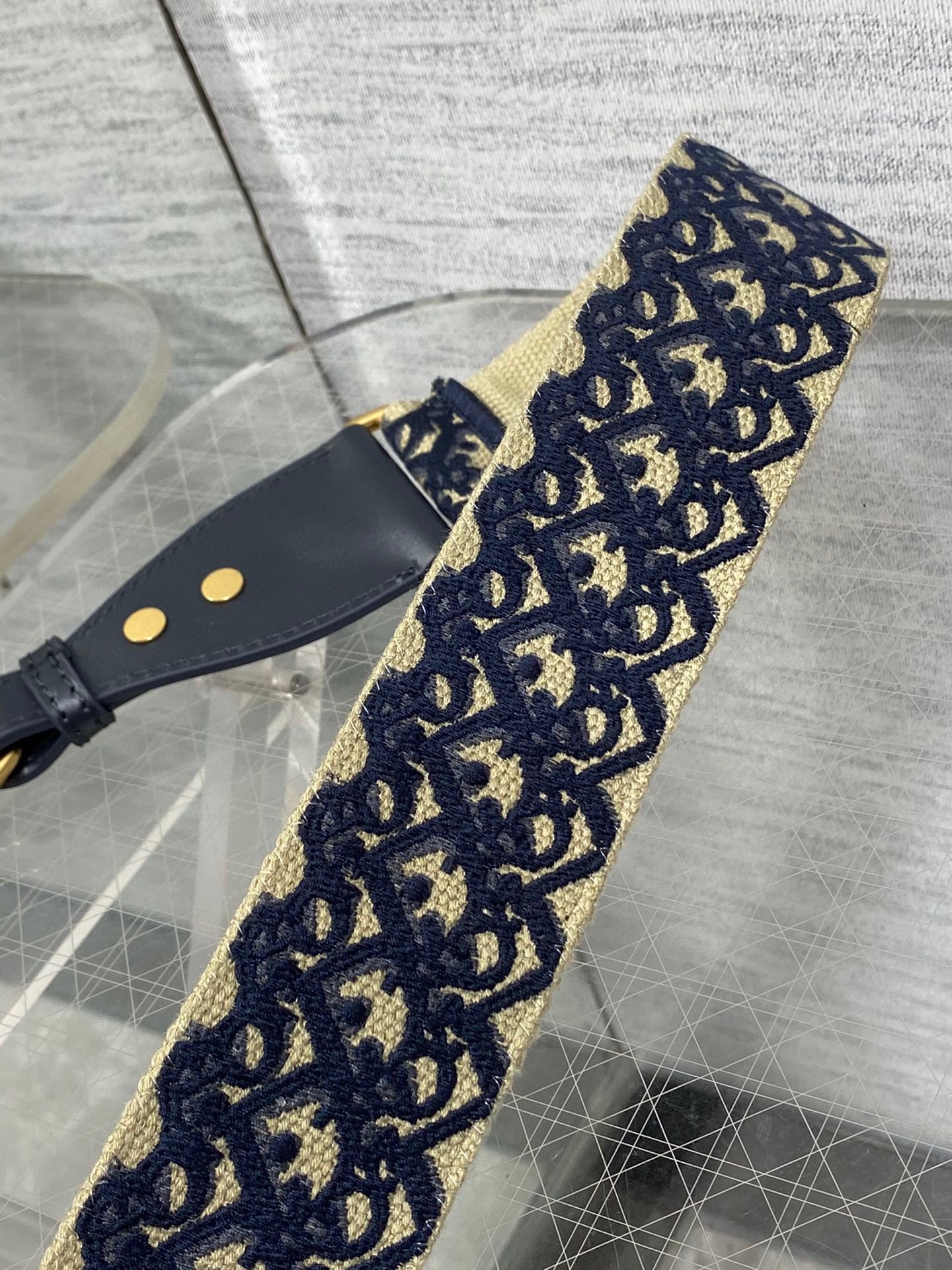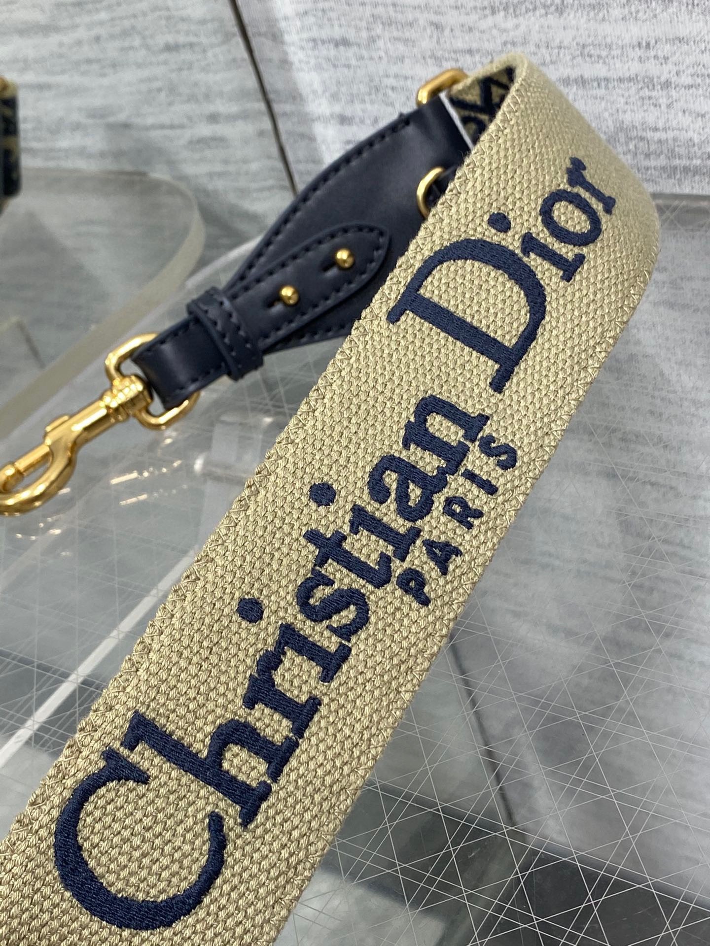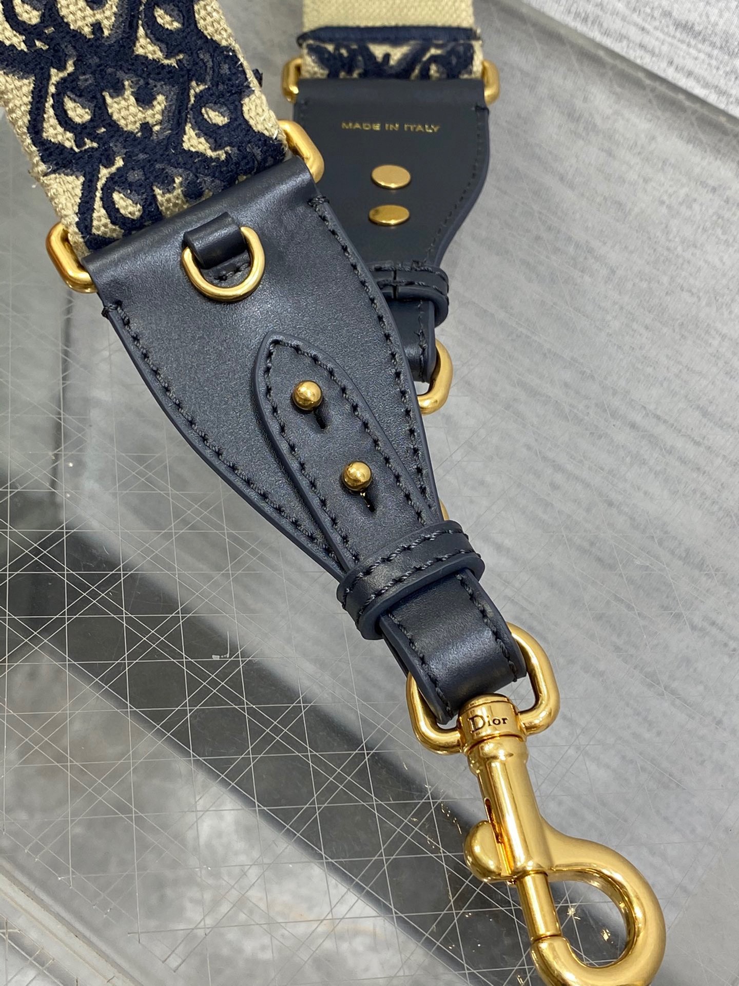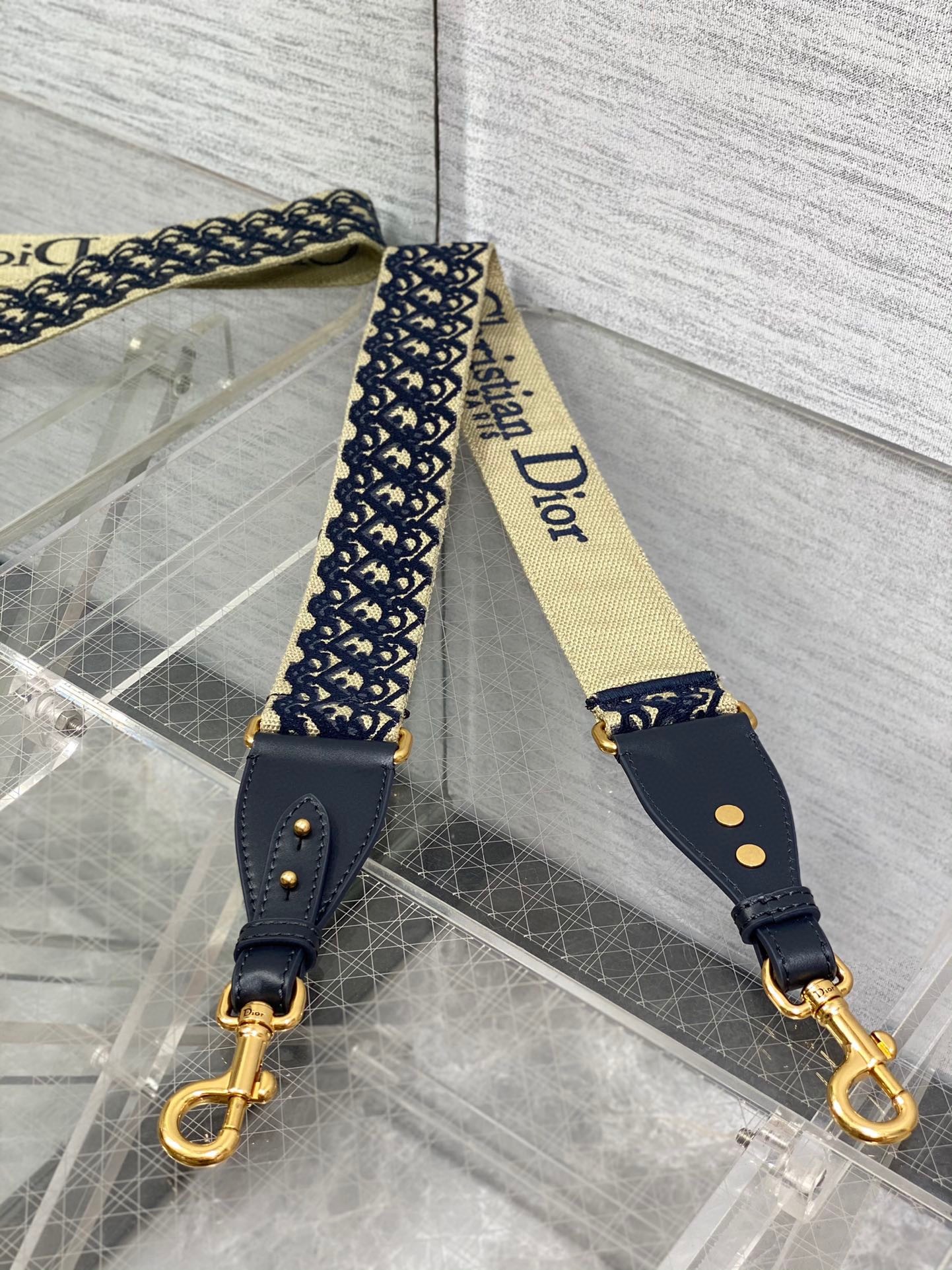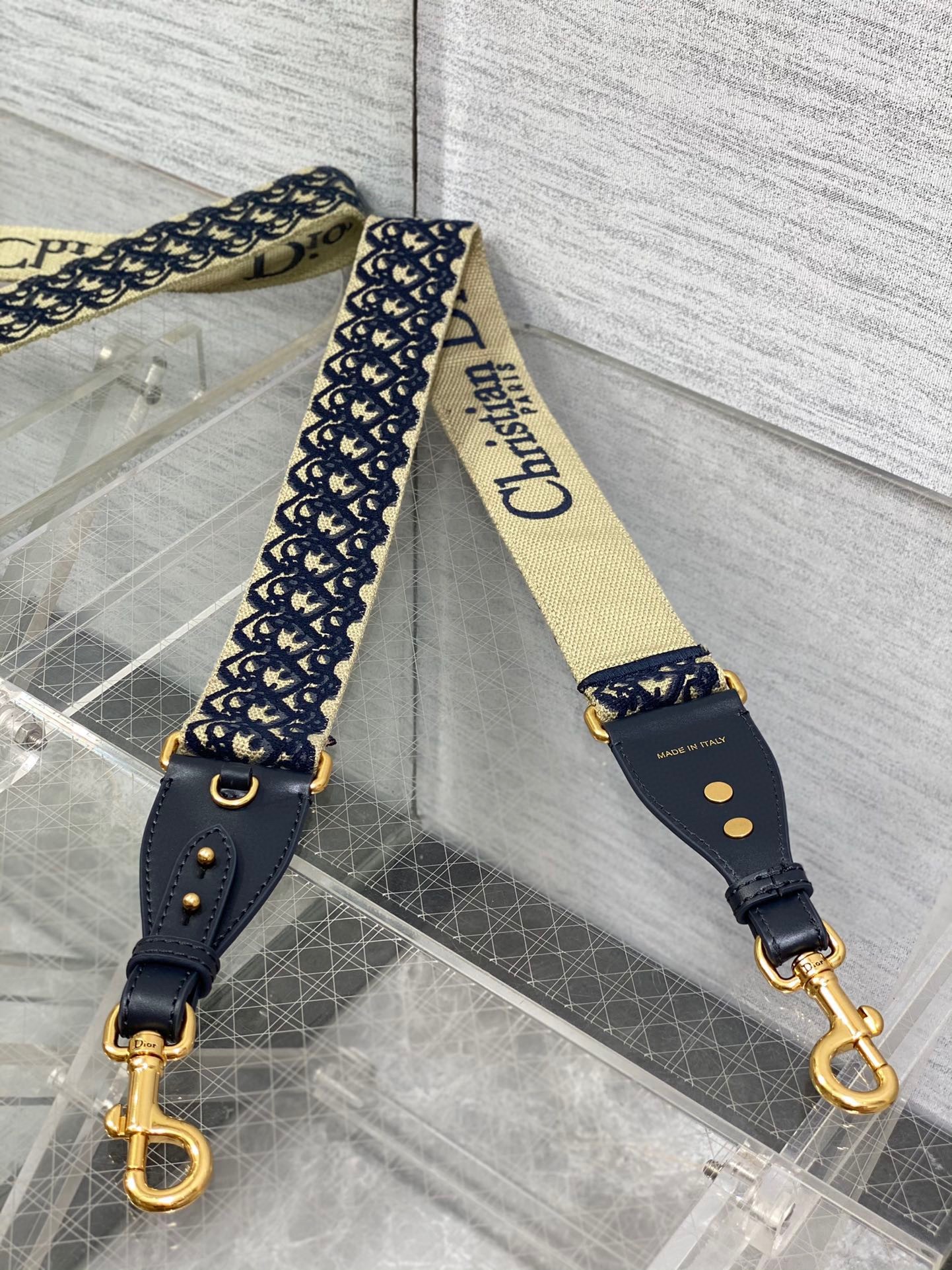 The embroidered shoulder strap is a unique accessory that allows the customization of certain House bags. The Dior Oblique motif adorns one side while the other is embroidered with the 'Christian Dior PARIS' signature and is further framed by calfskin on either side. Two antique gold-finish metal snap hooks attach the strap to the bag of choice, while the clever addition of a metal ring, a new feature this season, provides the option to carry small leather goods of the collection on the strap as well. The adjustable style may be worn over the shoulder or crossbody for a highly personalized look.