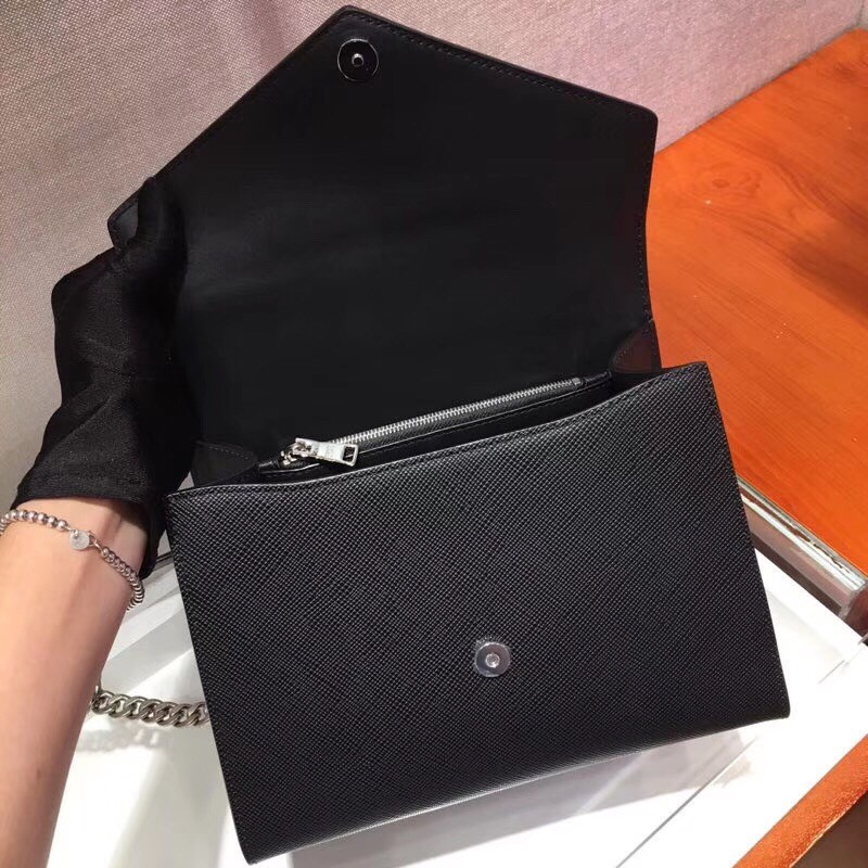 This trendy and sophisticated bag from Prada features sturdy black textured Saffiano leather with a bit of modern branding in matching matt black. The bag features a smooth leather top handle with the optional chain strap that can be worn on the shoulder. The interior is perfect for storing your girly essentials.