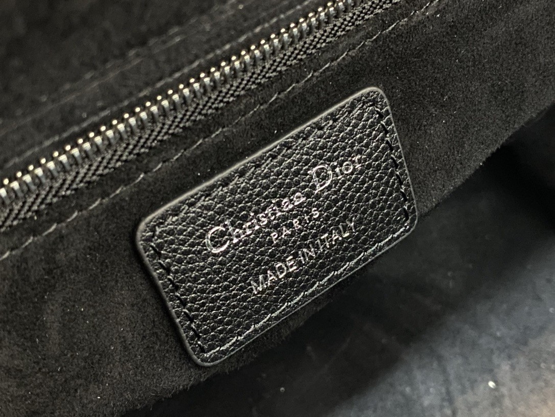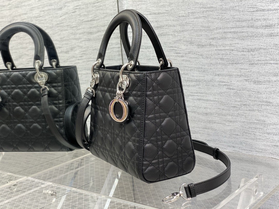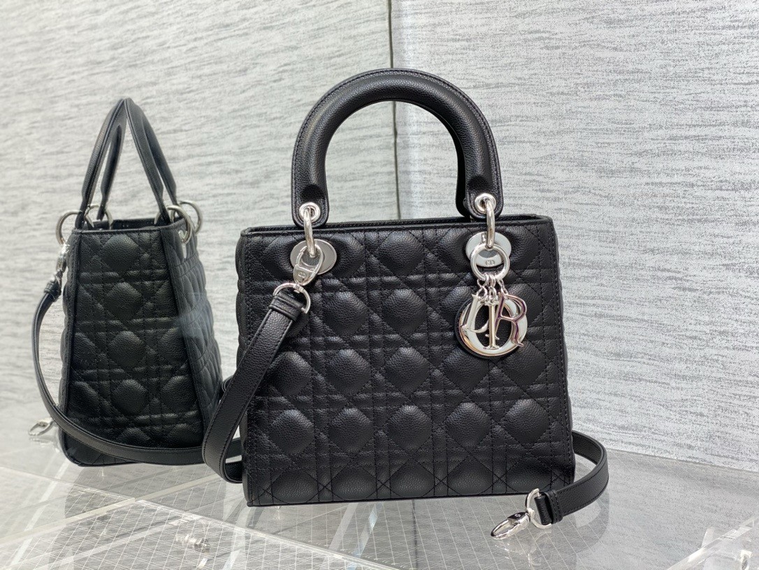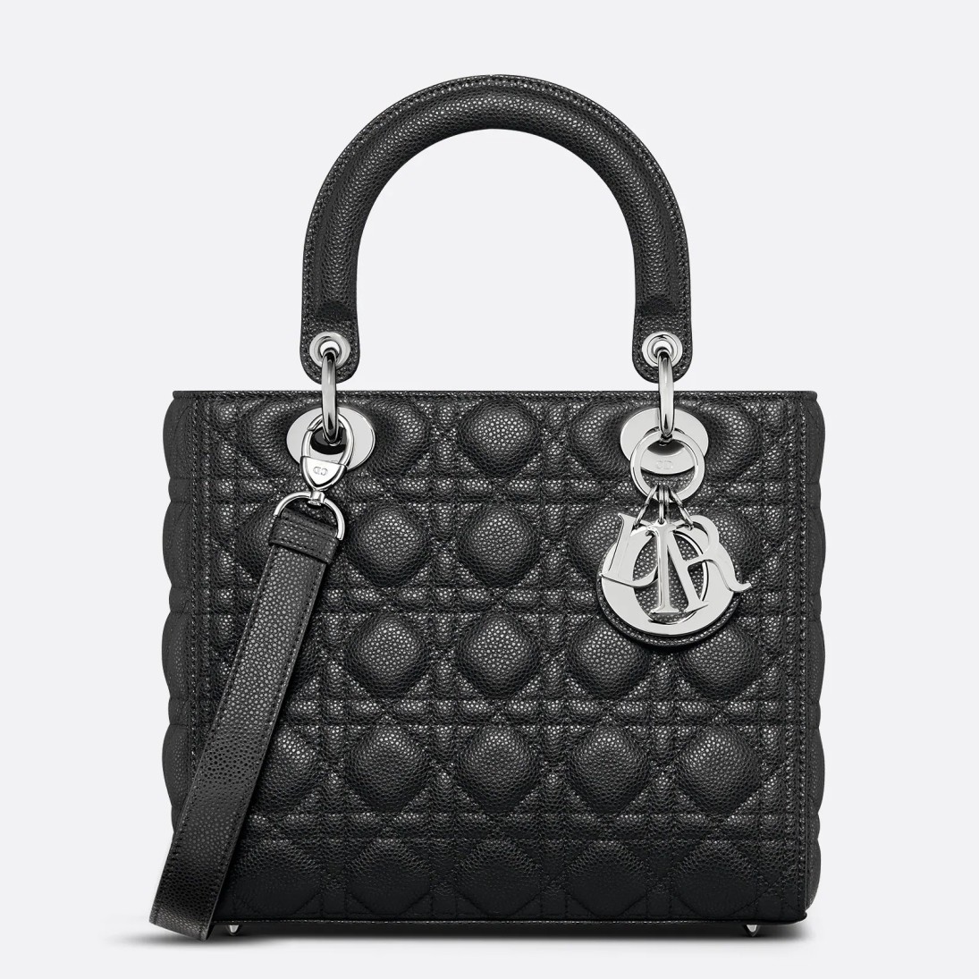 The season's Lady Dior bag embodies Dior's vision of elegance and beauty. The refined creation is timeless yet still very relevant. Crafted in grained calfskin with Cannage stitching, its supreme quilting instantly stands out while silver-finish metal D.I.O.R. charms offer a modern allure. Featuring a thin removable leather shoulder strap, the medium Lady Dior bag can be carried by hand or worn crossbody.