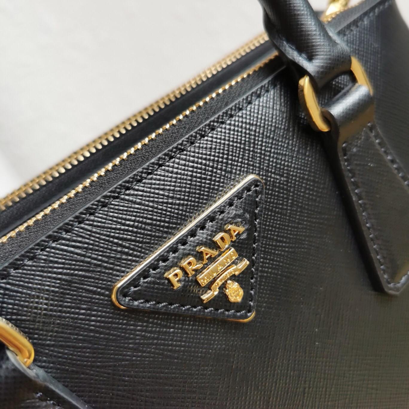The Prada Galleria bag, which exemplifies Prada's centennial excellence in luxury leather goods, becomes a reflection of the brand's modernity and stylistic identity that seeks to interpret kaleidoscopic contemporaneity through a pragmatic design and structured lines. The accessory, presented in the small version, is made of iconic Saffiano leather that was patented by the founder of the brand and features a crosshatch texture and waxed finish. The Prada Galleria bag, named after the historic Prada store opened by Mario Prada in 1913 in Galleria Vittorio Emanuele II in Milan, expresses the quintessence of the brand's timeless elegance.