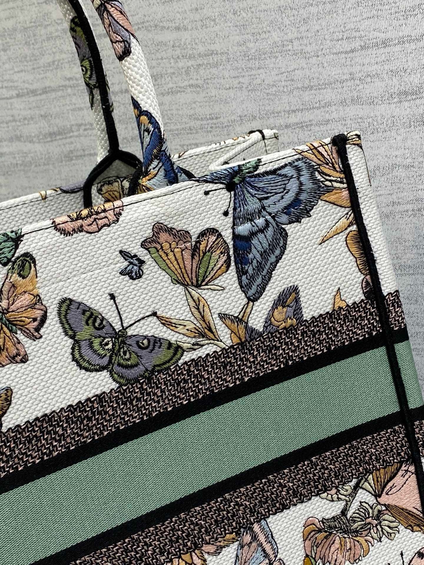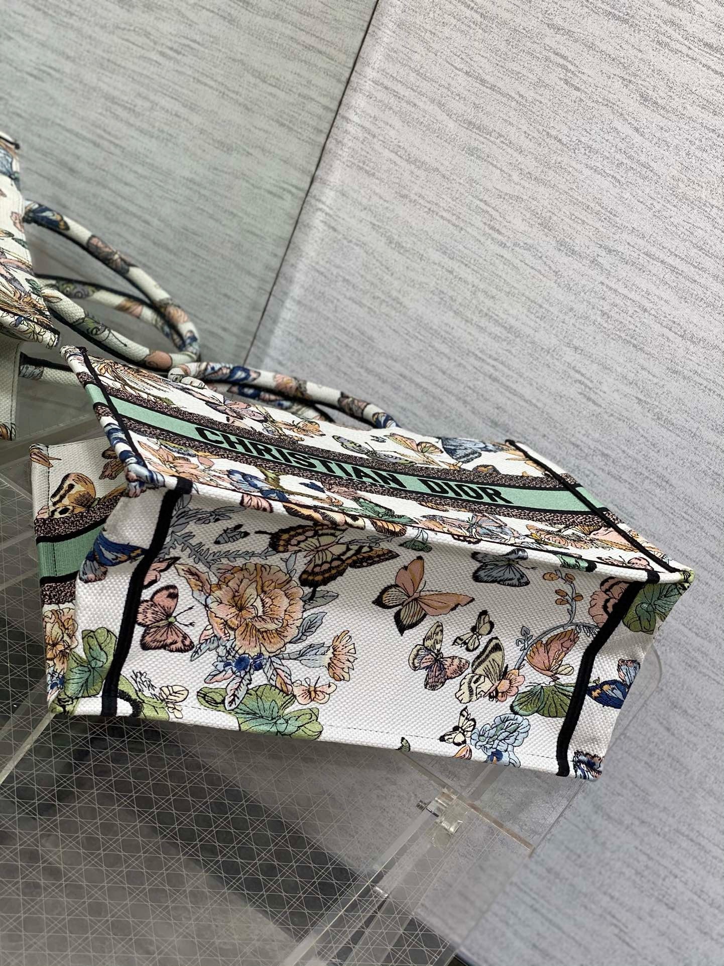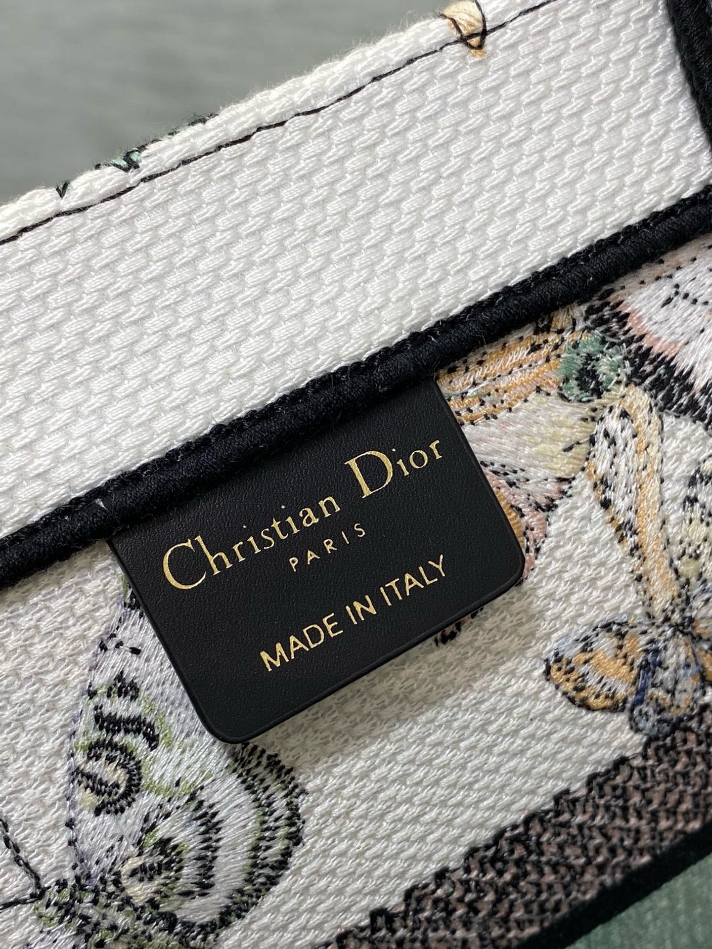 The Dior Book Tote is a House classic designed by Maria Grazia Chiuri, Creative Director of Christian Dior. Created to hold all the daily essentials, the style is fully embroidered with a white multicolor Toile de Jouy Mexico motif by Pietro Ruffo, showcasing butterflies and traditional Mexican flowers in a concert of colors. Adorned with the Christian Dior Paris signature on the front, the medium tote exemplifies the House's signature savoir-faire and may be carried by hand or worn over the shoulder.