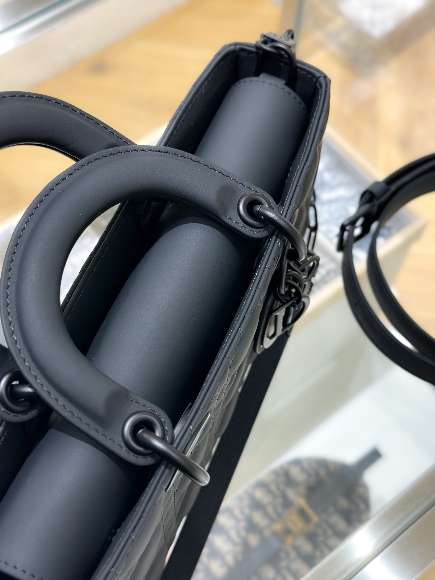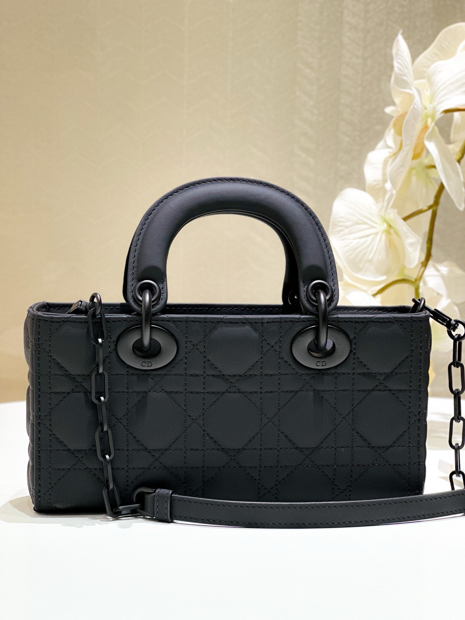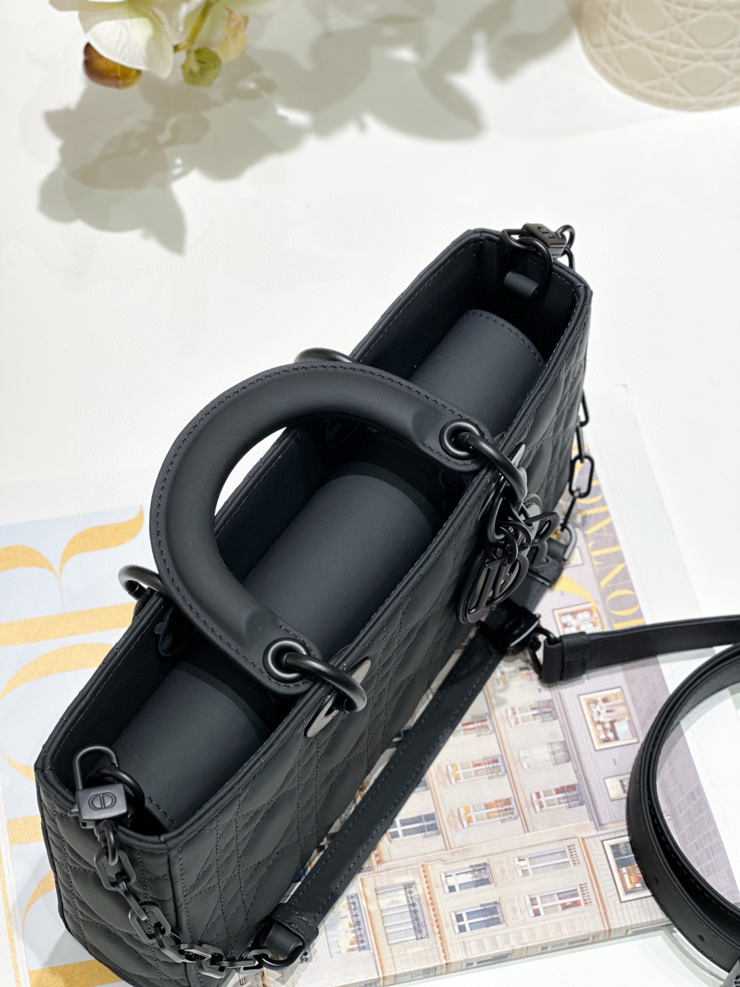 The Lady D-Joy bag captures the House's vision of elegance and beauty by showcasing the iconic streamlined aesthetic of the Lady Dior line. Crafted in ultramatte black calfskin with Cannage stitching, the legendary quilted texture is immediately recognizable. The style is enhanced by tonal metal D.I.O.R. charms that add an elegant touch. Featuring one removable chain strap and another adjustable and removable leather strap, the medium Lady D-Joy bag can be carried by hand, worn over the shoulder or crossbody as a daily companion.