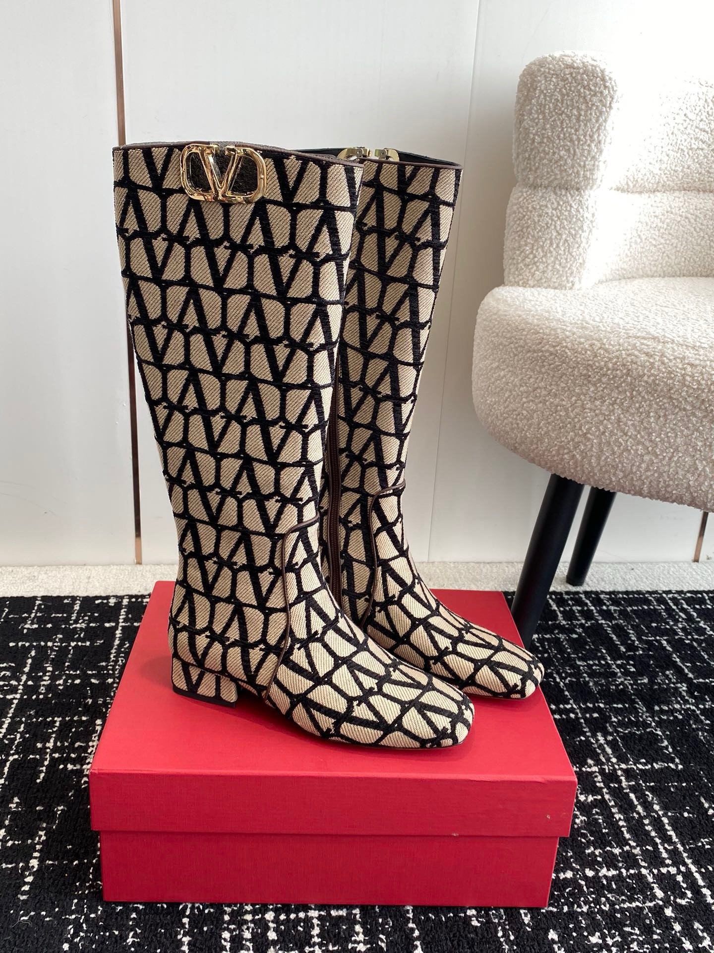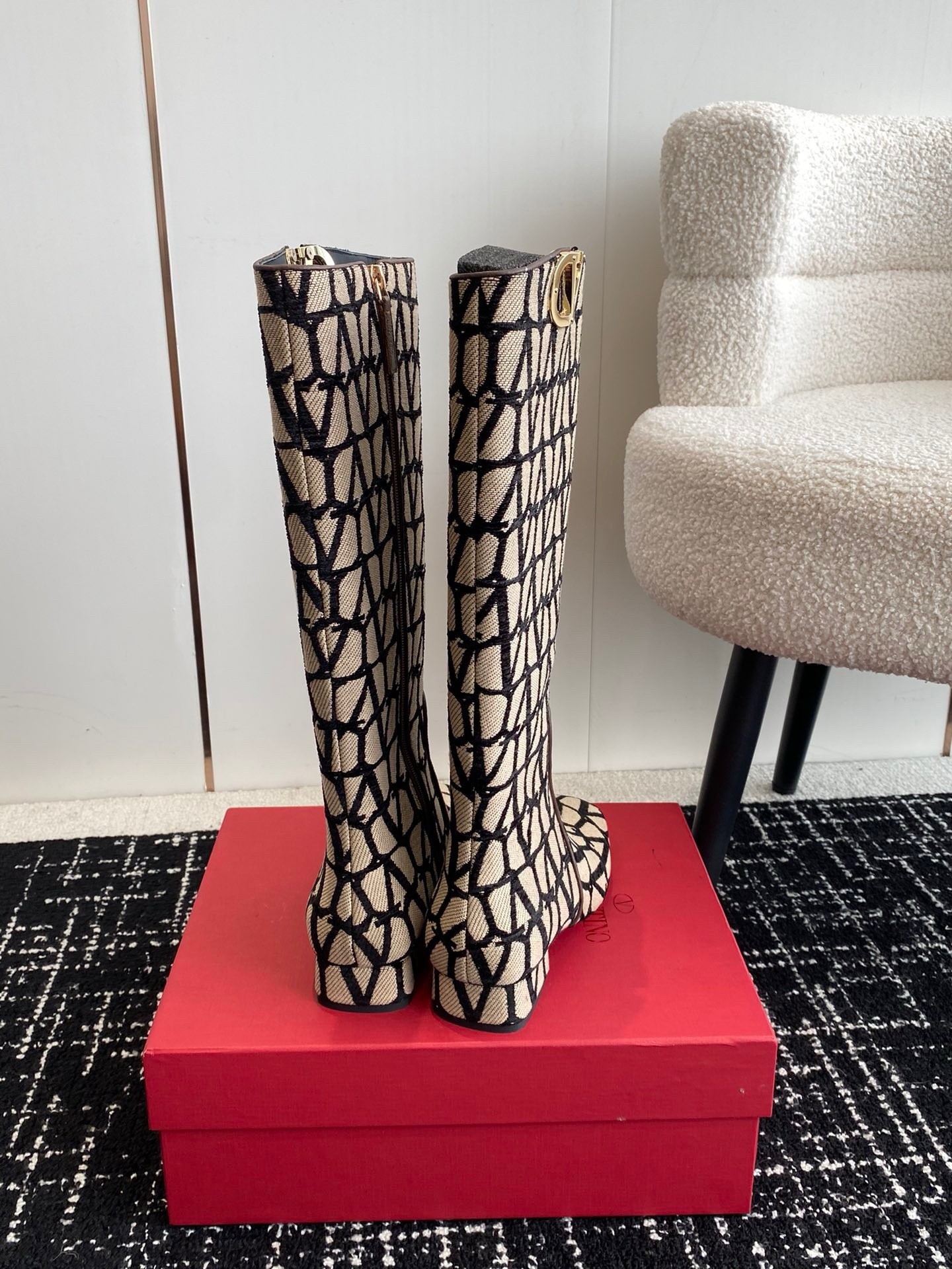 Valentino Garavani's knee boots are covered in the brand's signature 'VLOGO' - it's jacquard woven throughout and featured as a plaque along the leather-trimmed cuffs. This pair is made from Toile Iconographe fabric and has square toes and comfortable 30mm block heels.