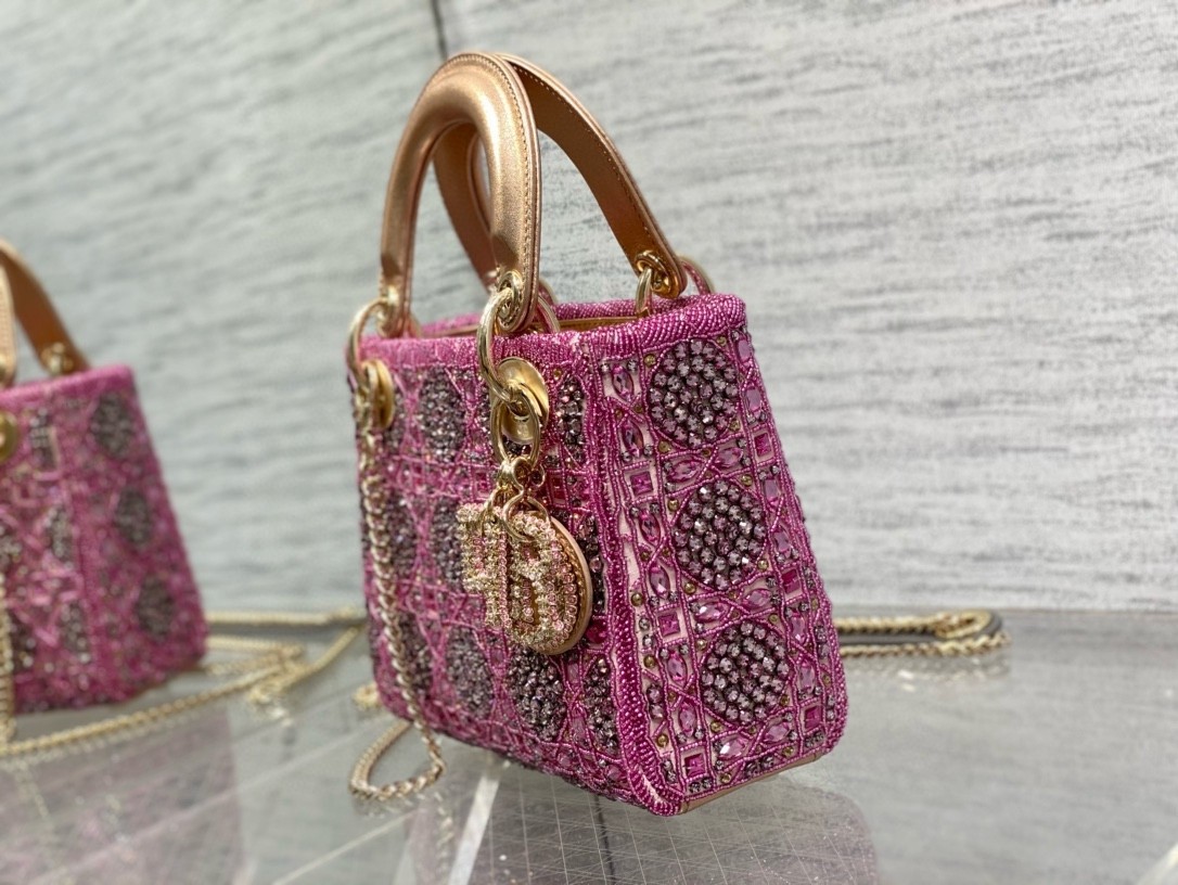 The Lady Dior bag epitomizes Dior's vision of elegance and beauty. It demonstrates the House's unique leather craftsmanship and is offered in Rose des Vents satin, embroidered with a multitude of resin pearls in a hallmark Cannage-motif design, while the handles are crafted in tonal metallic calfskin. The pale gold-finish metal D.I.O.R. charms are adorned with white crystals and further embellish its silhouette. The miniature style, with its removable chain shoulder strap, can be carried by hand or worn crossbody and will be the ideal evening wear companion.