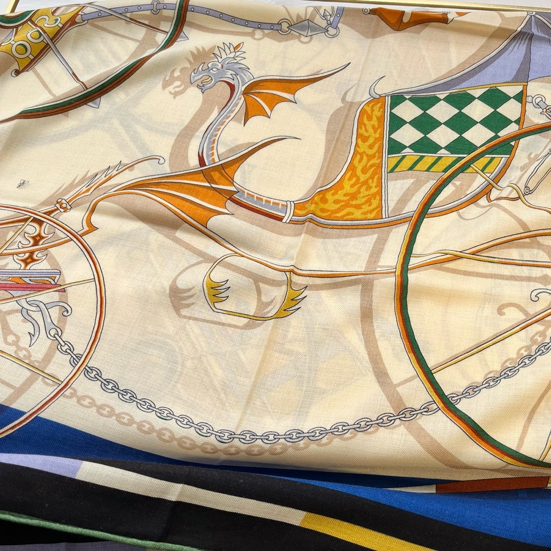 You've not lived until you've experienced the luxury of Daiske Nomura's carriages. Even the horses watch them go by, a little envious that their friends get to pull such treasures... since these coaches are undeniably a cut about the rest. Graceful and glorious, they show off their best side, forging ahead in straight lines with the agility of a tightrope walker and the strength of a dragon. They come together wonderfully on this scarf, like a well-oiled machine. It's an undeniable fact that these Daiskemobiles turn heads.
