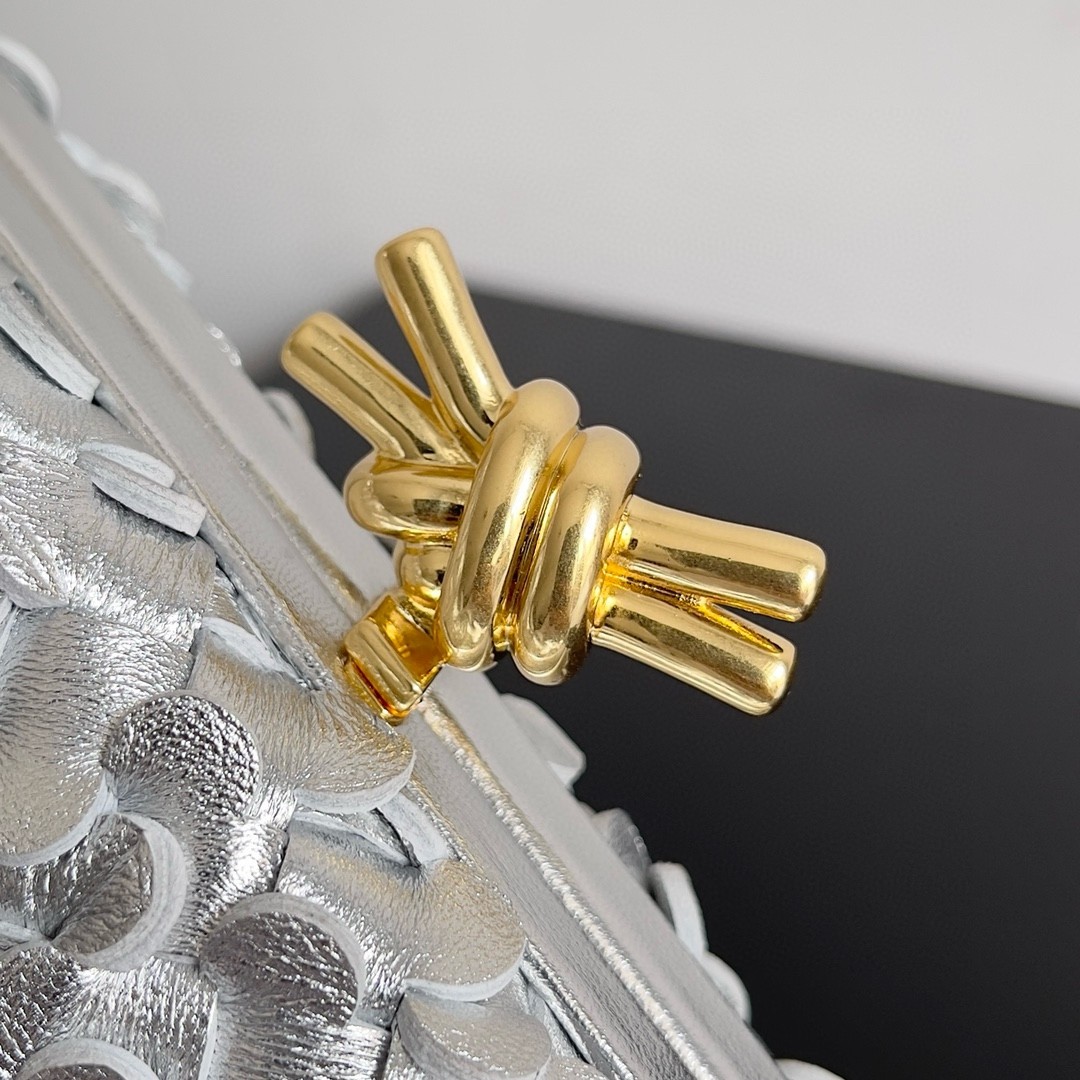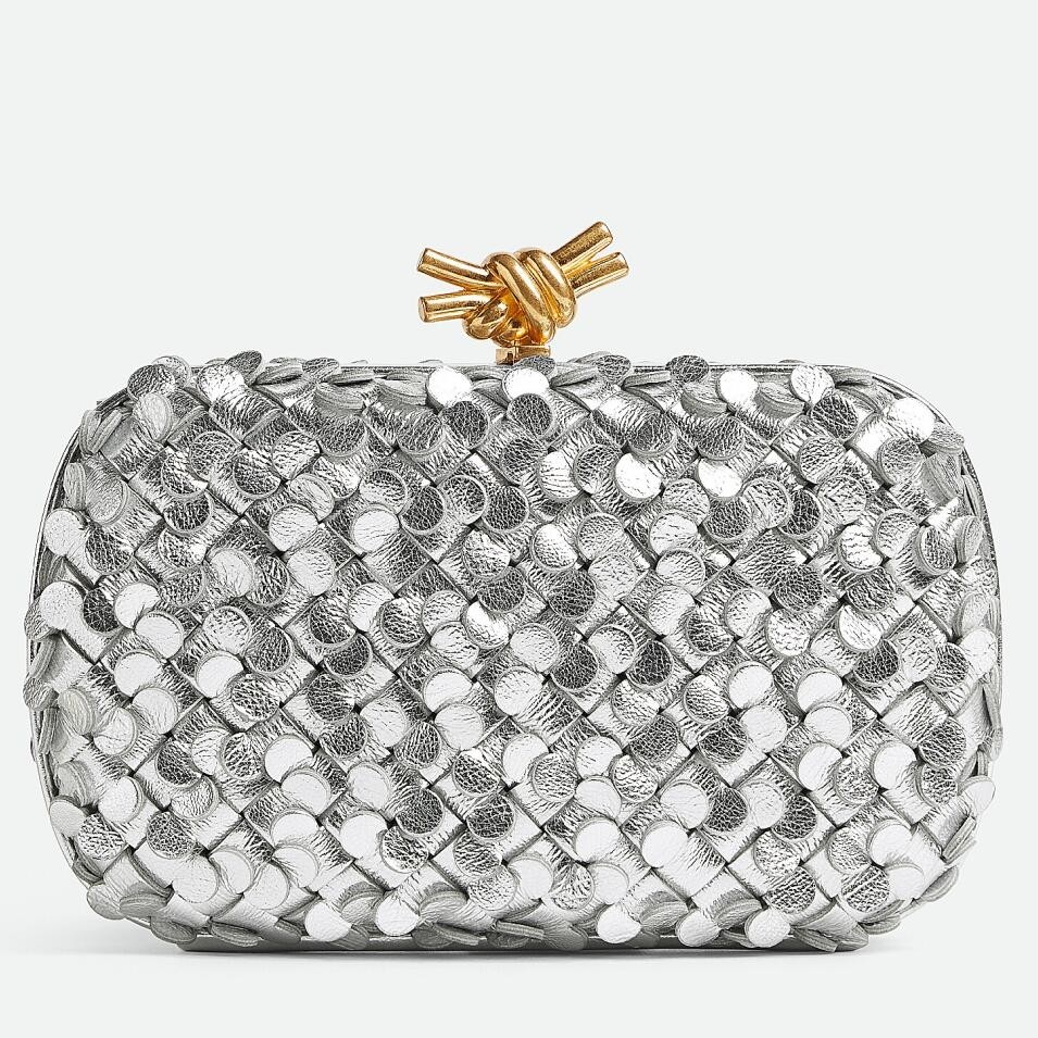 Artful expression and Italian craftsmanship combine to create Bottega Veneta's unmistakable signatures. New to the roster of covetable styles, this 'Knot' clutch has been crafted from gleaming metallic leather interspersed with textured, curved tabs. The clasp fastening is sculpted into the twisted shape it's named after.
