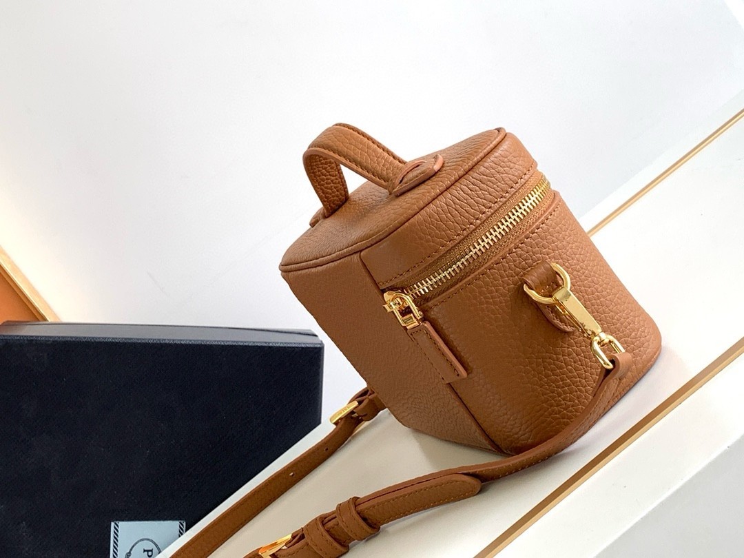 The Prada Vanity case in grained leather fits easily into a travel bag or suitcase. Supple, compact, with a leather handle that flattens to save space, it offers good capacity for toiletries and grooming essentials. The top flap opens wide for optimal visibility, thanks to a zip closure, metal logo and the detachable, adjustable shoulder strap.