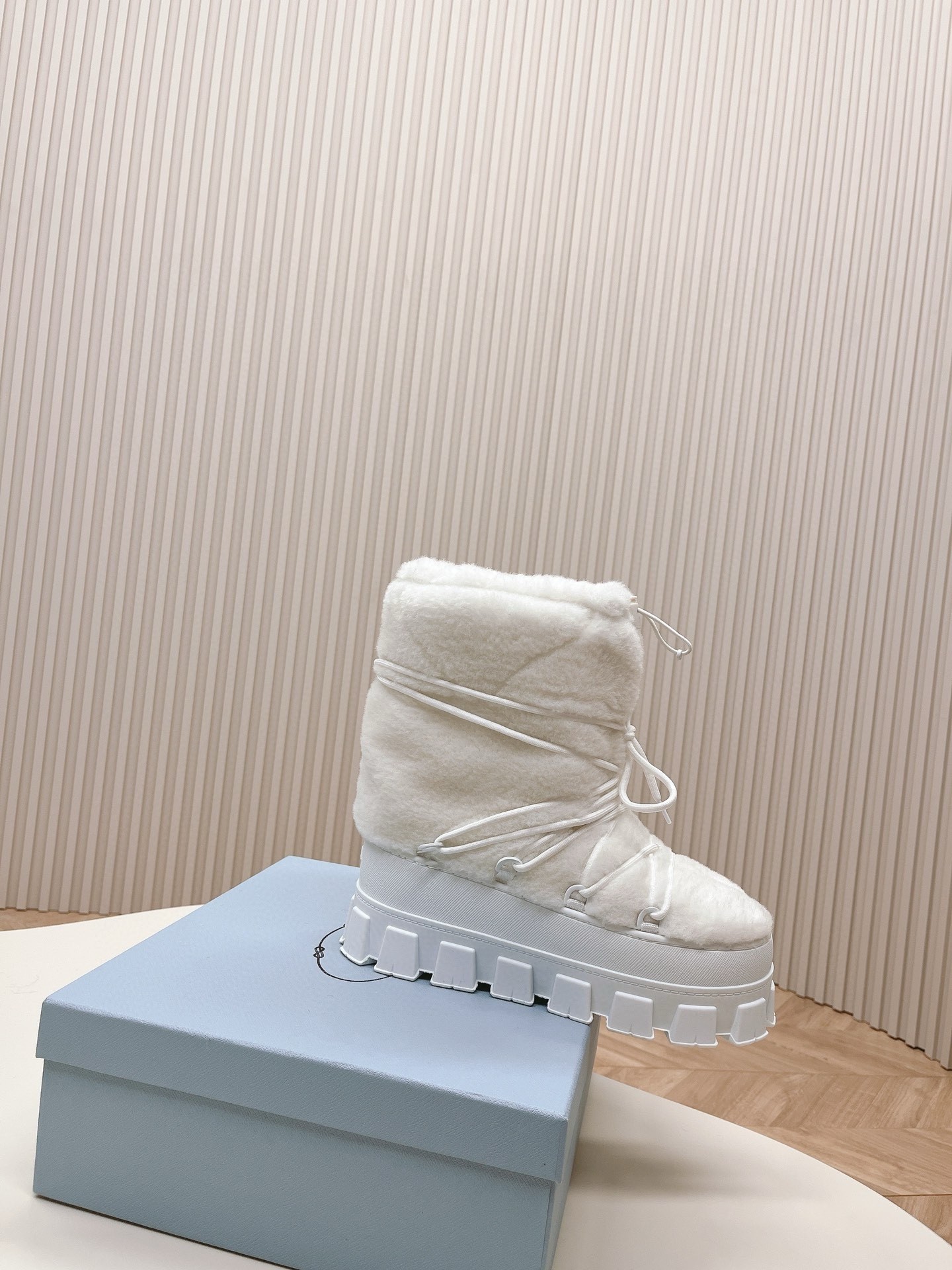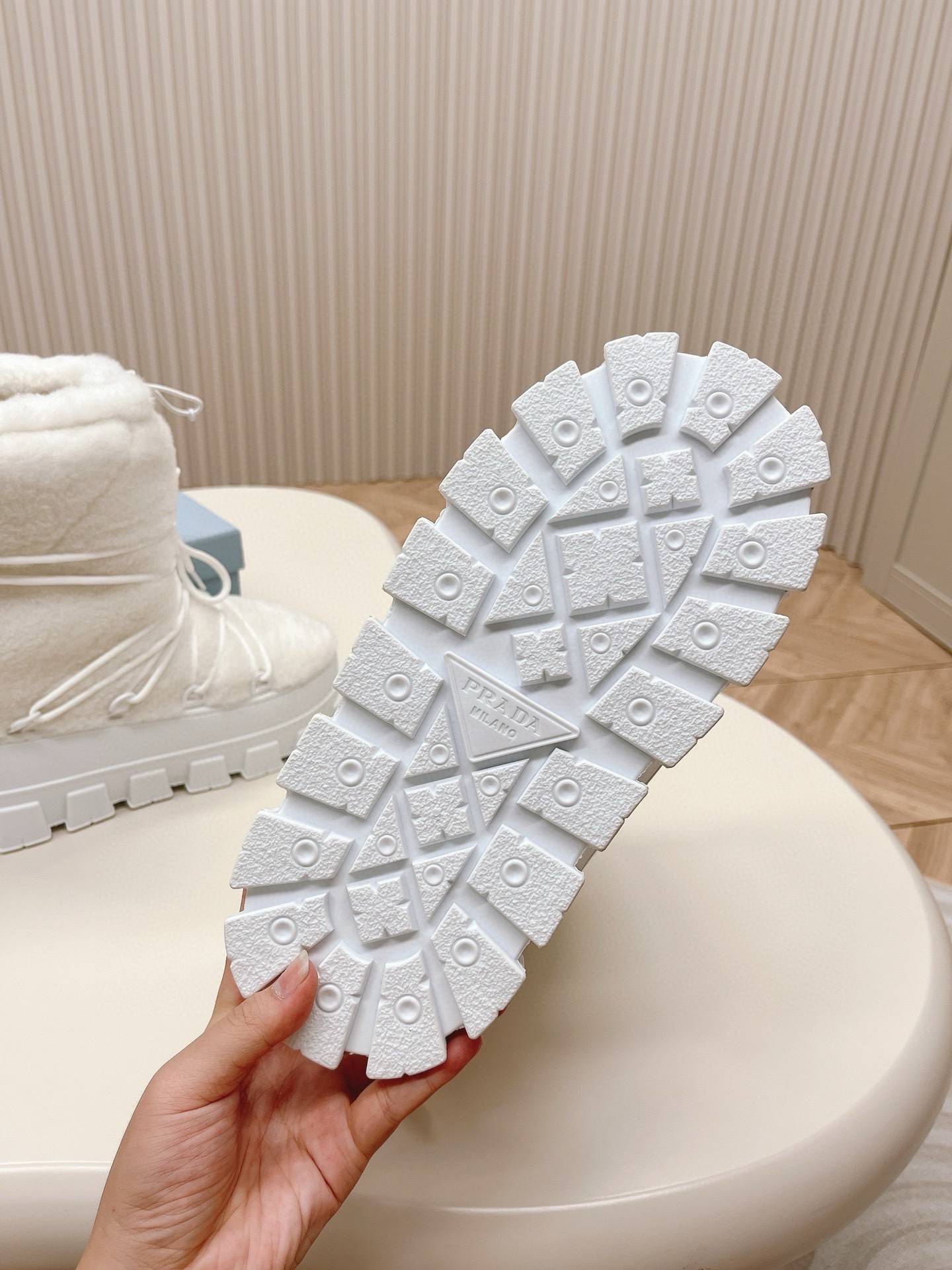 These shearling after-ski boots with a soft touch are characterized by their sporty yet refined allure. Lined with removable padded fleece, the boot is completed by the technical drawstring closure and lug tread. The enameled metal triangle logo decorates the accessory.