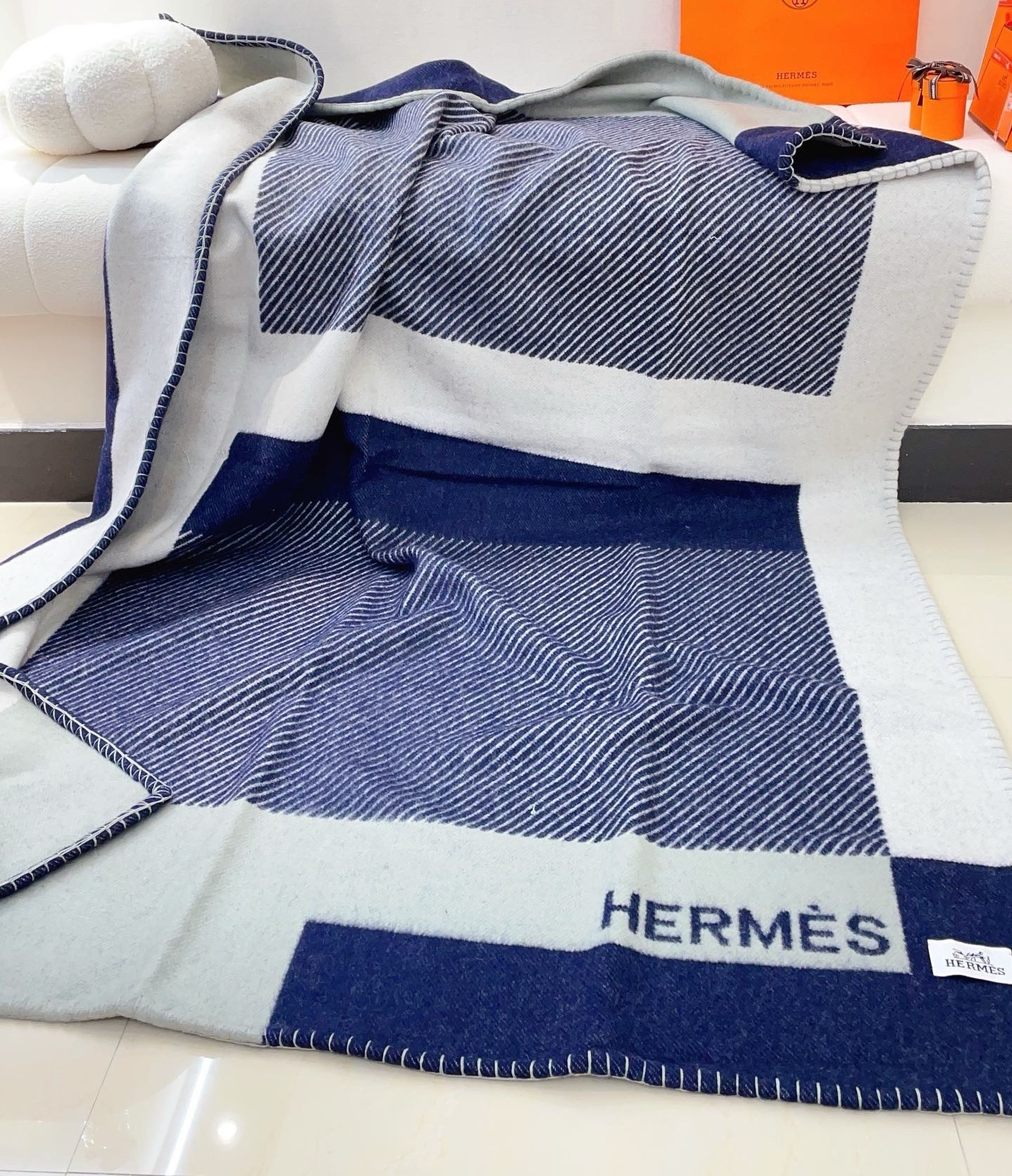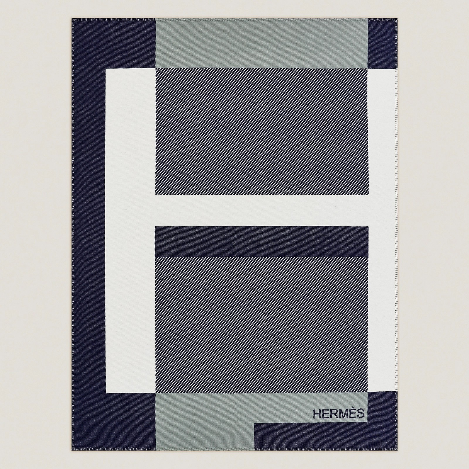 The design of these plaids and cushions was created by Studio Hermès, and inspired by an Hermès advertising visual that first appeared in the May 1929 issue of Vogue to present travel accessories. This extremely graphic, shaded H has been retained from the original visual in intense and bold color variations. Its name H Riviera subtly evokes the emergence of sunbathing in the 1930s.