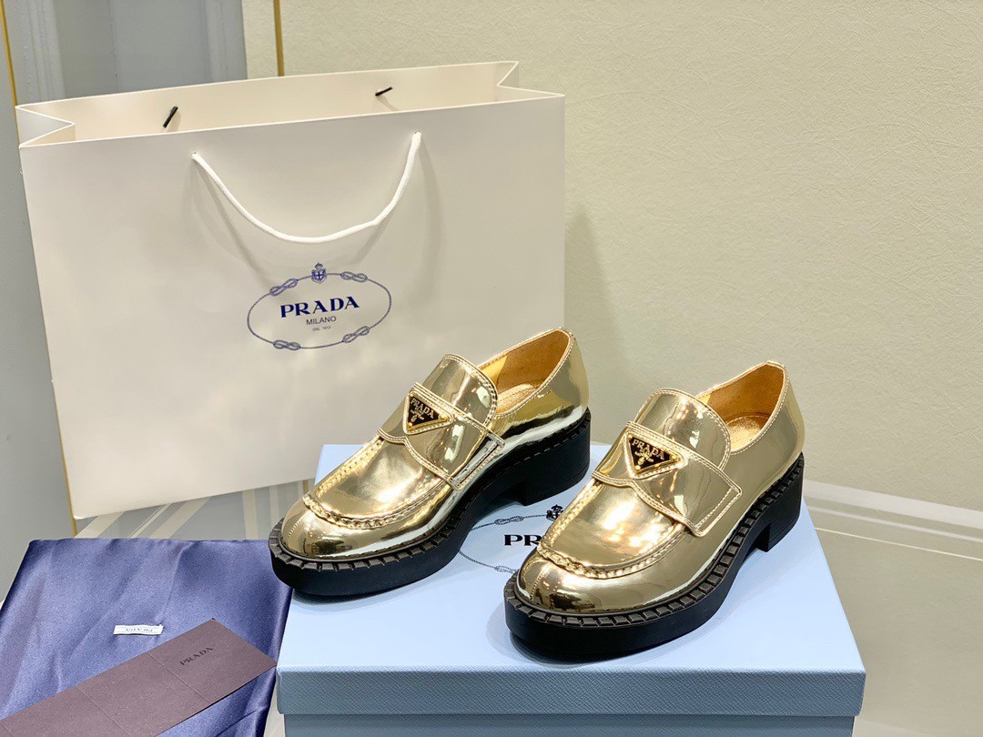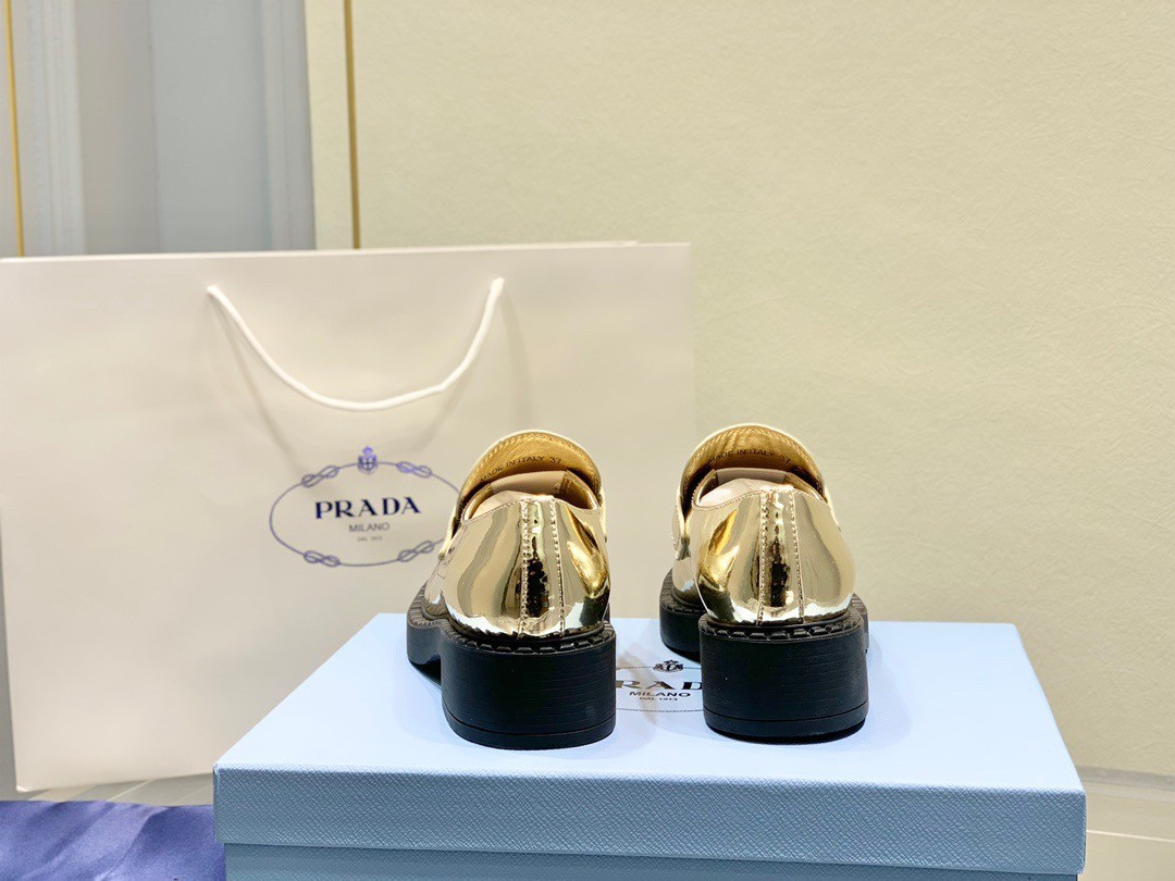 These loafers with a pronounced toe reimagine the classic penny loafer with a thick rubber sole for a modern look and are decorated with the enameled metal triangle logo. Metallic leather adds a bold touch to this contemporary design.