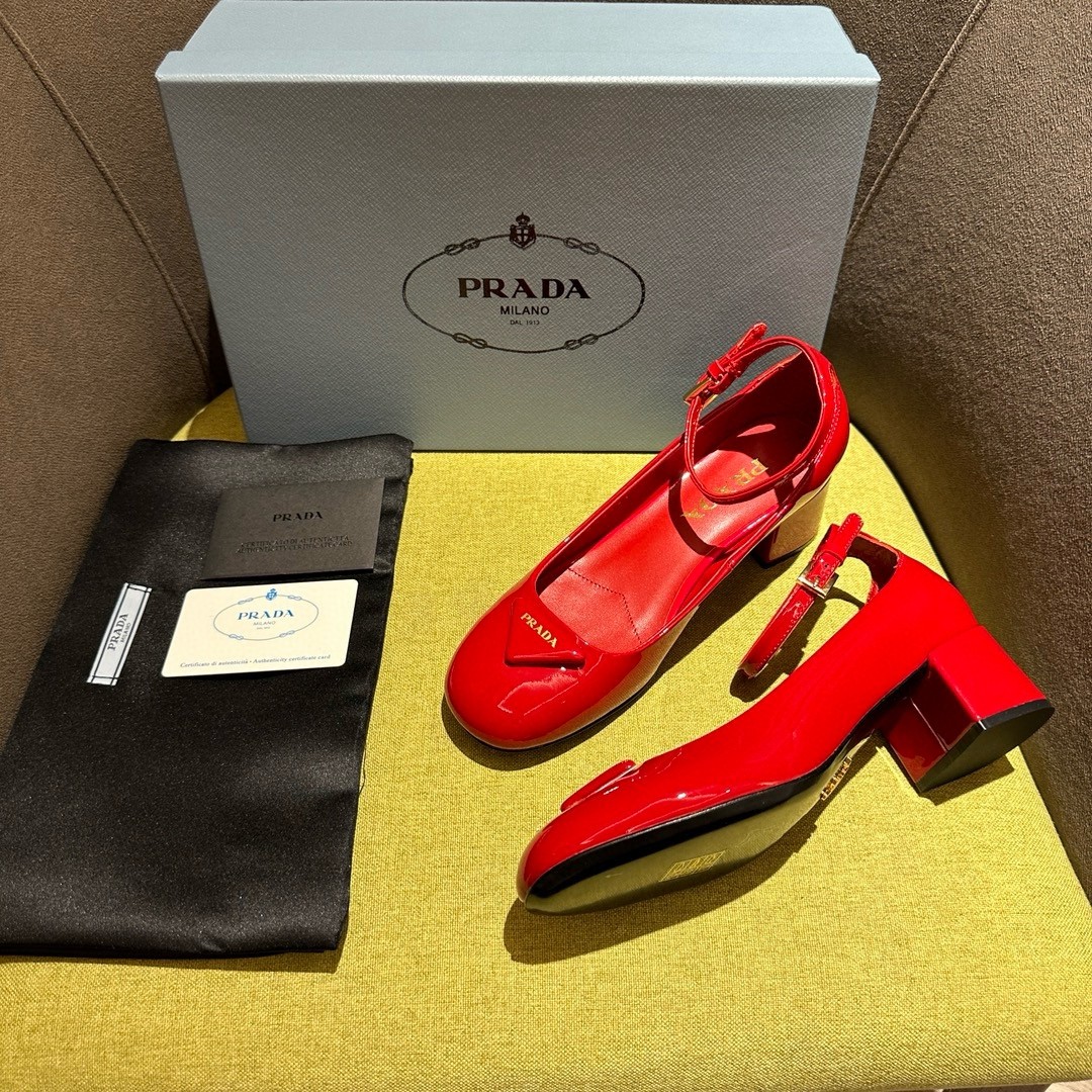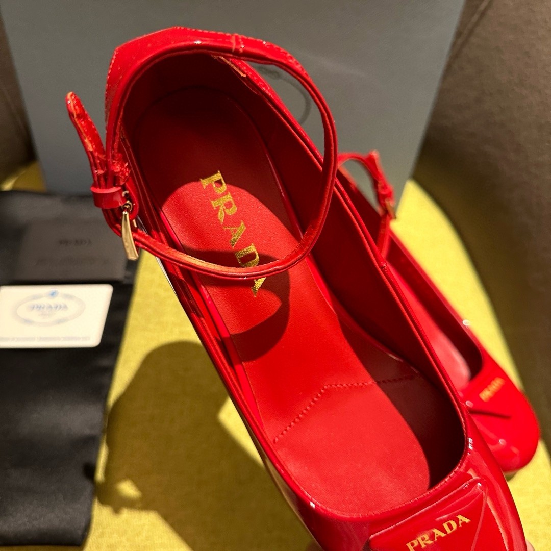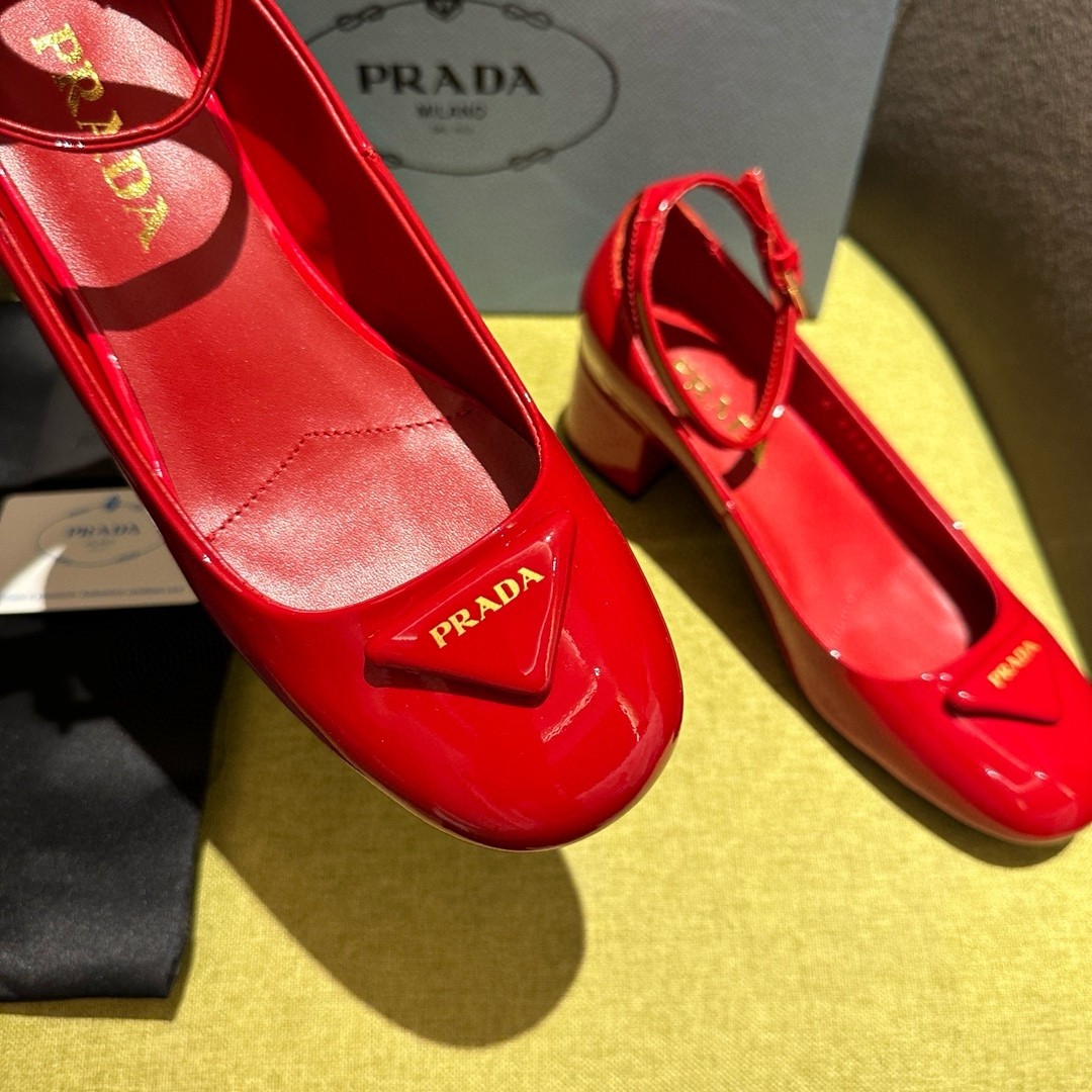 The feminine design of these sophisticated pumps is embellished by the glossy finish of patent leather that introduces a contemporary touch to the timeless silhouette. The enameled metal triangle logo completes the shoe with its iconic signature.