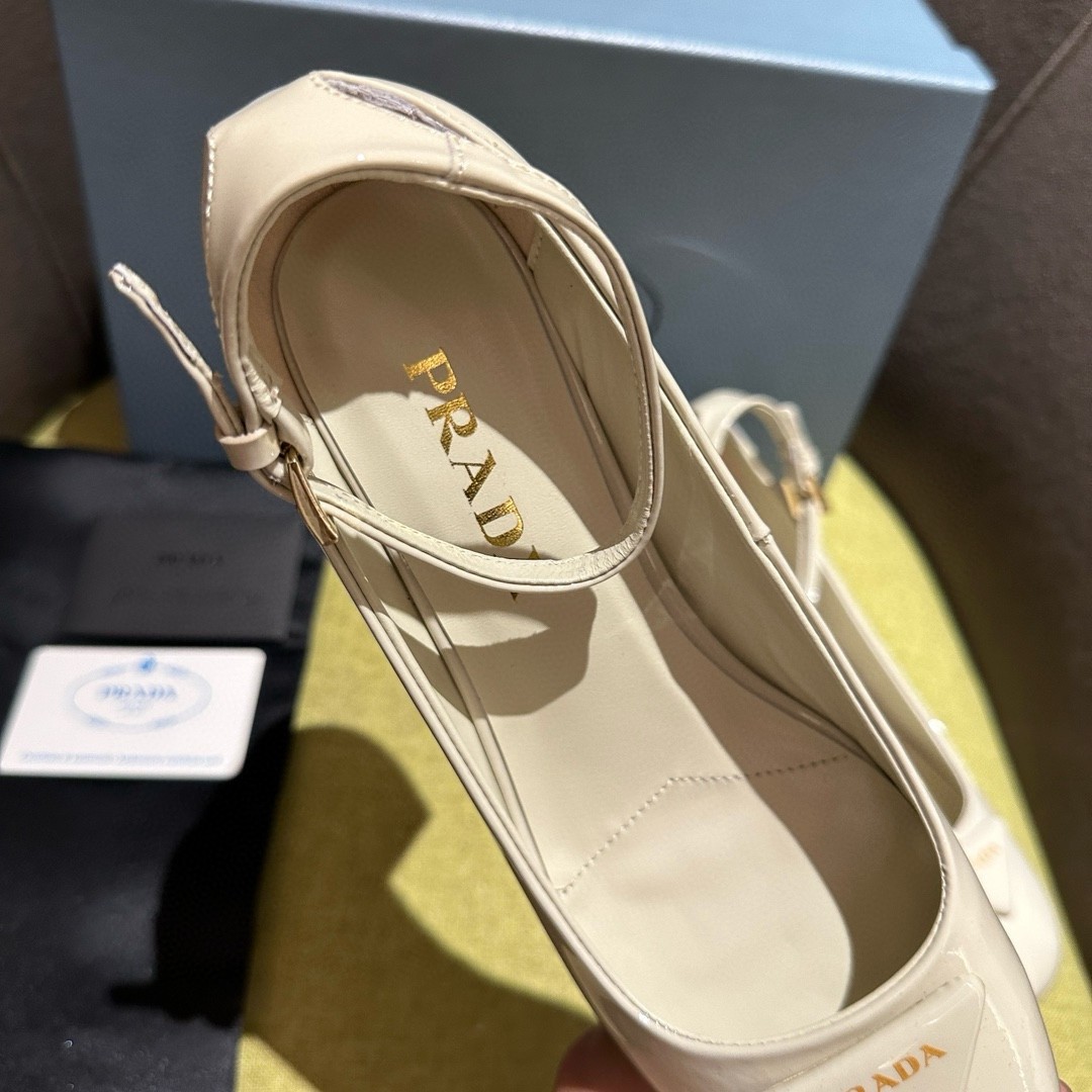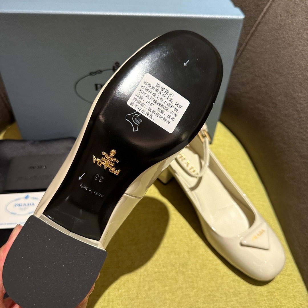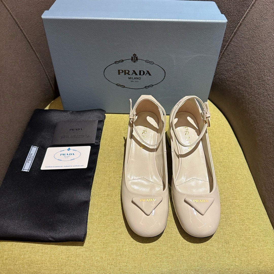 The feminine design of these sophisticated pumps is embellished by the glossy finish of patent leather that introduces a contemporary touch to the timeless silhouette. The enameled metal triangle logo completes the shoe with its iconic signature.