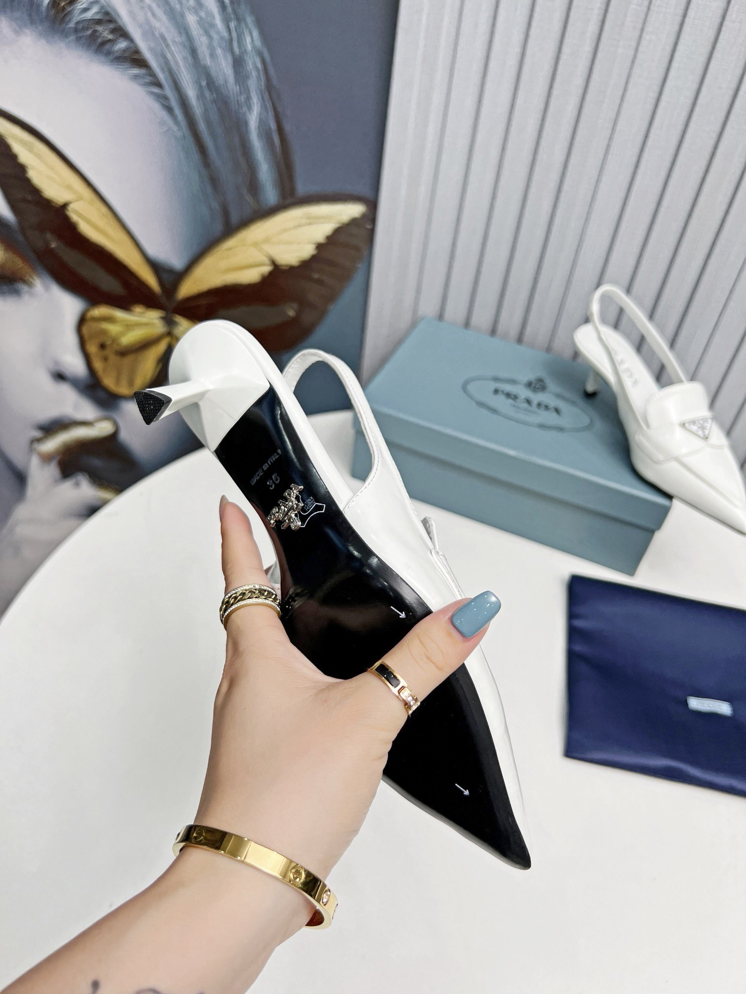 A motif which first appeared in 1913 on trunks designed by Mario Prada. These tapered, sinuous patent leather slingbacks with masculine touches are embellished with the iconic enameled metal triangle logo that stands out on the upper.